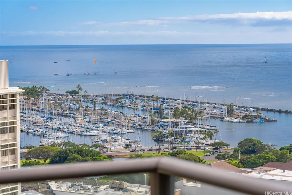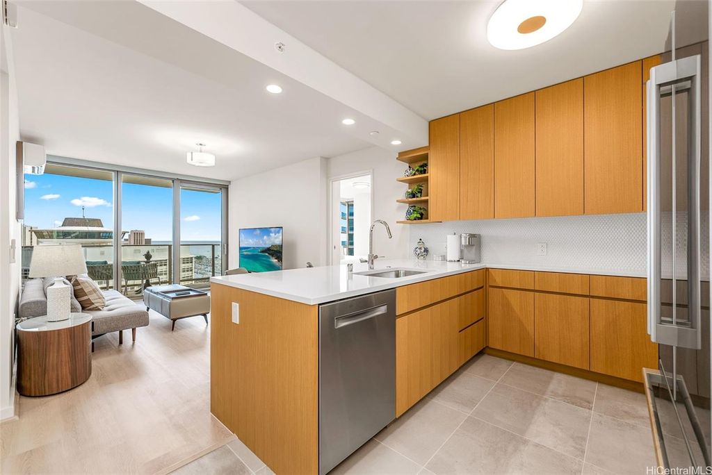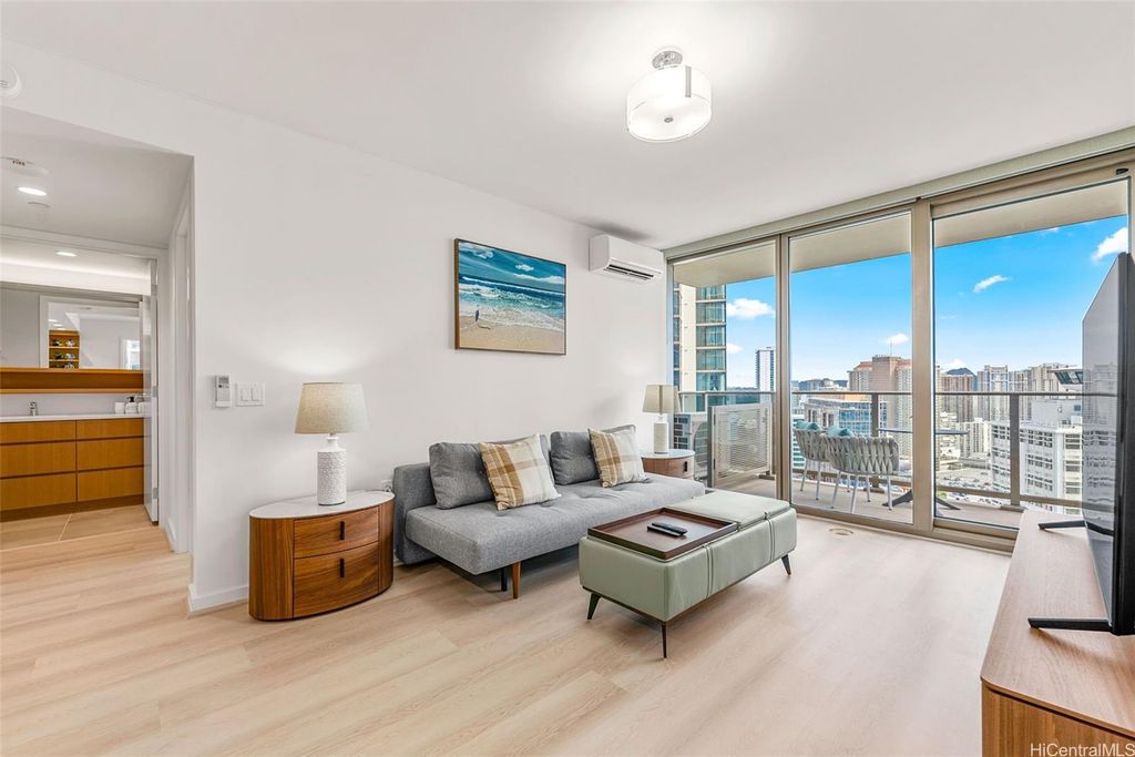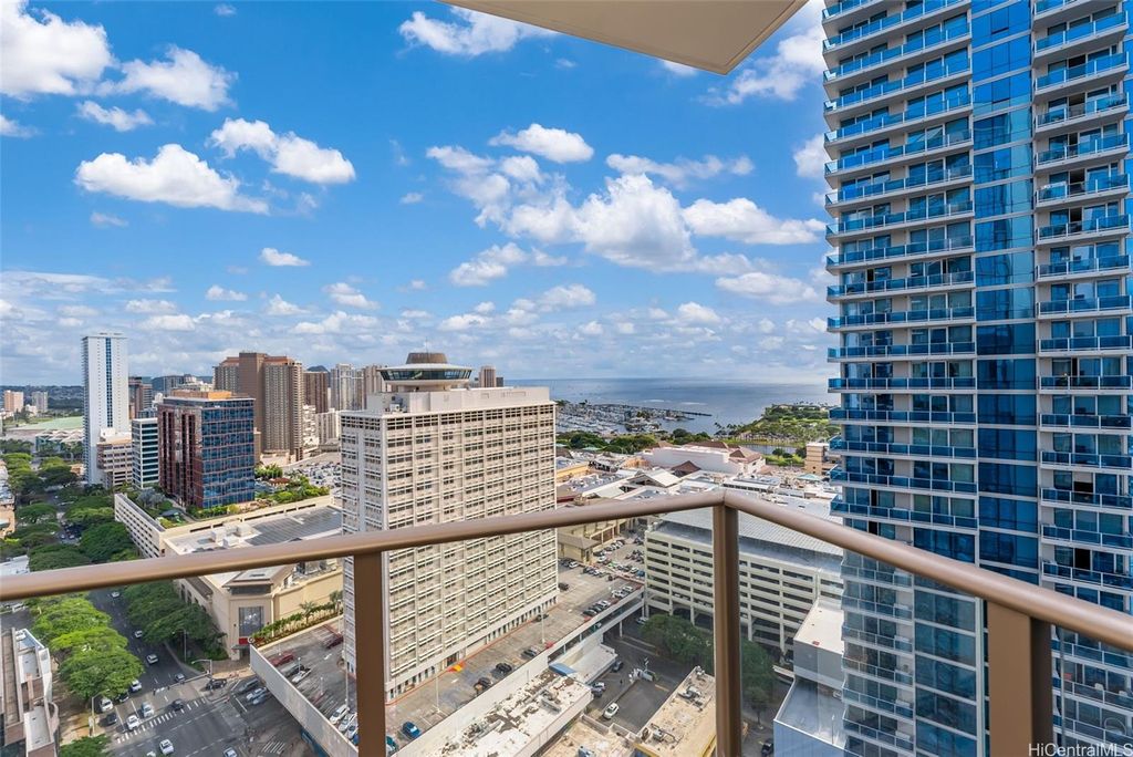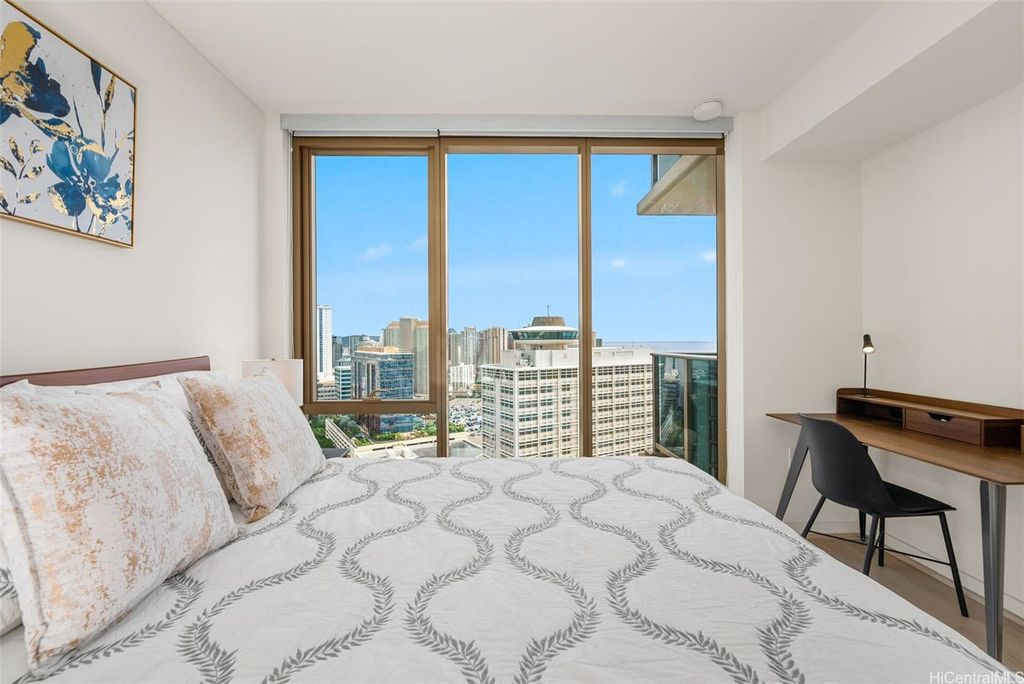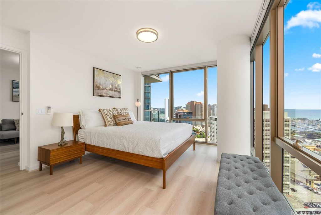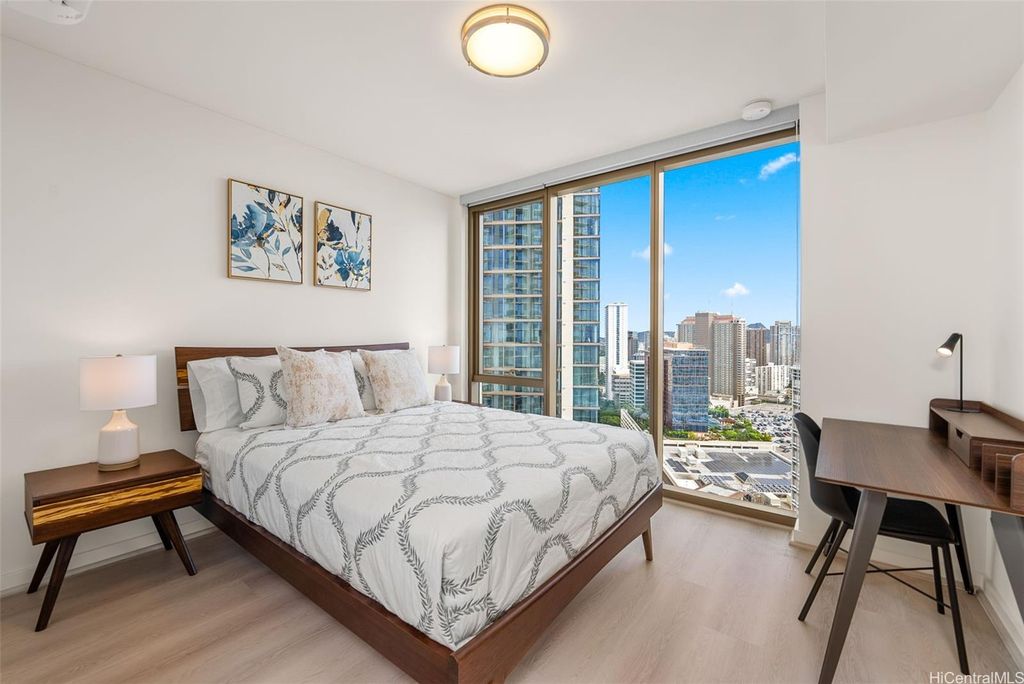 Situated on the 30th floor, boasting two bedrooms, two baths, and two parking spots. This beautiful 2BR/2BA residence offers a polished living space adorned with tasteful accents, creating an inviting atmosphere for both relaxation and entertainment. The unit features a fully equipped kitchen with modern appliances and elegant quartz countertops, striking the perfect balance between functionality and style. The bedrooms exude luxury with a plush bed, split-mounted AC, ample closet space, and a touch of classic opulence for a truly restful night's sleep. Relaxing ocean & Magic Island view can be seen from both bedrooms. The full bathroom is adorned with high-quality finishes, reflecting the refined taste that defines the overall design. Convenience is at your fingertips with an in-unit washer/dryer combo. Step out onto the private balcony to take in sunrise and sunset views from the lanai, making this rental a perfect fusion of modern sophistication and timeless charm. Amenities include a pool, gym and so much more! Non-refundable application fee is $39 per applicant, 18 yrs. and older. No pets. No smoking. Renter's insurance is required.