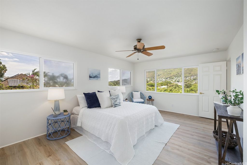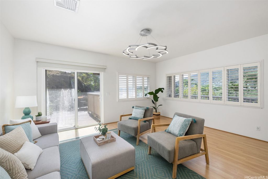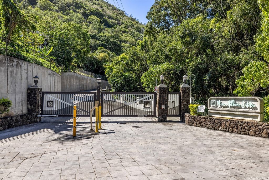 Sophistication and privacy are yours in Manoa's only single-family gated community, Manoa Hillside Estates. Built in 2000, this custom home offers a spacious layout with 4 bedrooms and 3.5 baths, perfect for both relaxation and entertaining. Open-concept design features a modern kitchen and dining area that showcase stunning views of lush Manoa Valley. The first floor includes a spacious ensuite bedroom, ideal for guests or multi-generational living. A community playground and recreation center are located across the street. Newly painted exterior, plantation shutters, and central air conditioning. Relax in serene privacy, beautiful sunsets, and mountain views from your private deck with majestic city and green lush valley views. Located less than a mile away from Manoa Marketplace and minutes from UH Manoa, Chaminade University, top schools, and premier shopping and dining.