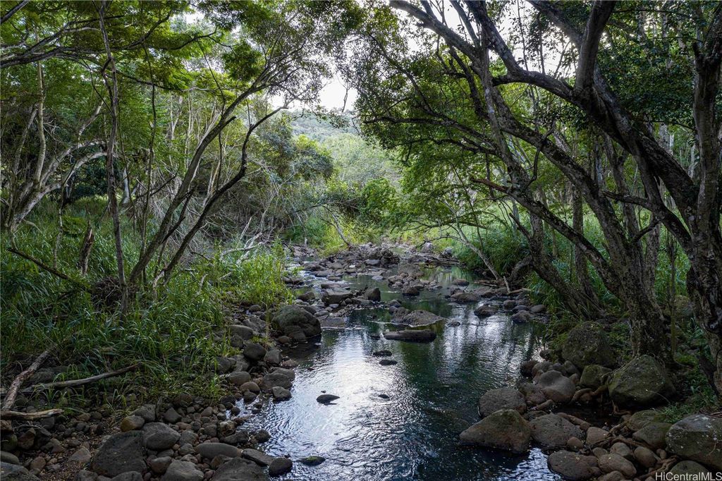 1.6 acres of Anahulu Stream Front land which allows 1 farm home up to 5,000 sqft on the 1st floor and can do a second floor. Can also build supporting barns and AG structures. Can build up to a maximum of 1,000 sqft AG structures without a permit for fast use. Perfect for grazing or farming. Direct stream front for prawn fishing and fun. Paddleboard or kayak from the river located near the property to Haleiwa Harbor and Beach Park for fun in the sun. Additional lots are available if you need more space. Visitors say this is one of the most beautiful pieces of land they have seen in rural Oahu and is the best-kept secret on the North Shore. Perfect for a family compound, farm, or yoga retreat. Build a yurt or 1,000 sqft footprint AG structure with a second floor today and enjoy the land while you design and build your custom farm dwelling. A ten-minute bike ride to the center of Haleiwa town. Easy access to Kam Hwy and no north shore traffic. A magical place in the Anahulu Valley. Price includes future electrical and freshwater access if and when approved and completed (special terms apply).