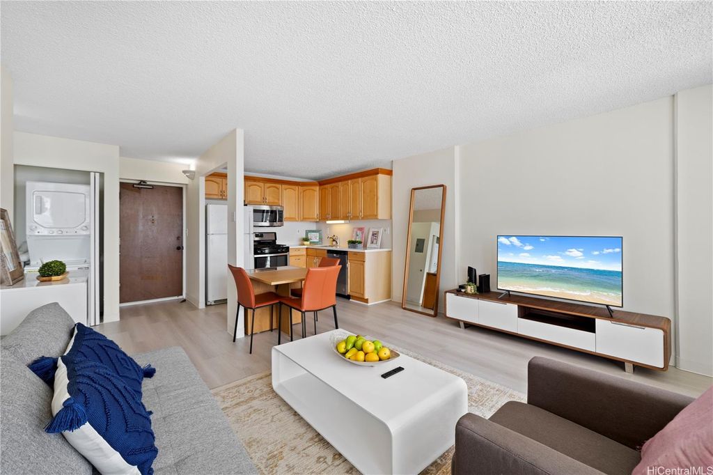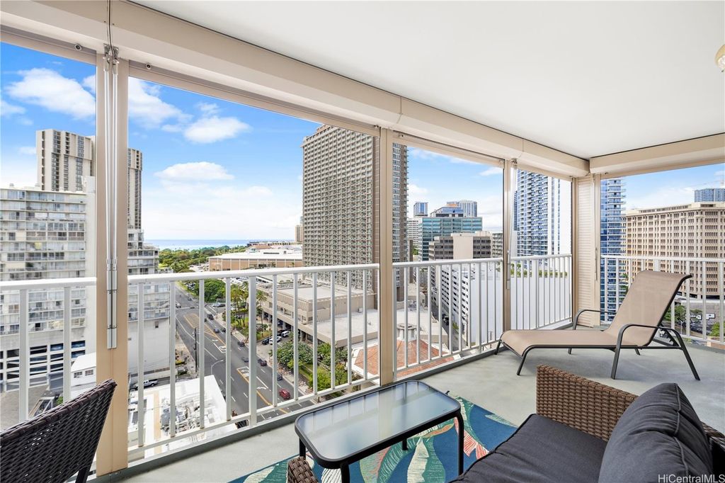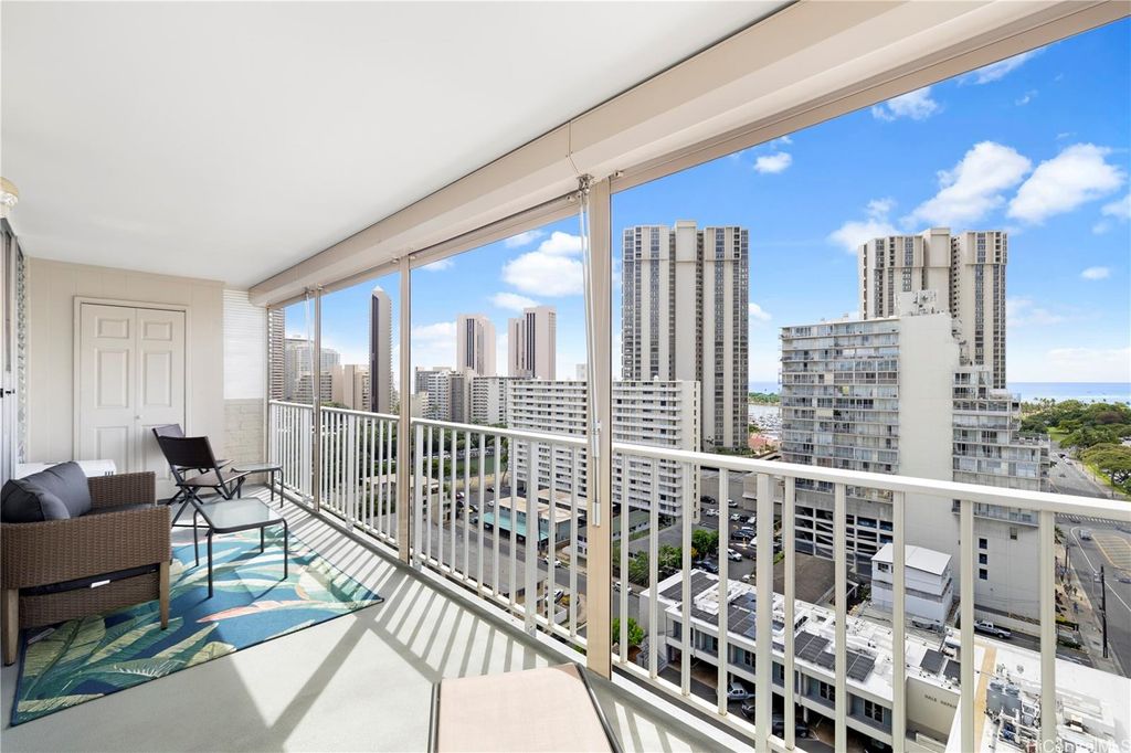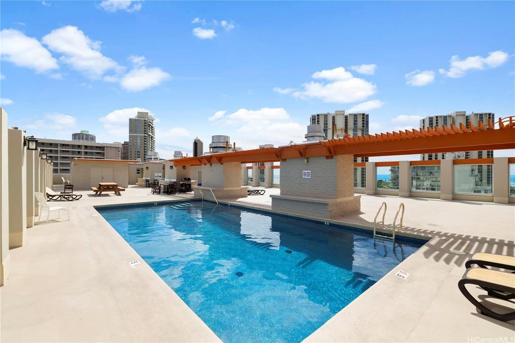 This beautifully Corner 1-bedroom, 1-bath condo at Atkinson Plaza, perfectly positioned between Waikiki and Ala Moana. Enjoy a spacious lanai with ocean views, OR Brand new storm shatters to close the lanai with quiet living space. in-unit washer and dryer, and secure covered parking. This unit offers access to amenities, including a rooftop pool, sauna, BBQ areas, and tennis court"”all just close from Ala Moana Center, the beach park, and local dining. Make this convenient, stylish condo your new home in paradise!