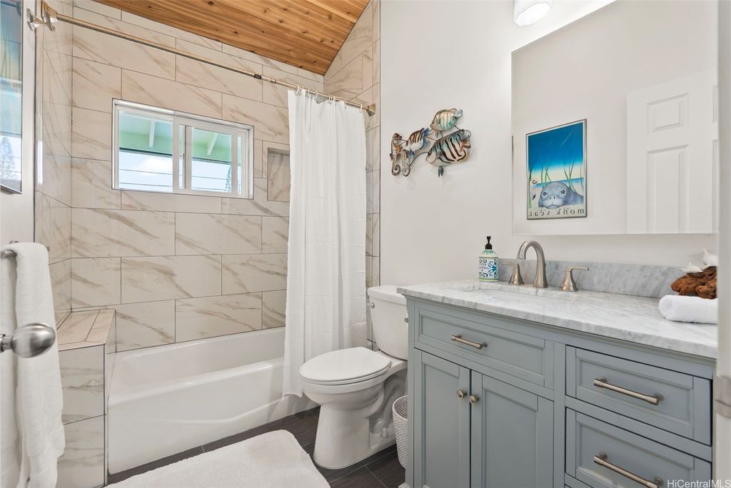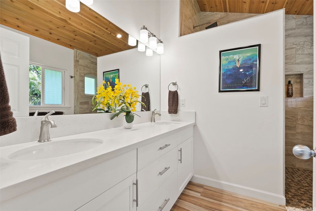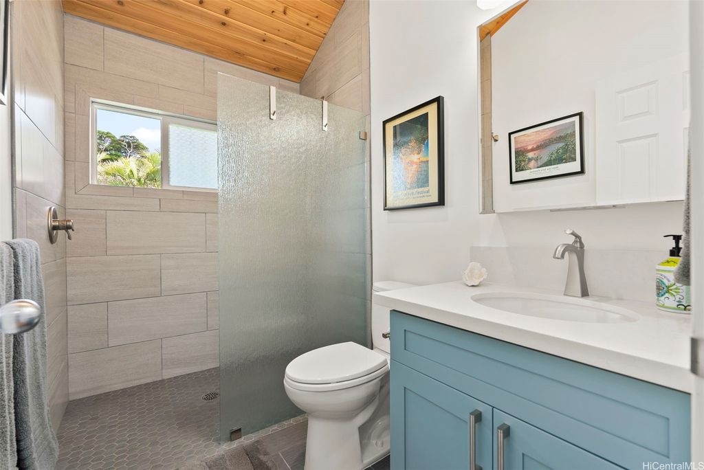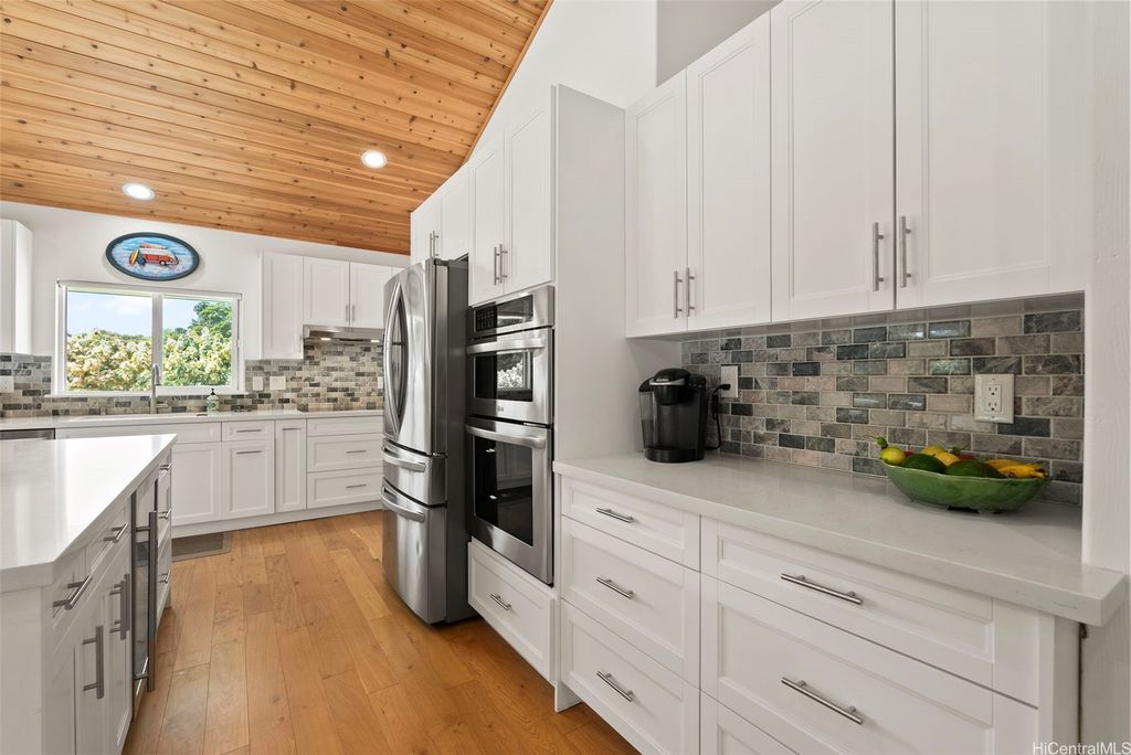 Seller's Motivated !! Nestled in the historic town of Haleiwa on the North Shore of Oahu, this stunning 4 bedroom, 3 bath custom designed residence offers a unique opportunity to embrace island living at its finest. Overlooking the tranquil Loko Ea Fish Pond, the home spans over 3,000 square feet under roof and features two large enclosed garages. Highlights include gorgeous cedar vaulted ceilings, a large kitchen pantry, stainless steel appliances and a built-in wine fridge. The primary bedroom boasts double sinks, a spacious closet and beautiful quartz countertops throughout. With its spacious open floor plan, the interior is filled with natural light and modern finishes perfect for both relaxation and entertaining. Outside to a private half-acre fully fenced oasis featuring a lush yard that meets the Anahulu River's shore. Enjoy vibrant sunsets while stand up paddling into the evening. Just minutes from world-renowned beaches, surf spots, and charming local shops, this location is a perfect mix of tranquility and adventure.
