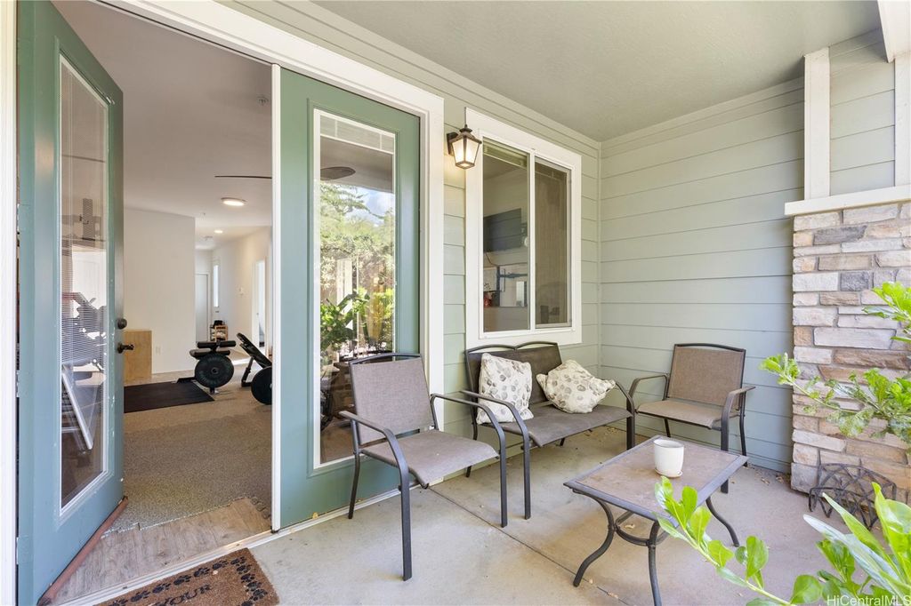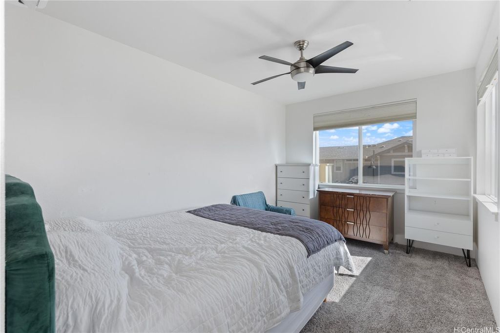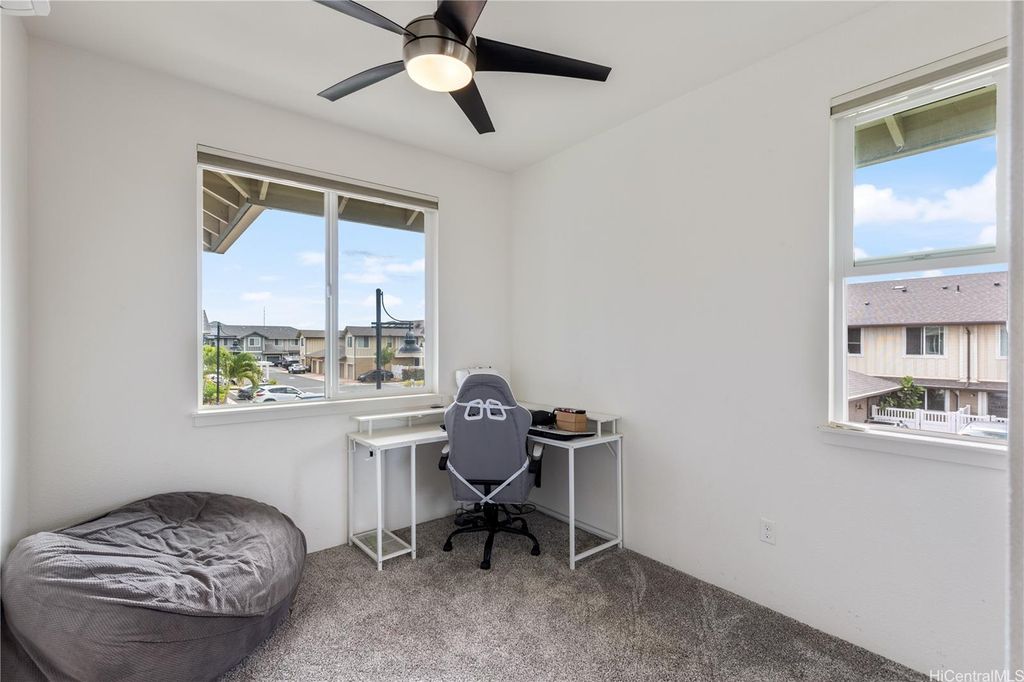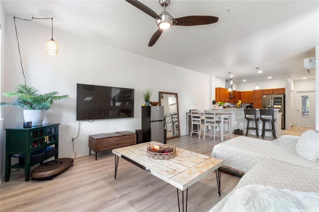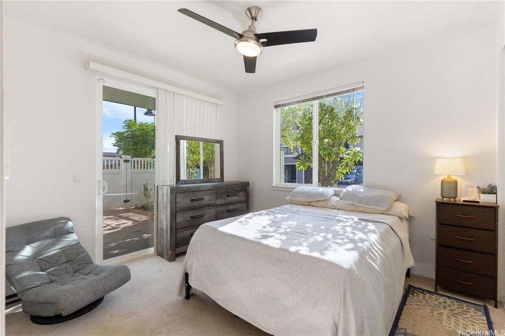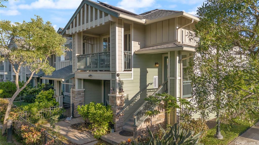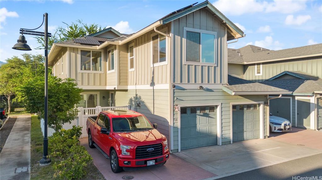 It's your opportunity to own a desirable flex floor plan in Kahiku. Lower level features entry through the garage or fenced in yard. Bedroom, full bath, and wet bar area on the lower level allows for extra living space or can be set up to run your own private home business as well. Upper level features high ceilings, 2 bedrooms, large living room area, and open kitchen perfect for entertaining. Main bedroom has enough space to accommodate a king size bed and a good sized walk in closet as well. Rare unit with 1 car garage, 1 car port and 2 assigned parking stalls #82-83 with plenty of guest parking. 30 owned PV panels. Close to community pool and parks, shopping and dining, rail, Costco, and Ka Makana Ali'i. The ultimate in lifestyle and convenience. The community features salons, car detailing, and many other businesses operating from their flex space. Just wake up and commute downstairs for work!