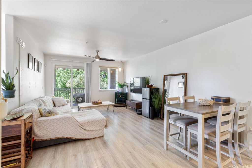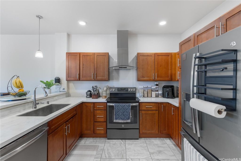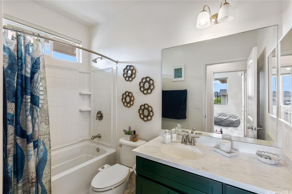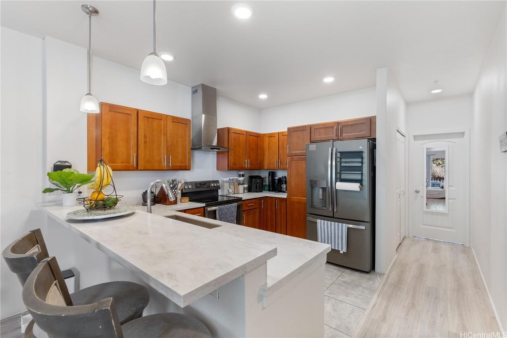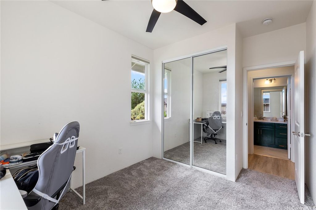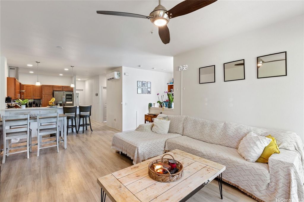 It's your opportunity to own a desirable flex floor plan in Kahiku. Lower level features entry through the garage or fenced in yard. Bedroom, full bath, and wet bar area on the lower level allows for extra living space or can be set up to run your own private home business as well. Upper level features high ceilings, 2 bedrooms, large living room area, and open kitchen perfect for entertaining. Main bedroom has enough space to accommodate a king size bed and a good sized walk in closet as well. Rare unit with 1 car garage, 1 car port and 2 assigned parking stalls #82-83 with plenty of guest parking. 30 owned PV panels. Close to community pool and parks, shopping and dining, rail, Costco, and Ka Makana Ali'i. The ultimate in lifestyle and convenience. The community features salons, car detailing, and many other businesses operating from their flex space. Just wake up and commute downstairs for work!