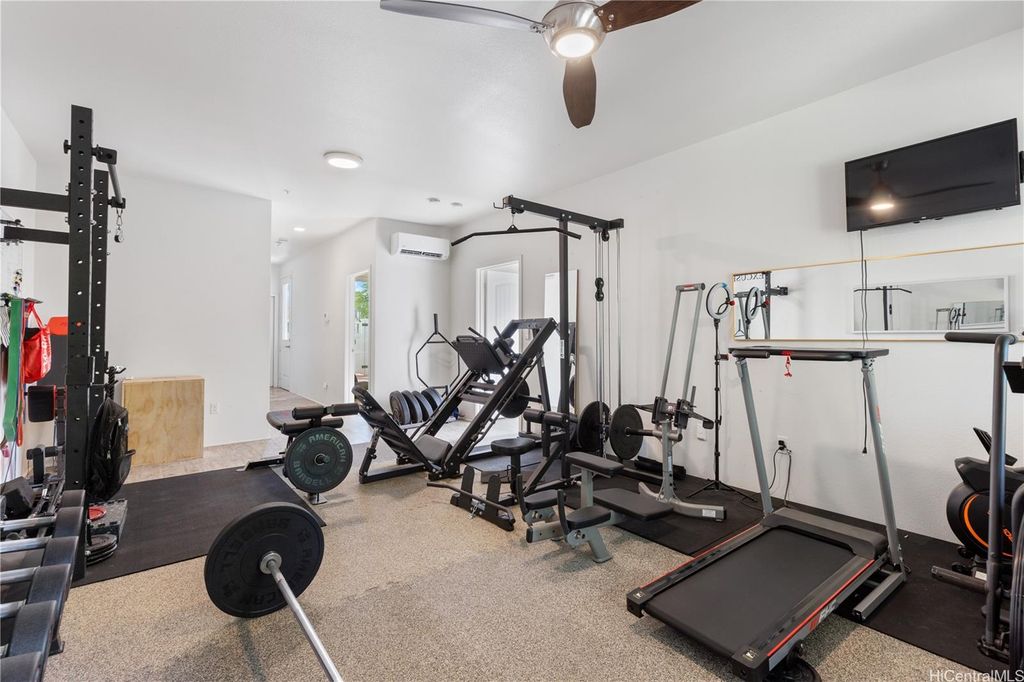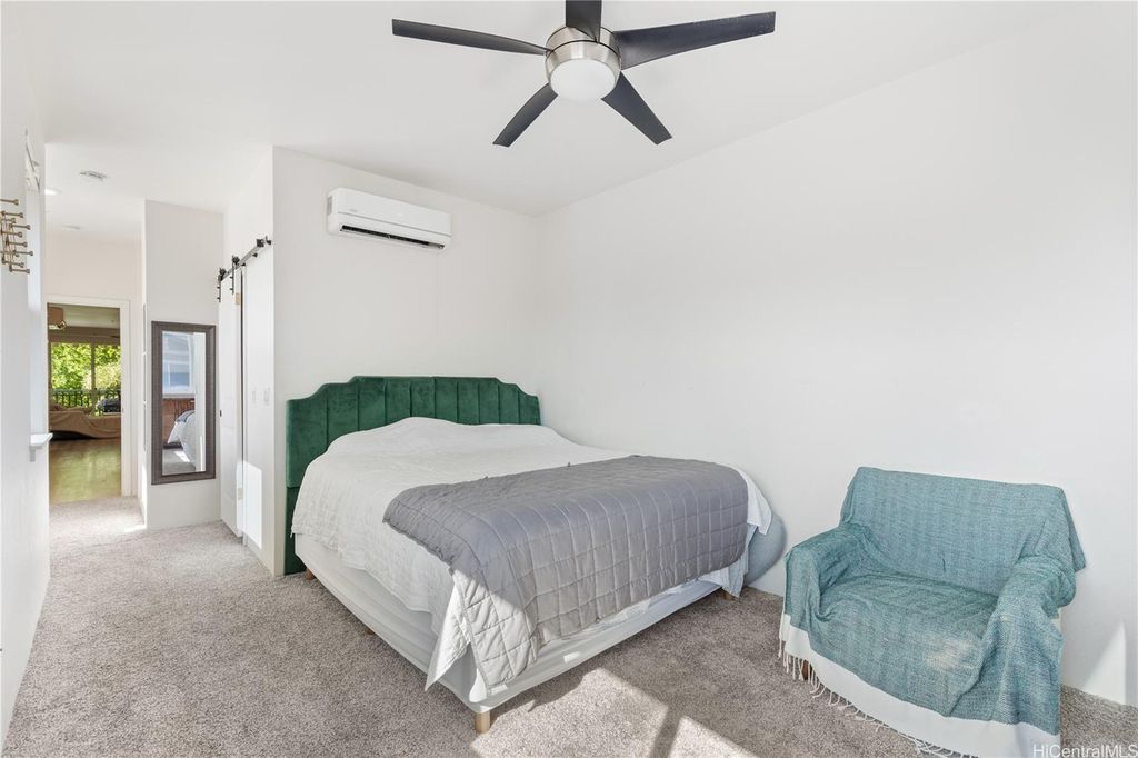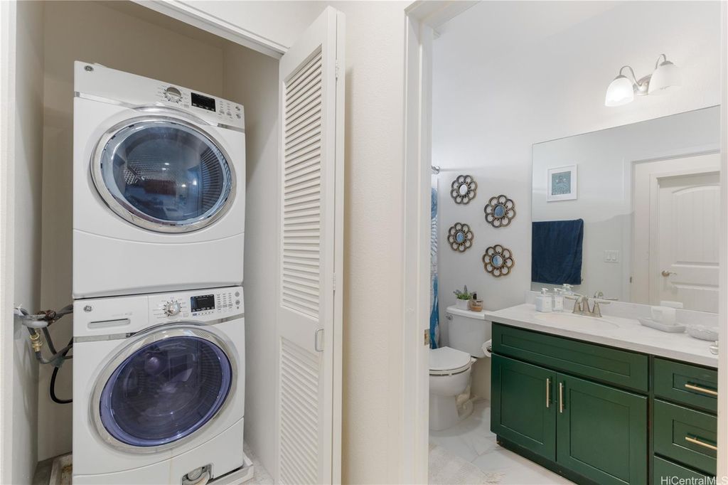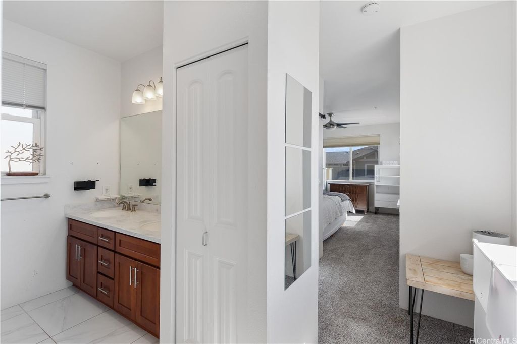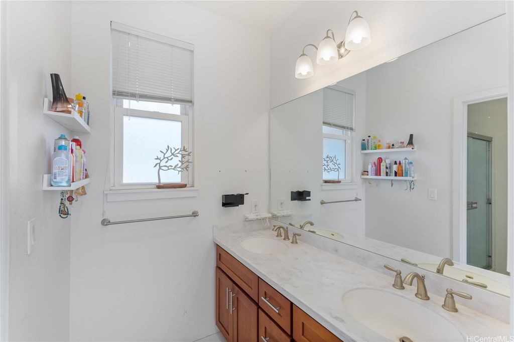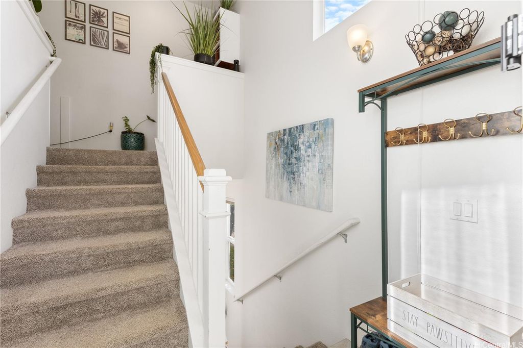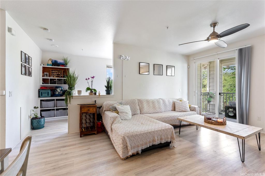 It's your opportunity to own a desirable flex floor plan in Kahiku. Lower level features entry through the garage or fenced in yard. Bedroom, full bath, and wet bar area on the lower level allows for extra living space or can be set up to run your own private home business as well. Upper level features high ceilings, 2 bedrooms, large living room area, and open kitchen perfect for entertaining. Main bedroom has enough space to accommodate a king size bed and a good sized walk in closet as well. Rare unit with 1 car garage, 1 car port and 2 assigned parking stalls #82-83 with plenty of guest parking. 30 owned PV panels. Close to community pool and parks, shopping and dining, rail, Costco, and Ka Makana Ali'i. The ultimate in lifestyle and convenience. The community features salons, car detailing, and many other businesses operating from their flex space. Just wake up and commute downstairs for work!