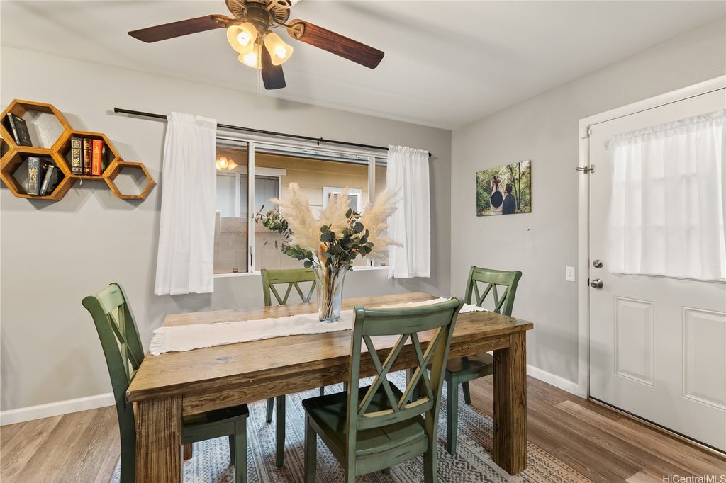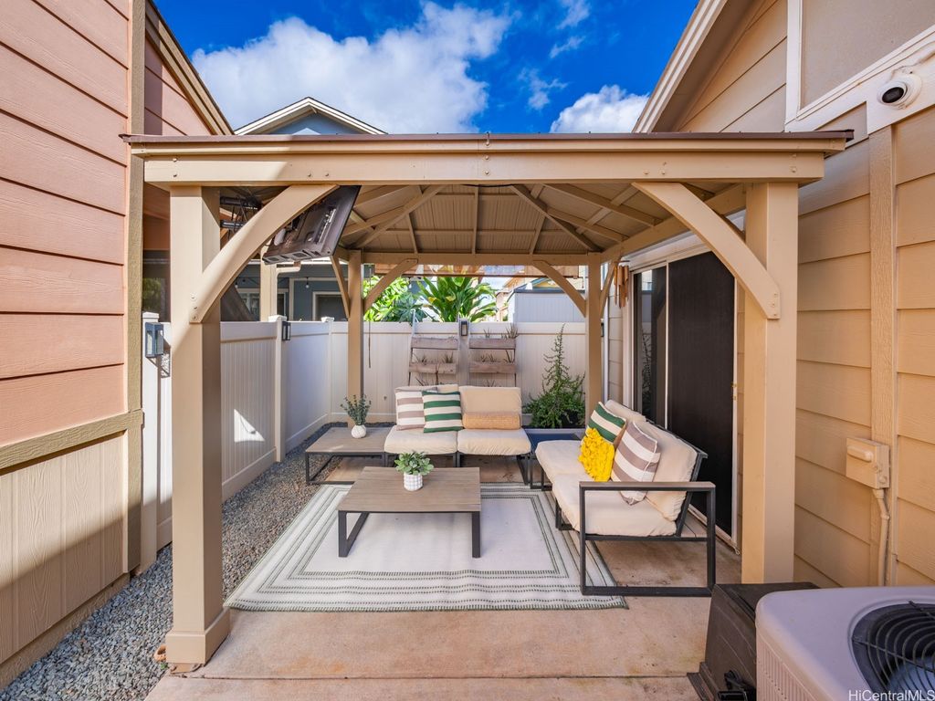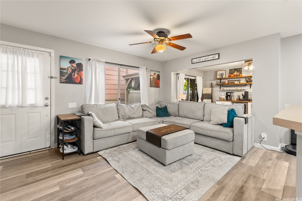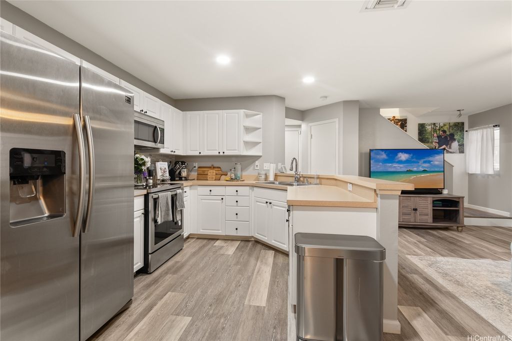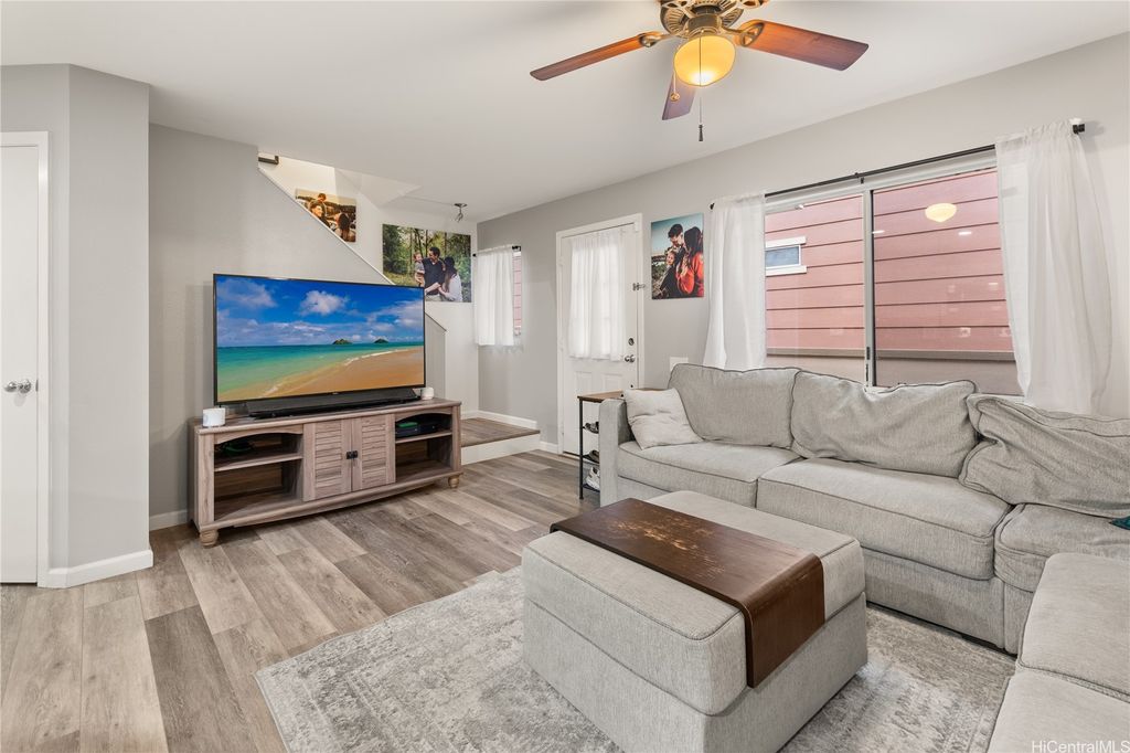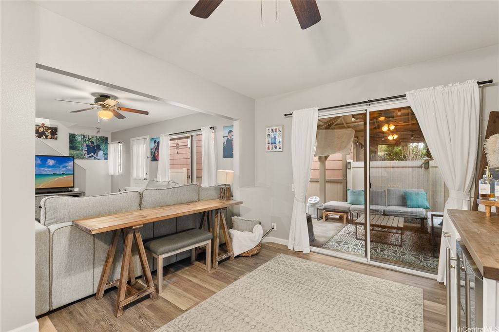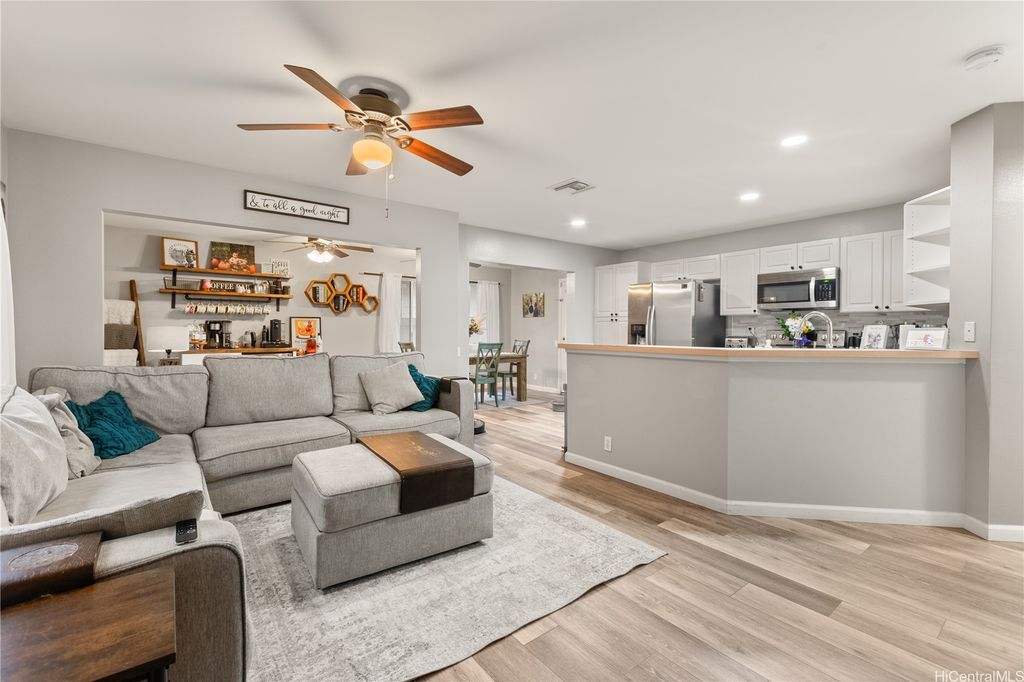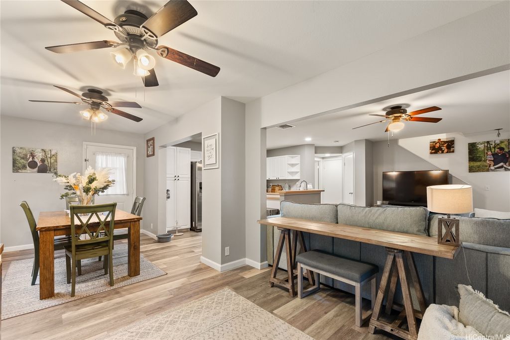 This thoughtfully remodeled 3-bedroom, 2.5-bath home features an expanded living area making it one of the largest homes in the neighborhood. The open-concept layout creates a seamless flow between the living, dining, and kitchen areas, perfect for everyday comfort and easy entertaining. The kitchen is equipped with stainless steel appliances and a functional layout that makes cooking a breeze. Enjoy gatherings in the expanded living space or host weekend BBQs in your private lanai. Updated luxury vinyl plank flooring adds a modern touch throughout. Stay cool year-round with central AC and 37 leased photovoltaic panels for energy efficiency. Additional highlights include a 2-car enclosed garage, an open parking stall, and convenient guest parking nearby.