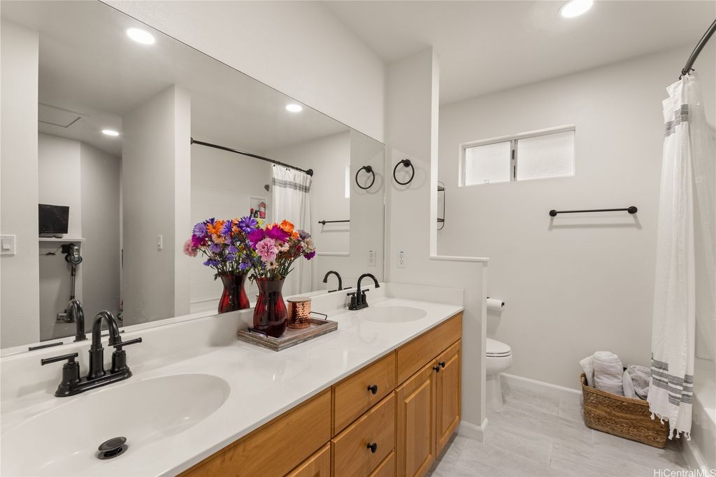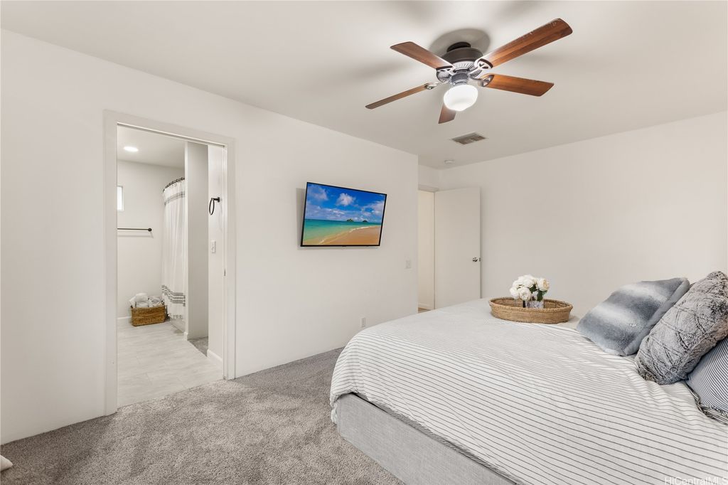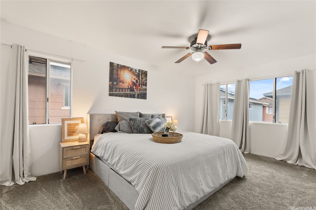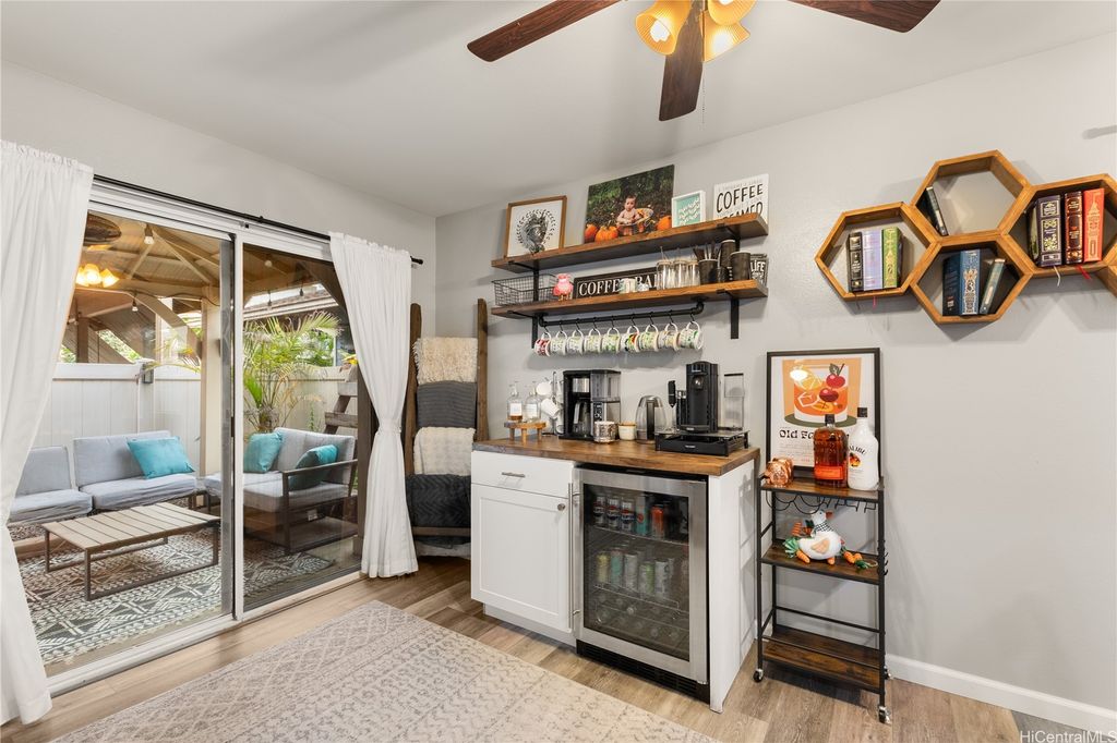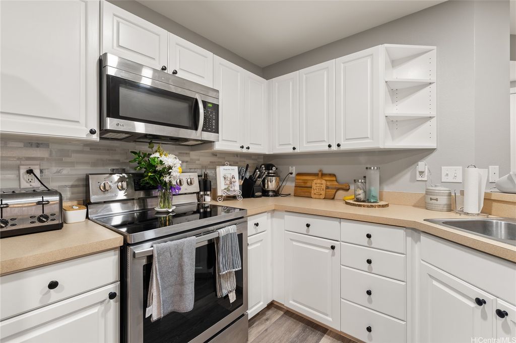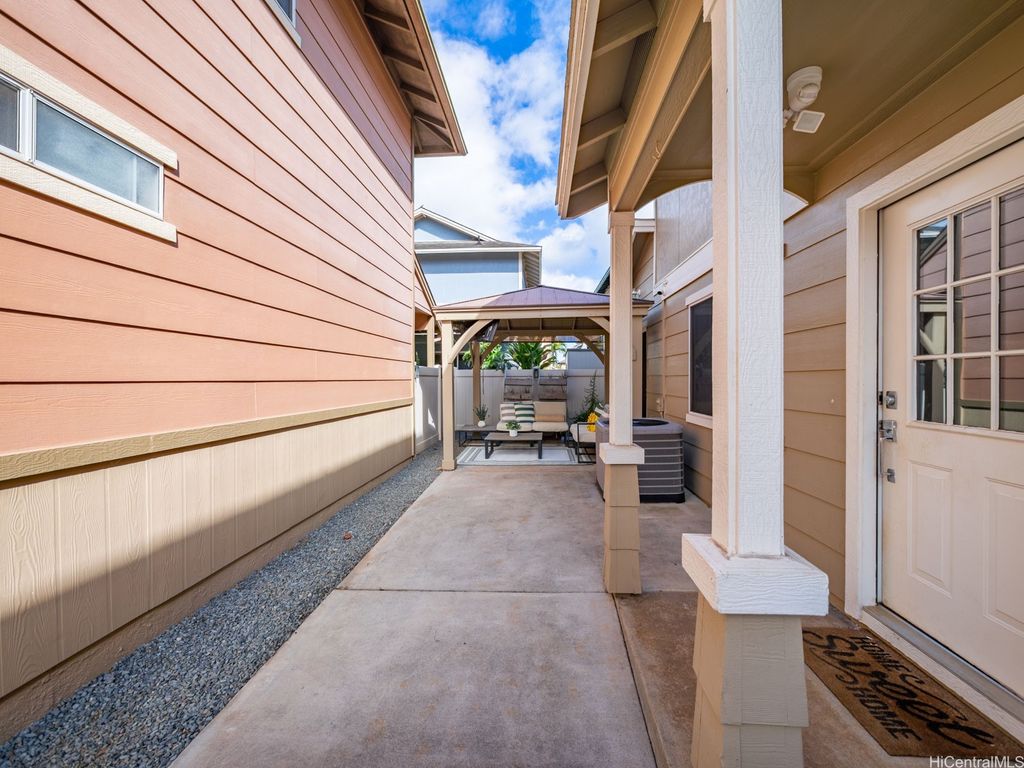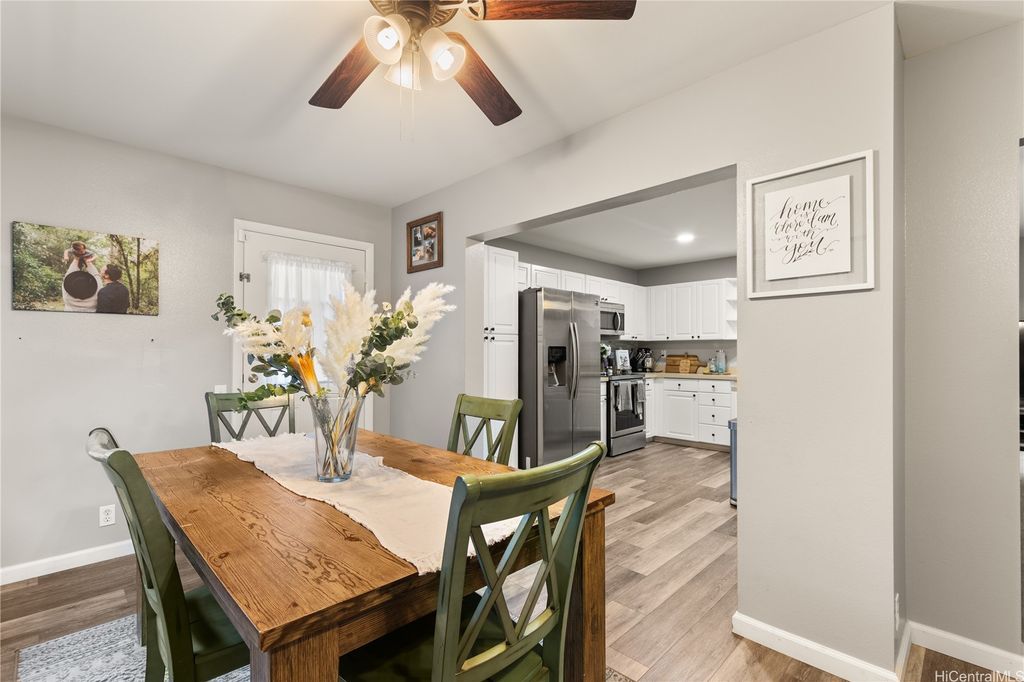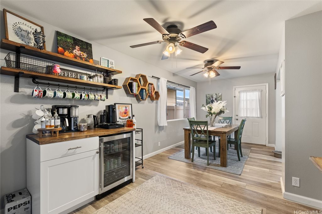 This thoughtfully remodeled 3-bedroom, 2.5-bath home features an expanded living area making it one of the largest homes in the neighborhood. The open-concept layout creates a seamless flow between the living, dining, and kitchen areas, perfect for everyday comfort and easy entertaining. The kitchen is equipped with stainless steel appliances and a functional layout that makes cooking a breeze. Enjoy gatherings in the expanded living space or host weekend BBQs in your private lanai. Updated luxury vinyl plank flooring adds a modern touch throughout. Stay cool year-round with central AC and 37 leased photovoltaic panels for energy efficiency. Additional highlights include a 2-car enclosed garage, an open parking stall, and convenient guest parking nearby.