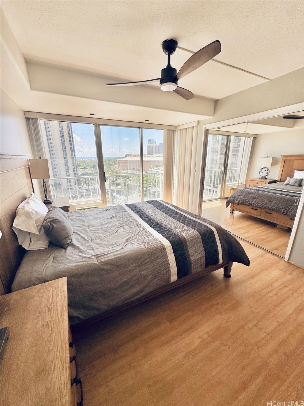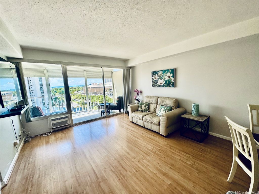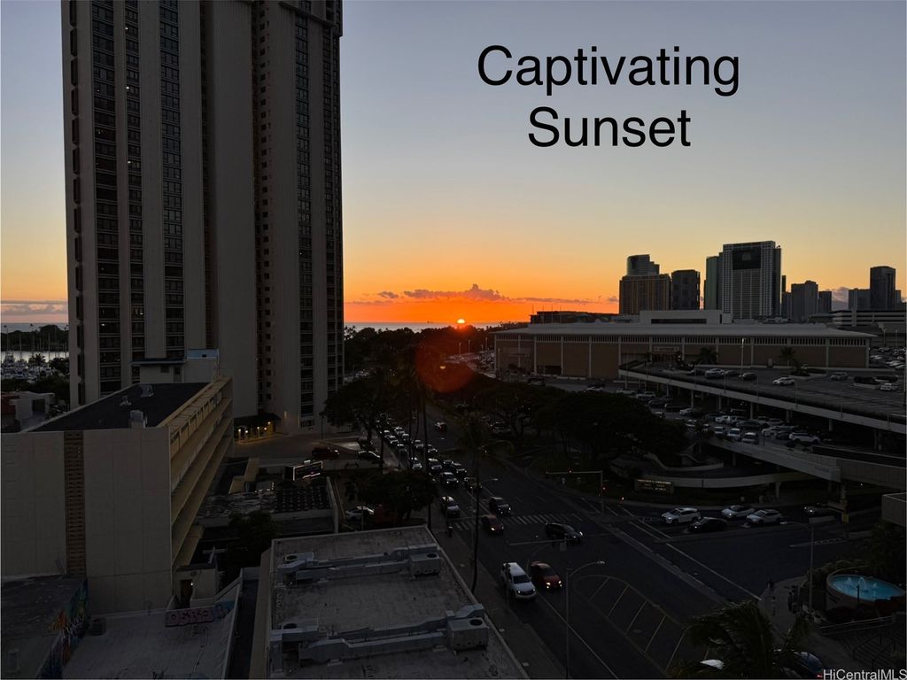 Nicely done 1 bdrm with parking over looking ocean views with stunning sunsets over Waikiki and Ala Wai Harbor. Located adjacent to Ala Moana Shopping Ctr, and across from Ala Moana beach park & Magic Island. Unit is move in ready has been painted also bamboo flooring, and furnished w/queen bed set includes headboard,footboard, memory foam mattress, 2 end tables,2 lamps, fullsize dresser. Bed has drawers underneath for more storage. Livingroom has 60" Samsung Smart TV, recliner sofa w/auto leg lifts, and a cute dining set with 4 padded chairs. Kitchen has brand new Samsung Bespoke appliances which include a refrigerator w/filtered water in the door, 2 diff. ice cube makers, a stove/oven, a full size microwave oven, and dishwasher as well as a Nespresso coffee maker. All plumbing fixtures are also brand new so nothing more for you to do. A sizeable patio to enjoy sunsets over Waikiki every evening. Custom floor to ceiling aluminum storm shutters. One parking stall and storage unit in garage. This unit has one of lowest maintenance fees in bldg. with a FOB entry key plus pet friendly bldg. Seller Motivated! Tenant has finally moved out and very easy to show with Lockbox.