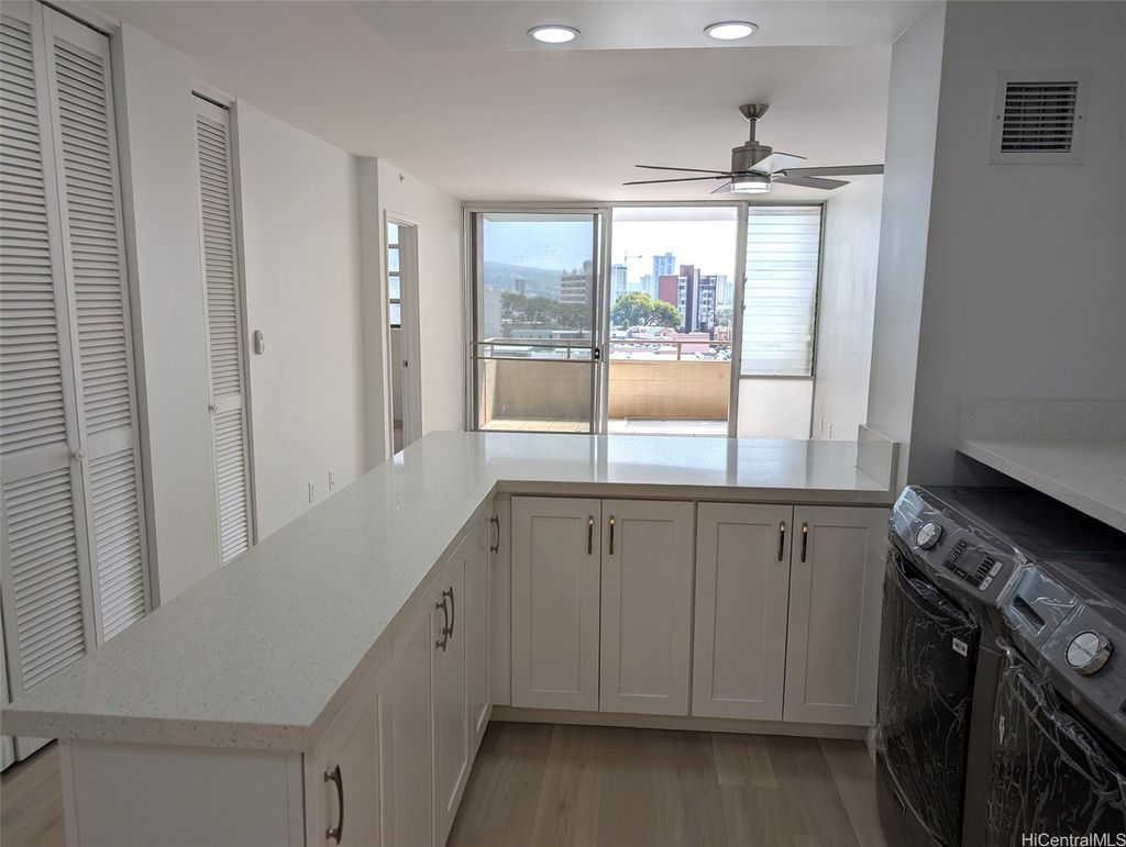 Kapiolani Bel-Aire tastefully renovated 2 bedroom, 1.5 bath condo. Over 800 square feet interior living space and a large lanai. Luxury Vinyl Plank flooring, redone kitchen with all new appliances, redone bathrooms and smooth ceiling (no popcorn). Minutes away from Ala Moana Shopping Center, Walmart, Target, Sam's Club, post office, banks and bus lines. Note this building has fire sprinklers for your protection.