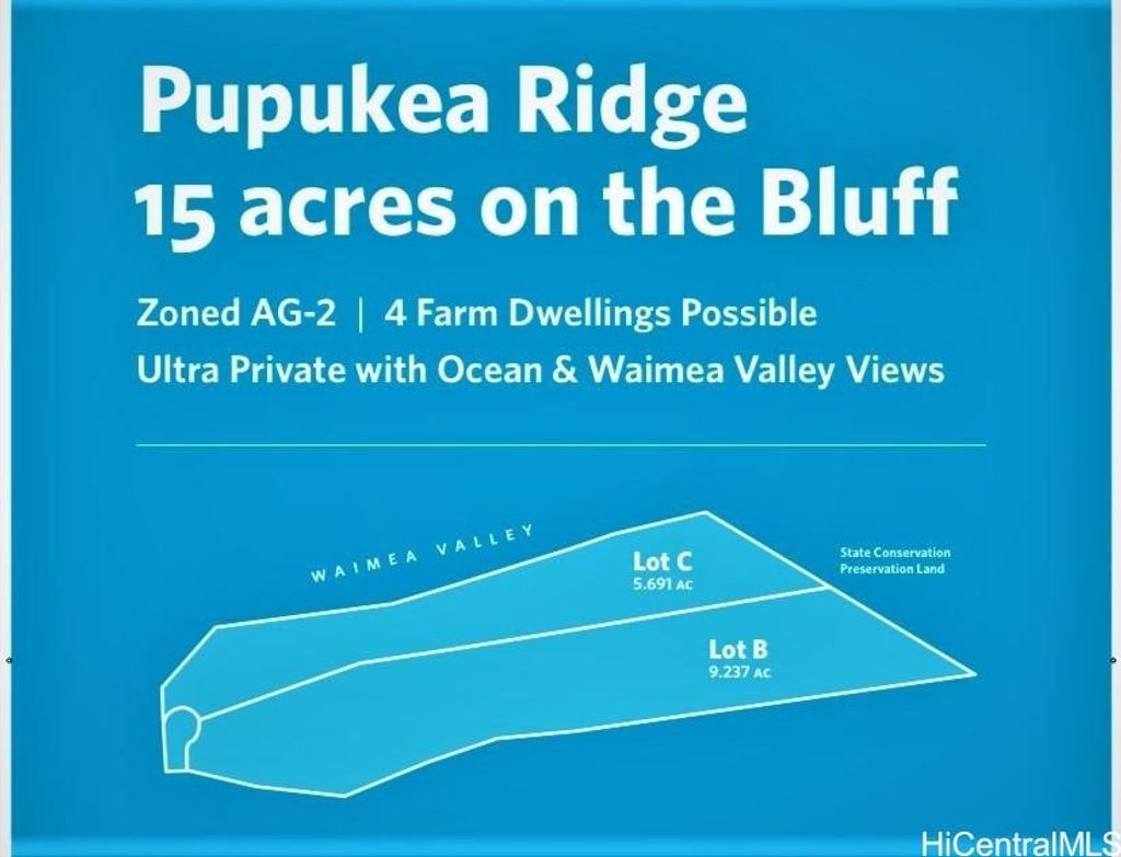 Among the last of its kind available, this undeveloped bluff/ridge lot in prestigious Pupukea is a rare opportunity for a discerning buyer. This ridge line, previously protected from development, is available for purchase. Preserve breathtaking ocean and mountain views for generations to come. Privacy is the norm throughout all 15± acres thanks to borders shared with State conservation land in front and Waimea Valley on the west. Tucked between dramatic mountains and views of deep blue waters of the Pacific, this lot is an impeccable blank canvas for your own tropical escape. Dream up a paradise of your design above Waimea Valley and make the most of jaw-dropping panoramic views. With potential to develop up to four dwellings & AG structures.