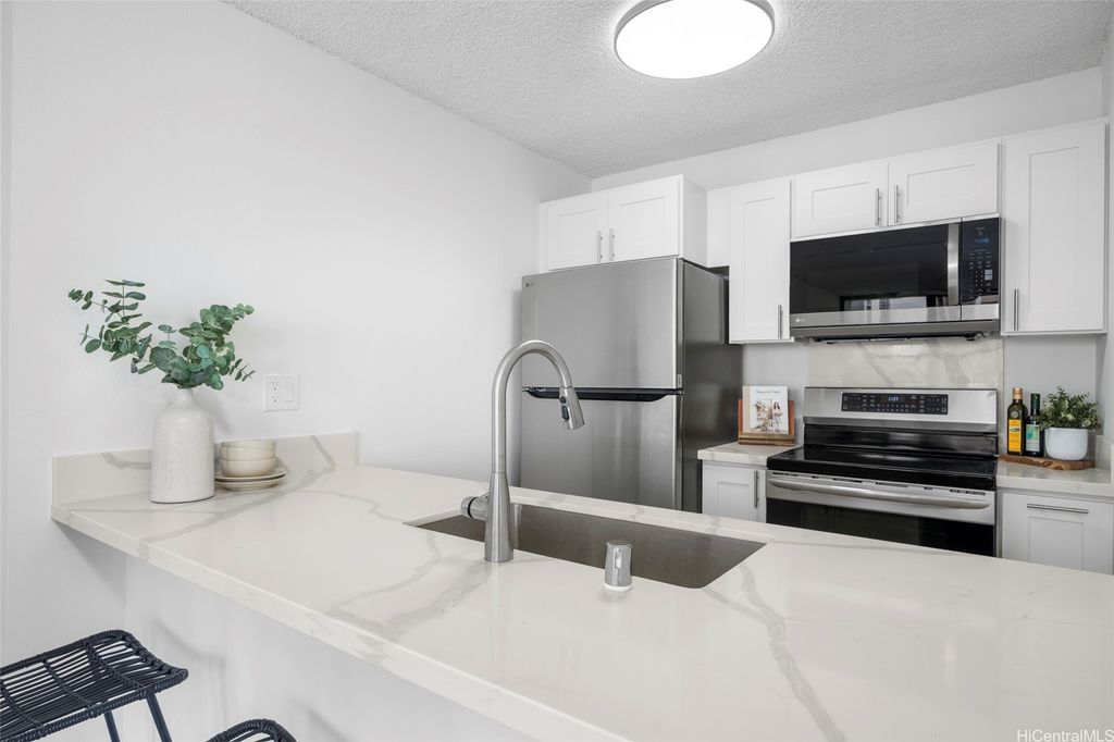 This beautifully renovated 1-bedroom, 1-bathroom unit in Pearl 1 is move-in ready! Upon entry, you're welcomed into a bright and open kitchen and living area that seamlessly connects to a spacious lanai, accessible from both the living room and bedroom. This serene outdoor space is perfect for unwinding while taking in the stunning views of Pearl Harbor. Recent upgrades include brand-new flooring, sleek kitchen cabinets, stylish countertops, a modern sink and faucet, premium appliances, an updated bathroom vanity, a reglazed shower with new fixtures, a new toilet, contemporary light fixtures, and upgraded electrical outlets"”all complemented by fresh paint for a crisp, clean look. Ideally situated in a prime location, Pearl 1 is just minutes from Pearlridge, Pali Momi, Kaiser, schools, restaurants, and entertainment. Residents enjoy top-notch amenities, including an on-site manager, video security, security guard, a refreshing pool, basketball/tennis court, BBQ, and a recreation area. Additional parking stalls are available for rent - please contact the Listor for more details.