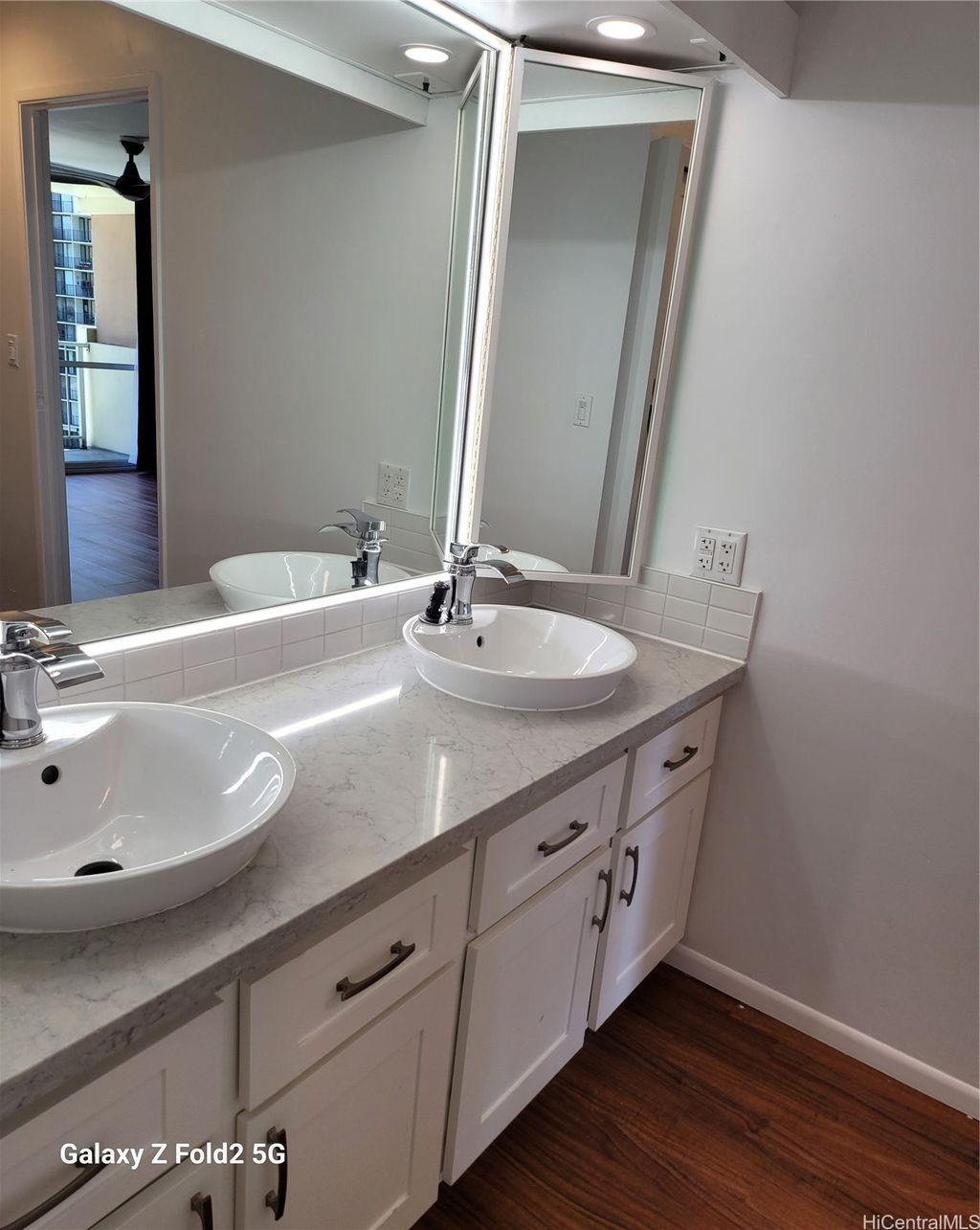 Beautiful one-bedroom, one bathroom, stylishly renovated with custom touches in mind. Ideally located across Pearlridge Mall, Pearl Kai Shopping Center, and Joint Base Pearl Harbor-Hickam. As you drive up to the building, a porte-cochere greets you, making it easy to drop off or pick up family or guests. Renovated in 2023, Koa vinyl planks, porcelain tile floors, granite tops, built-in closet organizer, custom monkey pod shelves, S/S refrigerator, range/oven, microwave hood, DISHWASHER, range-oven, hot water dispenser, under cabinet water filter system, custom whiteboard and peg board to hang cookware/utensils, extra seating under the counter kitchen peninsula, and a laundry center adjacent to pantry camouflage by wooden sliding doors. The monthly maintenance fee includes hot water, electricity, water heater, water-sewer, and access to the building's amenities: pool, sauna, exercise room, BBQ area with picnic tables and grills, community laundry center, security desk, security video, and guest parking. Tenant occupied; listor must be present. Two Days' notice is required. The apartment contains larger items, which can make it difficult to see.