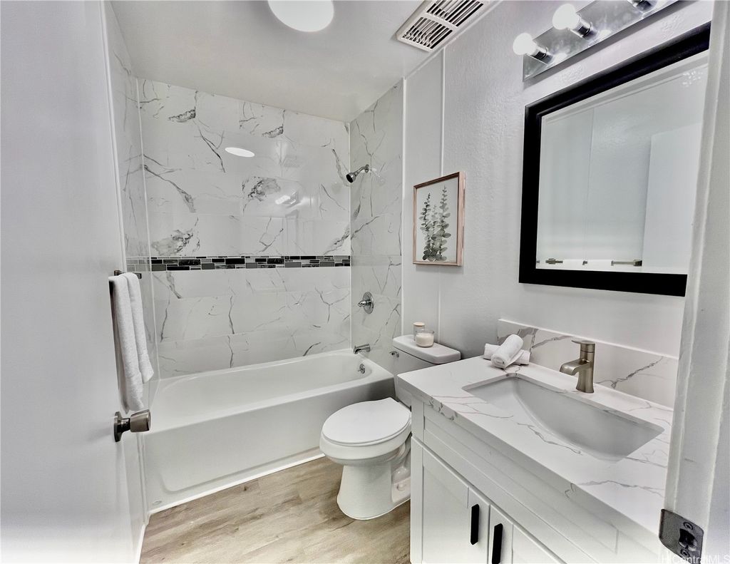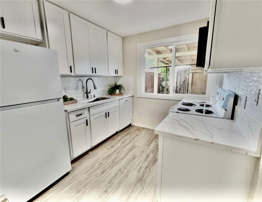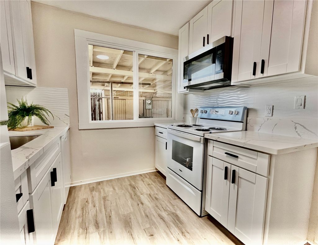 Motivated seller! Priced below tax assessed value!!! Fantastic Buy! Great opportunity to achieve your dream of home ownership at this affordable 4 bedrooms and 1.5 baths single family home. Beautifully Remodeled corner unit with new kitchen, bathrooms, new paint, luxury vinyl plank flooring and all new appliance. Spacious front covered patio with 2 storagae closets. Spacious open back yard. Both fully fenced front and back. Parking stalls conveniently located right outside your front door. Home is move in ready.