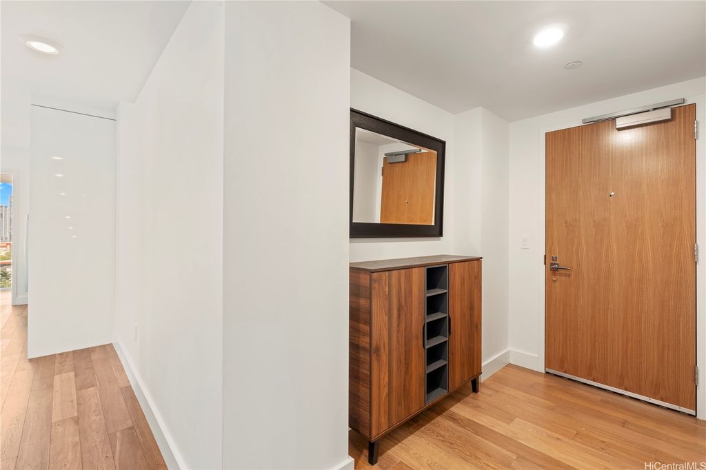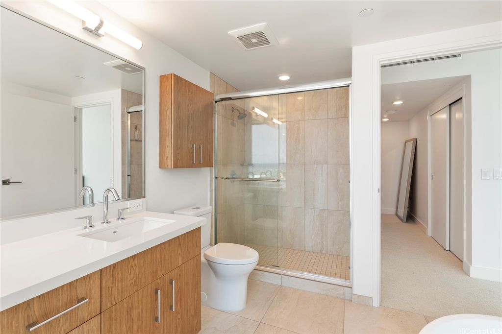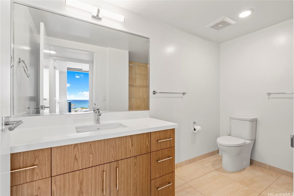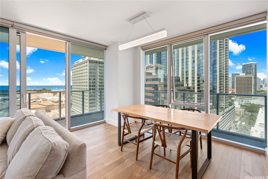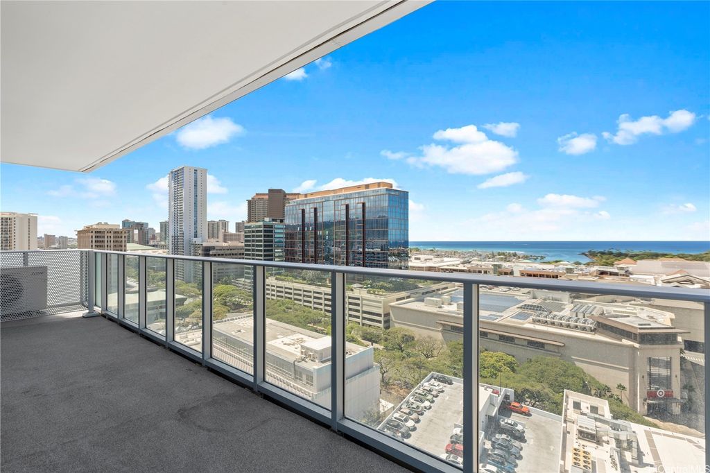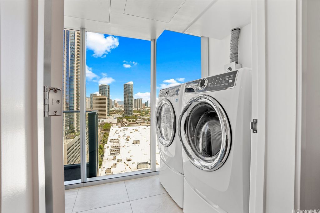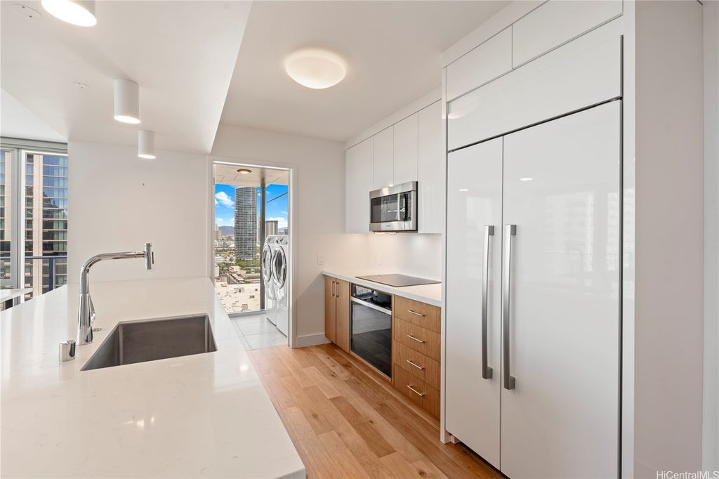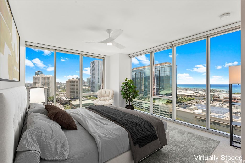 Experience elevated island living in this stunning 2-bed, 2-bath corner unit offering sweeping views of the ocean, city, Magic Island, and harbor. As the largest 2-bedroom floor plan in the building, it features floor-to-ceiling windows and split AC throughout. The modern kitchen is equipped with glossy white cabinets, quartz countertops and premium Sub-Zero, Bosch and Wolf appliances. The side-by-side washer and dryer is located just off the kitchen. The primary suite offers ocean views, a walk-in closet and a deep soaking tub. Additional features include two covered side-by-side parking stalls and built-in pet food trays. Enjoy the inviting and convenient amenities: pool, spa, gym, BBQ cabanas, club lounge, theater, guest suites, dog park, EV charging stations, and 24/7 security"”all in an unbeatable location near Ala Moana Beach, shopping, and dining! And for added peace of mind, Azure is fully covered with 100% hurricane insurance.
