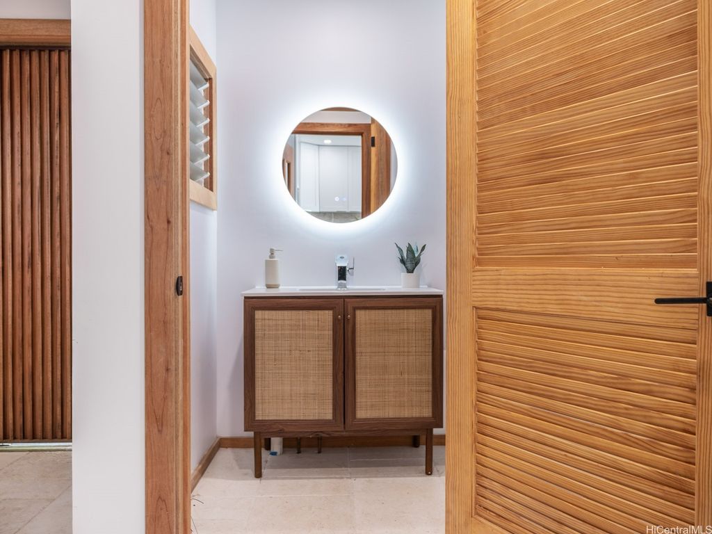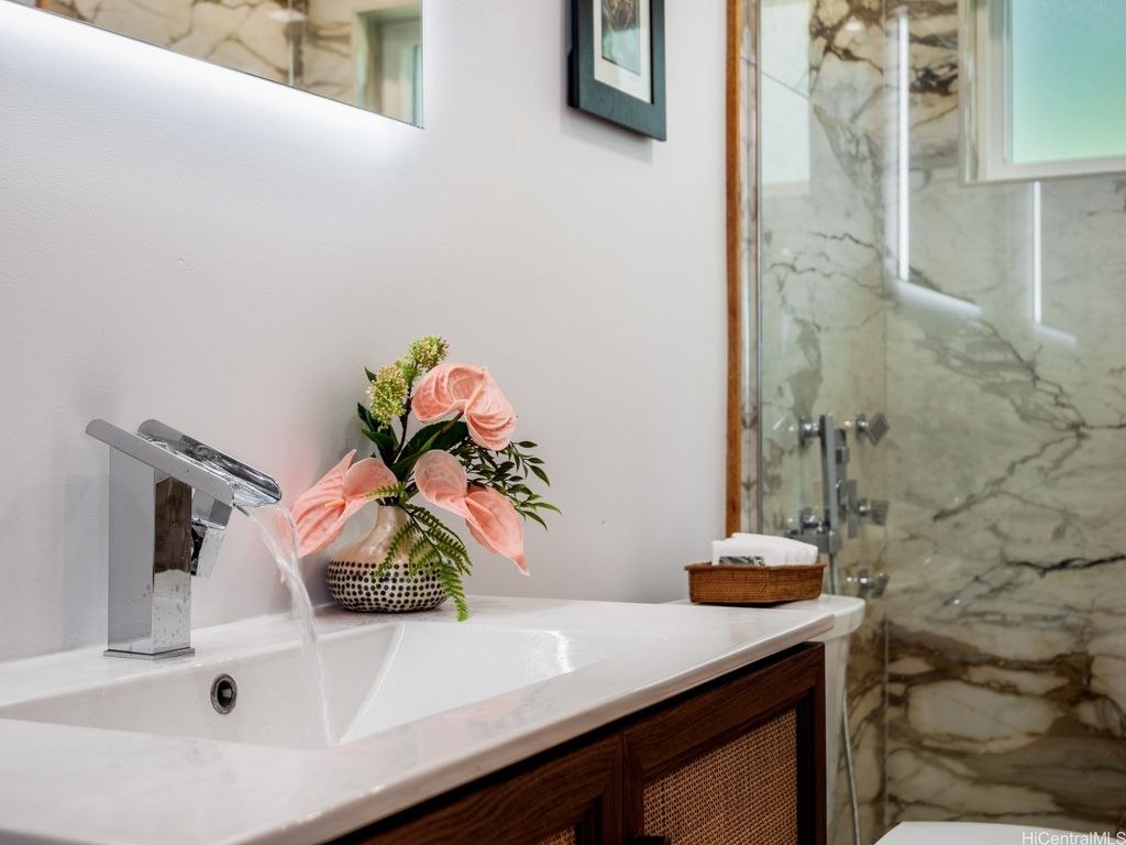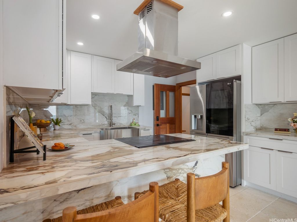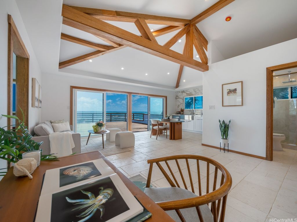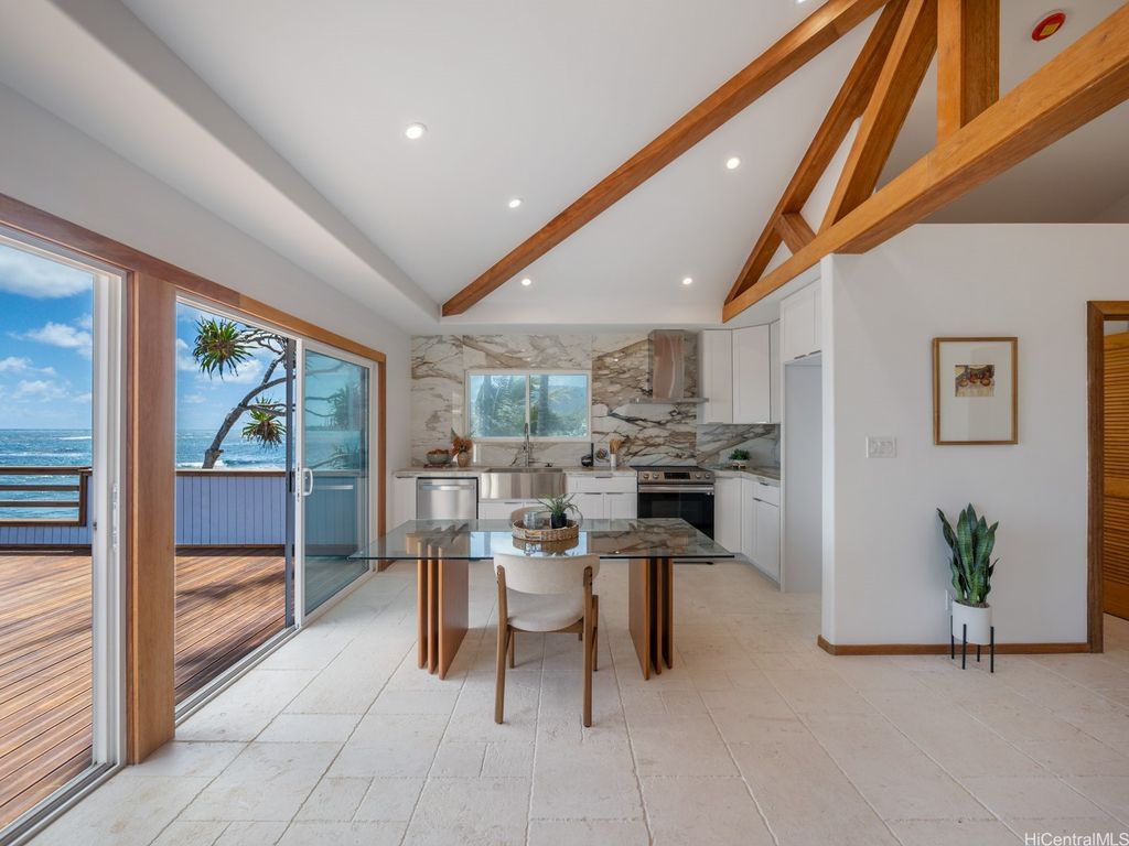 Two luxury ocean front homes that have multiple living spaces. Fully wrapped in African Mahogany trim, a top of the line hardwood known for its durability against natural elements. Soak in the landscape with views from every room, and enjoy the approx 875 s.f. lanai made of Vulcan Abodo decking, meant to last a lifetime & FSC certified sustainable. The interior white coral flooring transitions the ocean elements into the homes seamlessly. The kitchens and bathroom are Italian Moonstone and some Topäz porcelain. Thoughtfully designed interior doors and electric front gate are Brazilian Sapele hardwood, also known for its durability with coastal elements. Landscaped with hala, palms and travelers trees. Front house has 3BR/3.5BA downstairs & 2BR/1BA upstairs. Back house has 2BR/1BA with kitchen/wet bar on each floor. Property specs do not match tax records.
