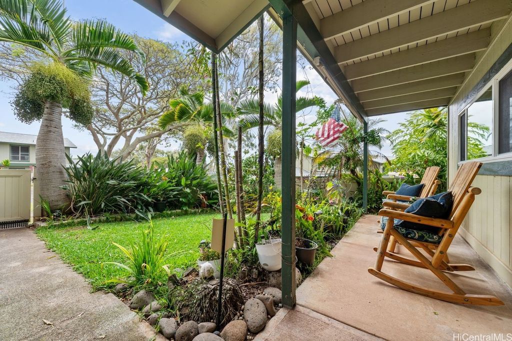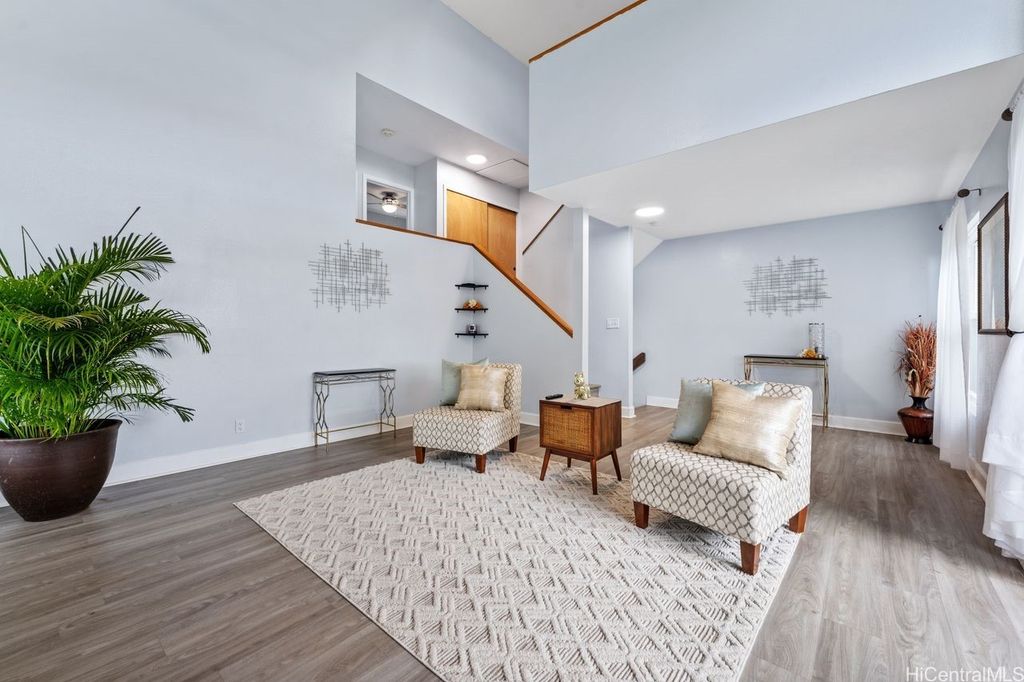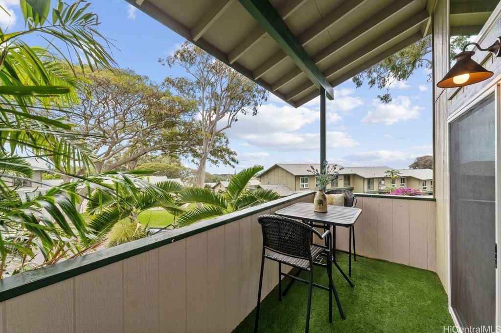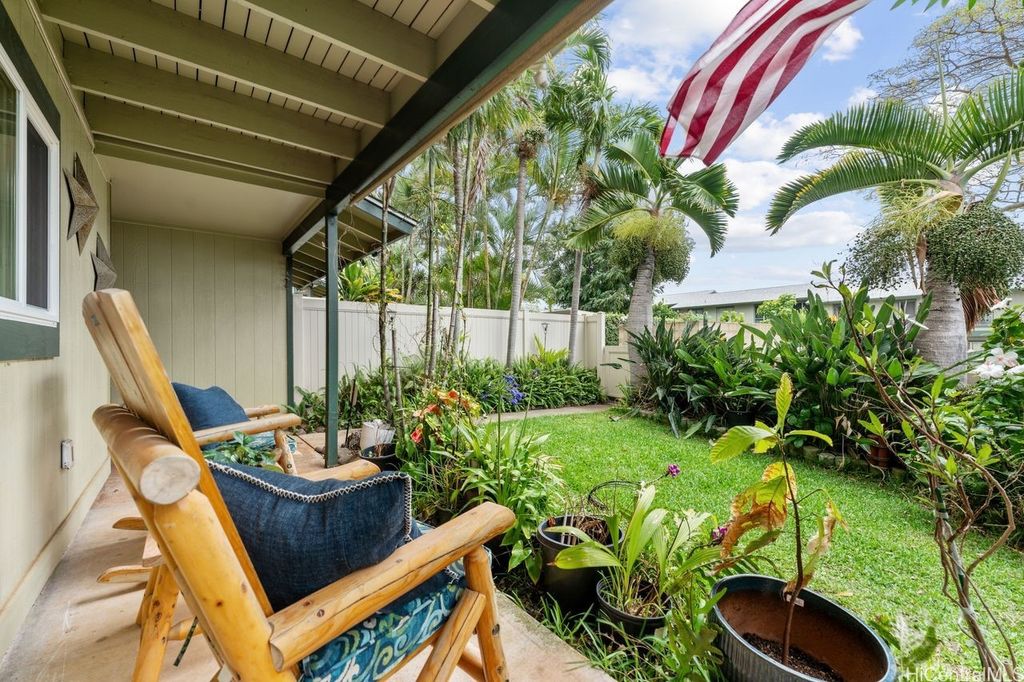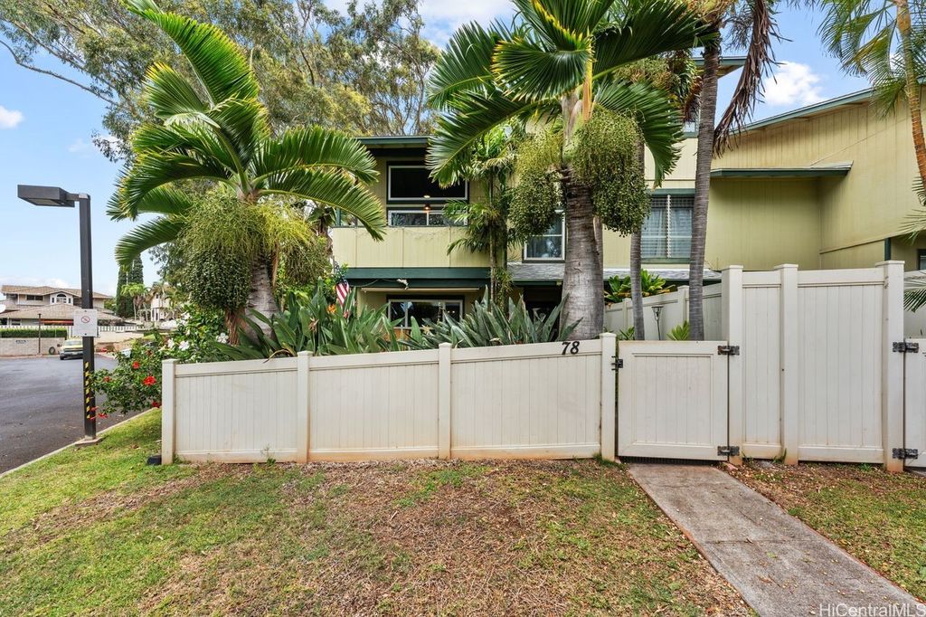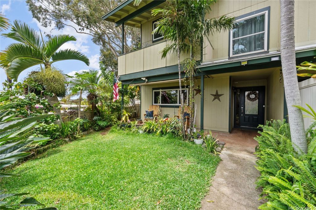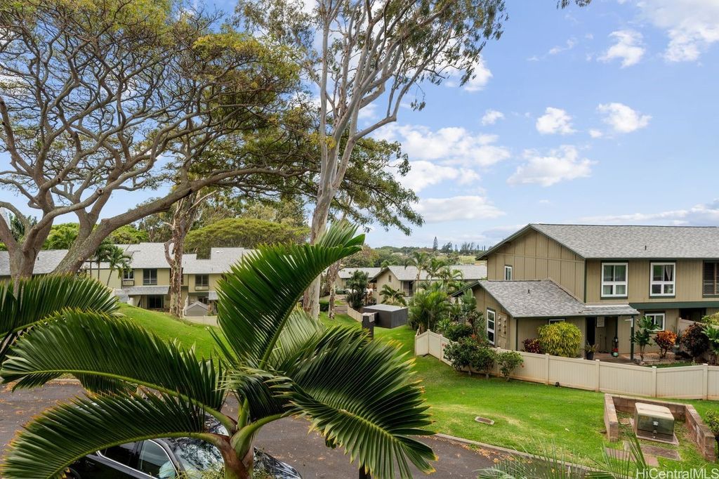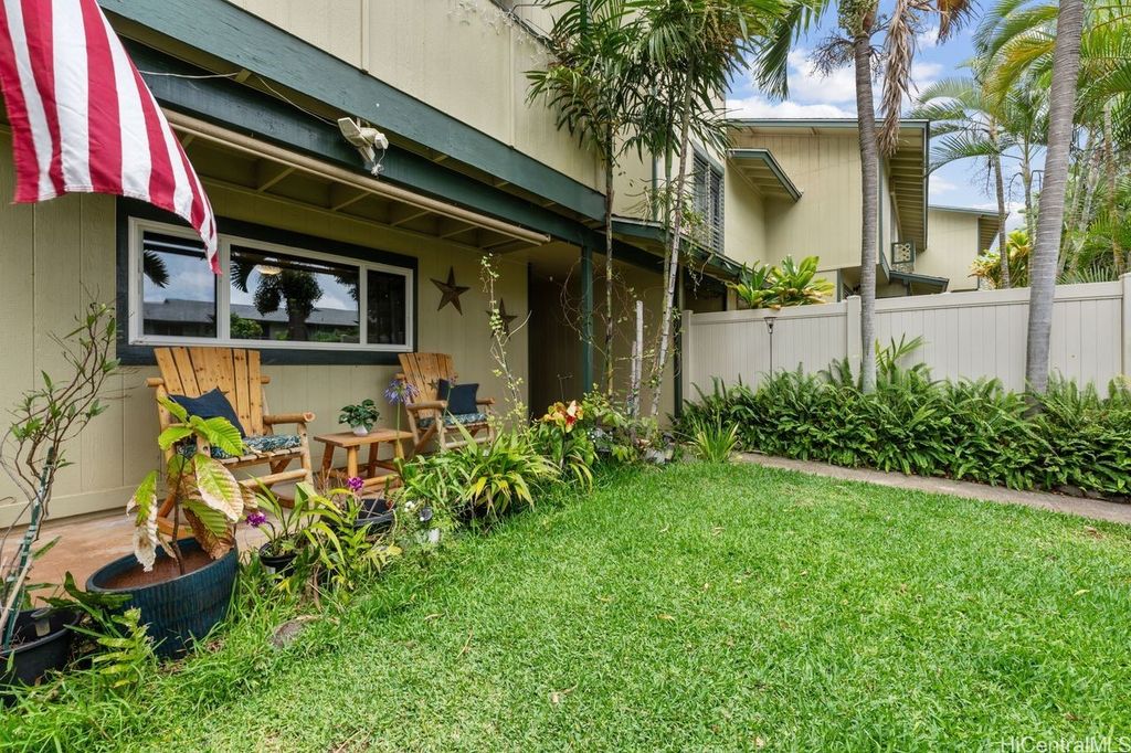 Highly desired corner-end townhouse in a peaceful community! This spacious home features 3 bedrooms plus a loft/office that can be used as a 4th bedroom. Fresh interior paint throughout. Enjoy a private balcony with views of the ocean and Makakilo Park. The wraparound yard has a resort-like feel with a covered patio, stonewall garden, and fruit trees. Two covered parking stalls are located in front of the unit. Interior highlights include LVP flooring, granite countertops, tiled baths, pull-out cabinet shelves, ceiling fans, and double-pane windows. Spacious attic with pull-down access. One of only six homes in the community with front-covered balconies. Transferable security system and energy-efficient appliances. Conveniently located near parks, shopping, bus stops, and freeway access.