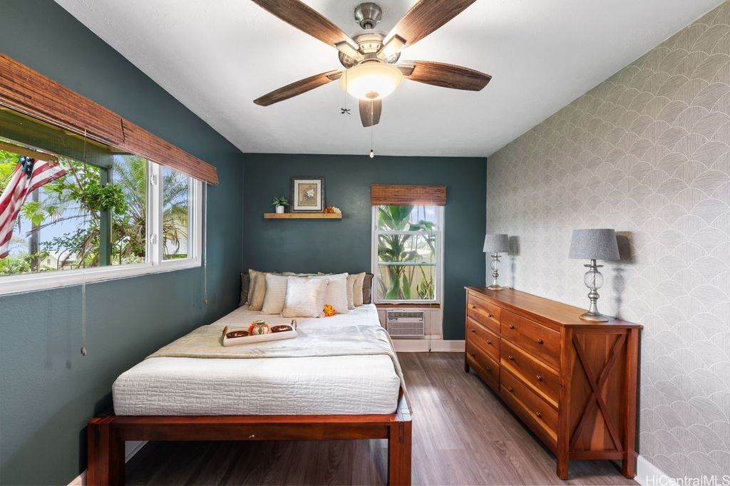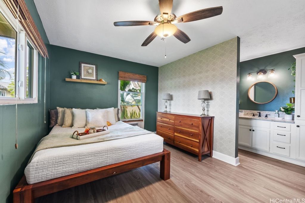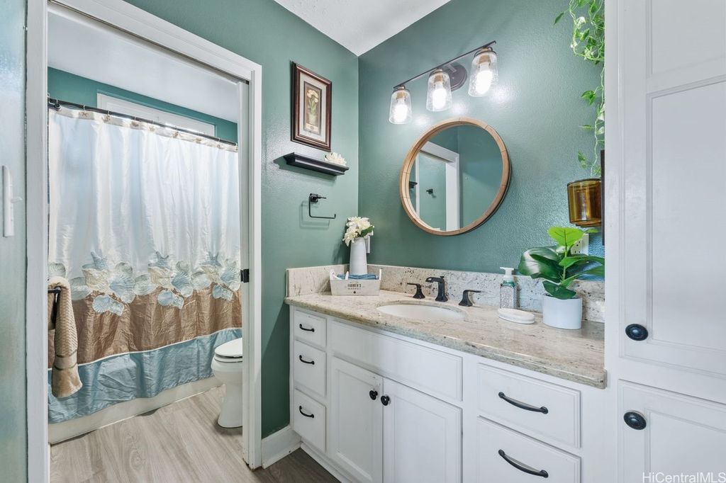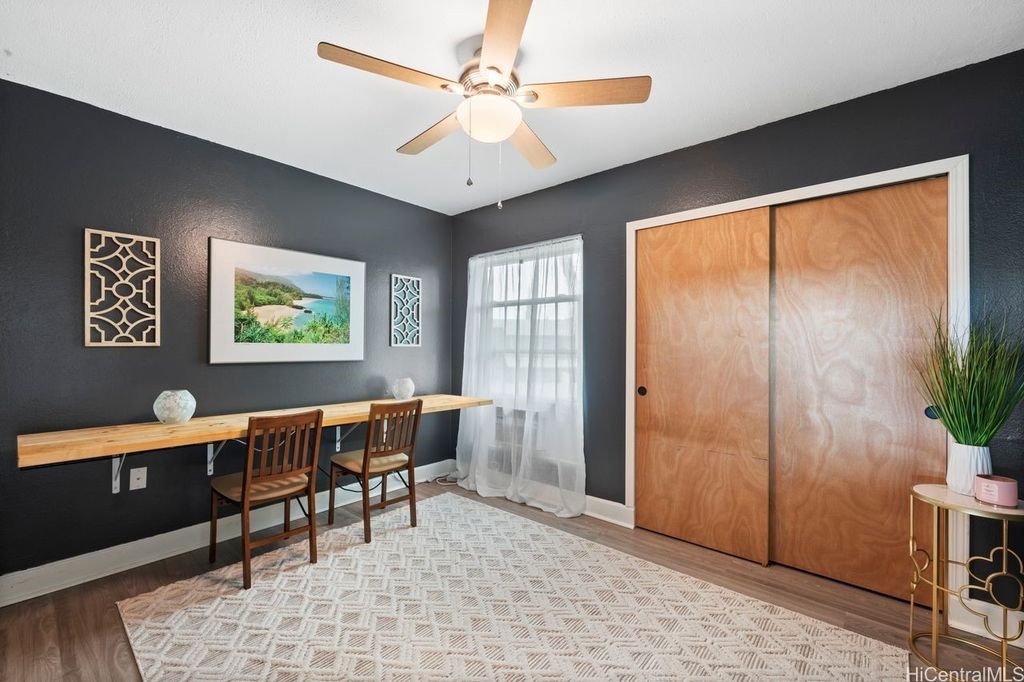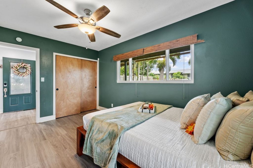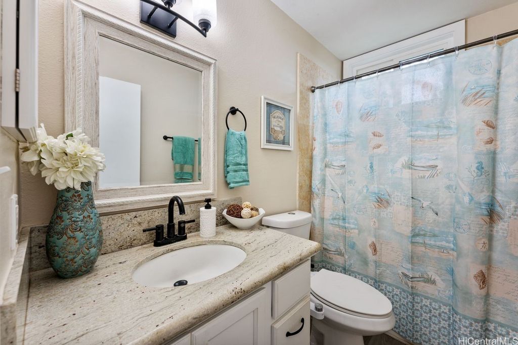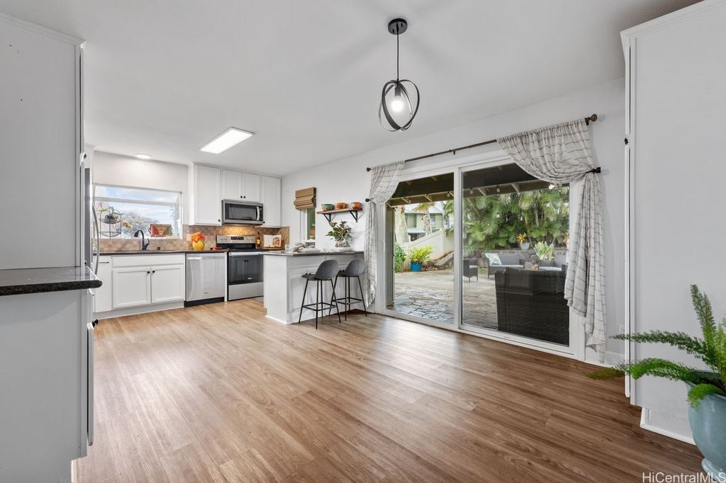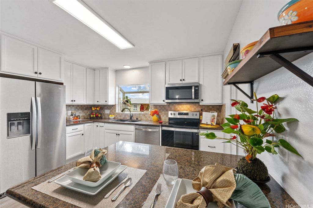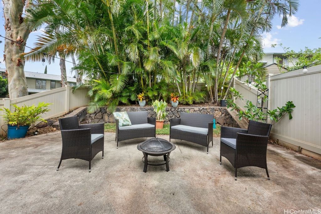 Highly desired corner-end townhouse in a peaceful community! This spacious home features 3 bedrooms plus a loft/office that can be used as a 4th bedroom. Fresh interior paint throughout. Enjoy a private balcony with views of the ocean and Makakilo Park. The wraparound yard has a resort-like feel with a covered patio, stonewall garden, and fruit trees. Two covered parking stalls are located in front of the unit. Interior highlights include LVP flooring, granite countertops, tiled baths, pull-out cabinet shelves, ceiling fans, and double-pane windows. Spacious attic with pull-down access. One of only six homes in the community with front-covered balconies. Transferable security system and energy-efficient appliances. Conveniently located near parks, shopping, bus stops, and freeway access.