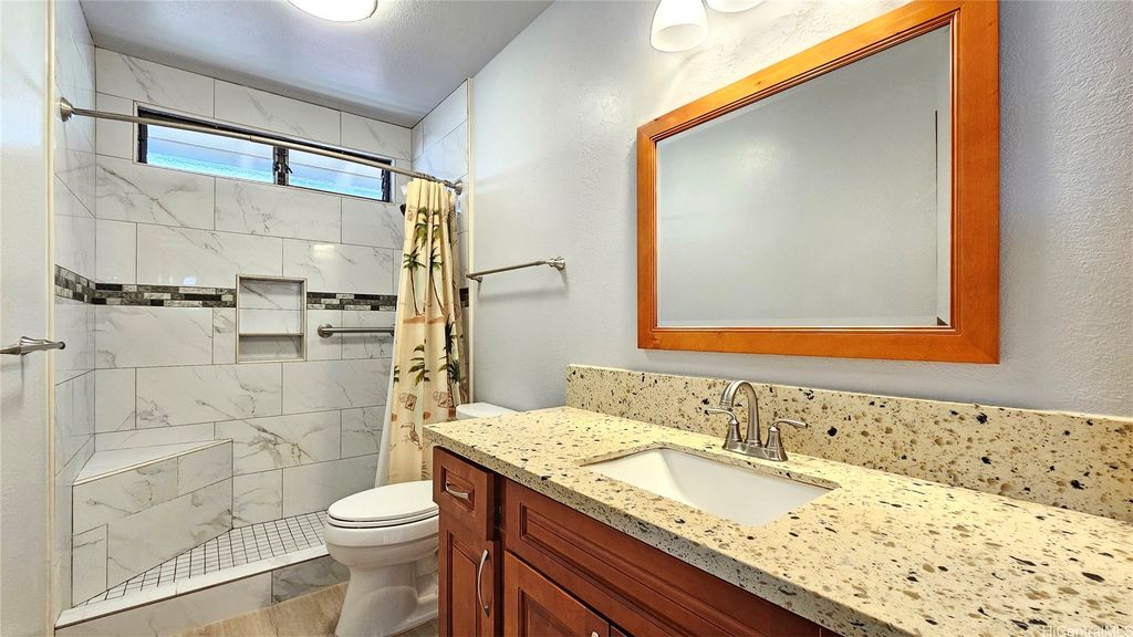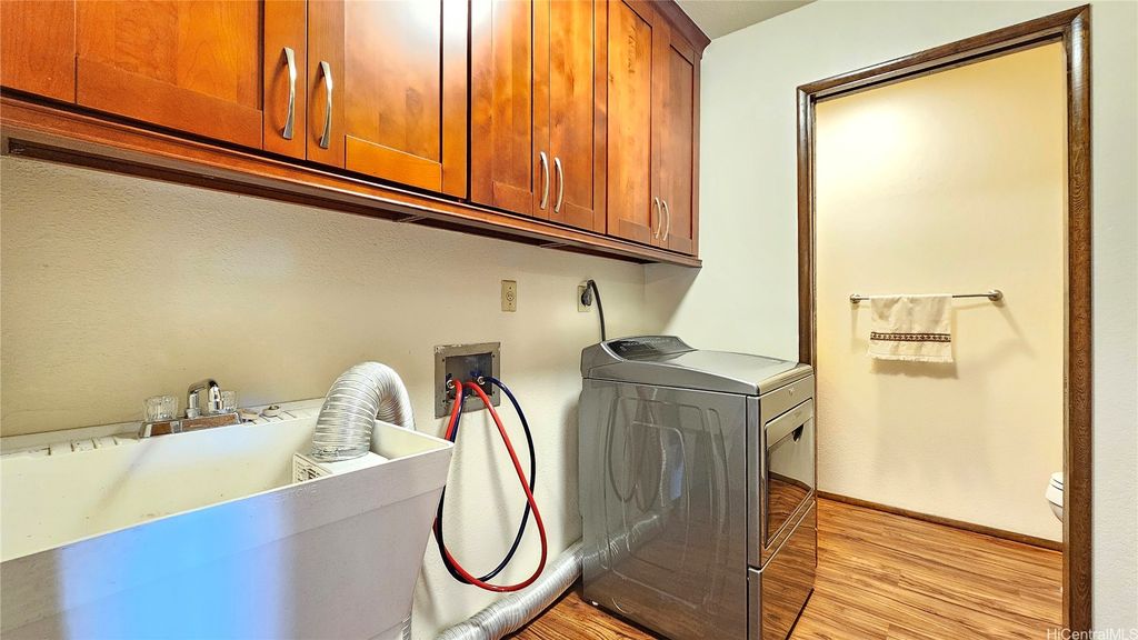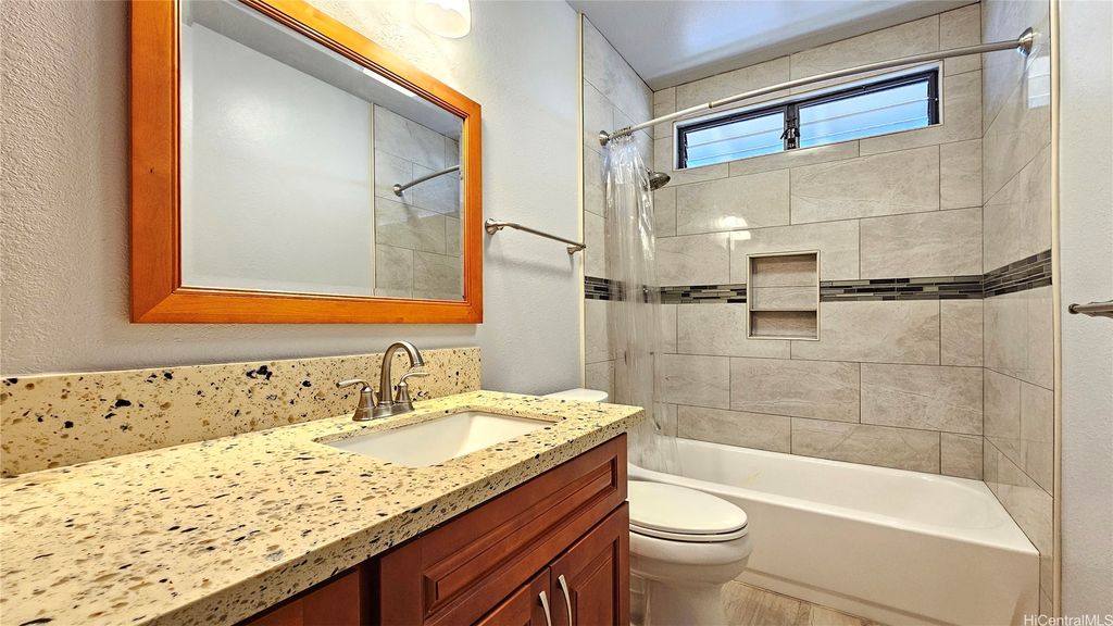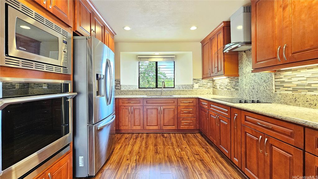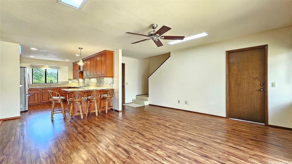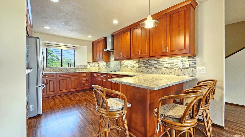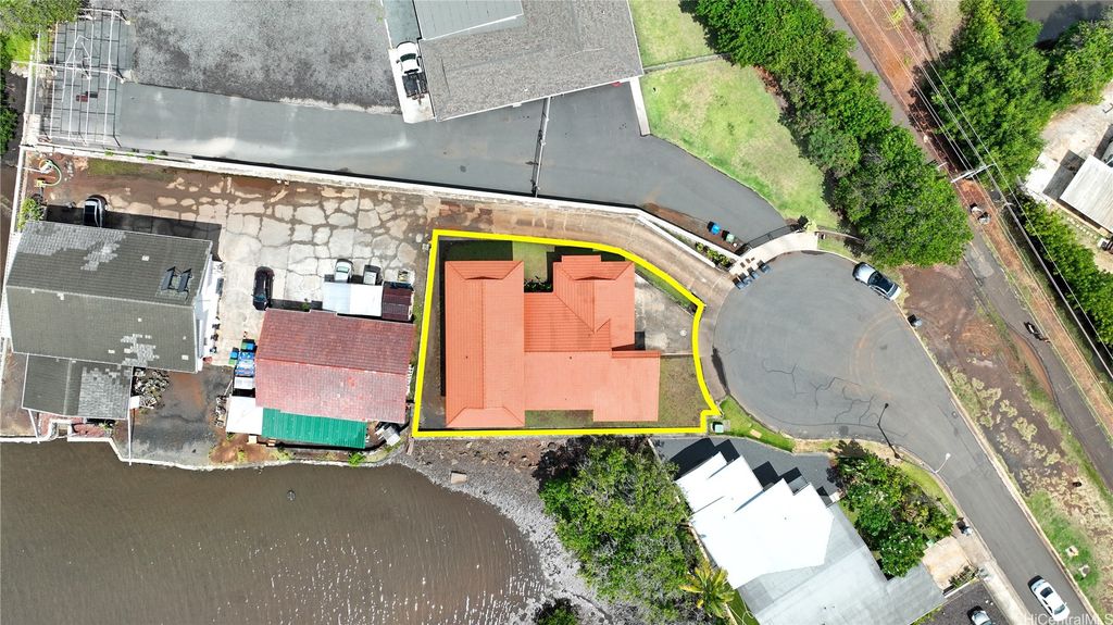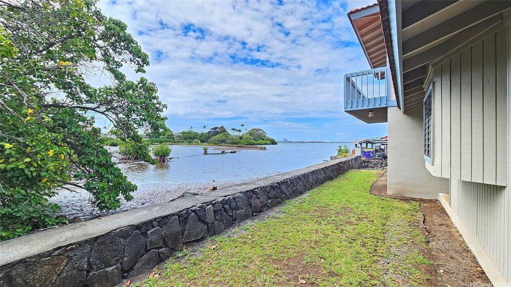 This beautiful two-story waterfront home, built in 1986, is located in a quiet cul-de-sac on Aiea Kai Way in Aiea. Offering 2,572 square feet of comfortable living space on a level 6,083 square foot lot, the residence features three bedrooms and two and a half bathrooms, perfect for families or those who enjoy spacious living. The kitchen and the two and a half bathrooms were renovated in 2017, featuring new cabinets, solid surface countertops, and luxury plank flooring throughout. During the renovation, appliances were upgraded to include a built-in microwave and cooktop stove. In 2021, a stainless-steel refrigerator with an ice maker was added, and an oven was purchased in 2023 to complete the kitchen appliance set. The downstairs rear level of the property is connected to the main house but has a separate entry, and it has been roughed in to allow a new buyer to customize and complete their own improvements. One of the highlights is the wood deck on the second floor, which overlooks Loko Pa'aiau Fishpond and Pearl Harbor. Exterior painted in January 2025. Home to be sold in "AS IS" condition.