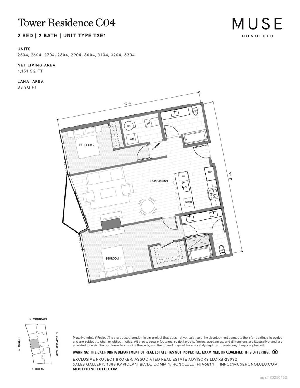 Introducing Muse Honolulu, Ala Moana's newest luxury development featuring a dynamic collection of 315 thoughtfully designed residences, including two-story Townhomes, Urban Lofts, and Tower Residences. This 2-bedroom, 2-bathroom, 2-parking residence offers 1,151 square feet of interior living space and a lanai to enjoy to ocean and city views. This residence features top-of-the-line appliances, including Sub-Zero refrigeration, Wolf cooking appliances, and Cove dishwashers"”hallmarks of premium craftsmanship. Additional highlights include approximately 9'3" ceiling heights, elegant engineered wood flooring, plush carpeting in the bedrooms, and premium Studio Becker cabinetry. Residents can also enjoy three levels of resort-style amenities, or explore the neighborhood and experience the convenience of world-class shopping, dining, and entertainment all just moments away. *Photos are renderings and/or enhanced images. Property tax information is not yet available as Muse Honolulu is a new development. Future tax assessments will be determined by the City & County of Honolulu upon project completion.