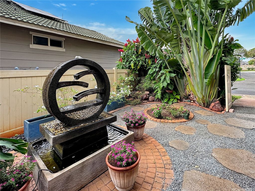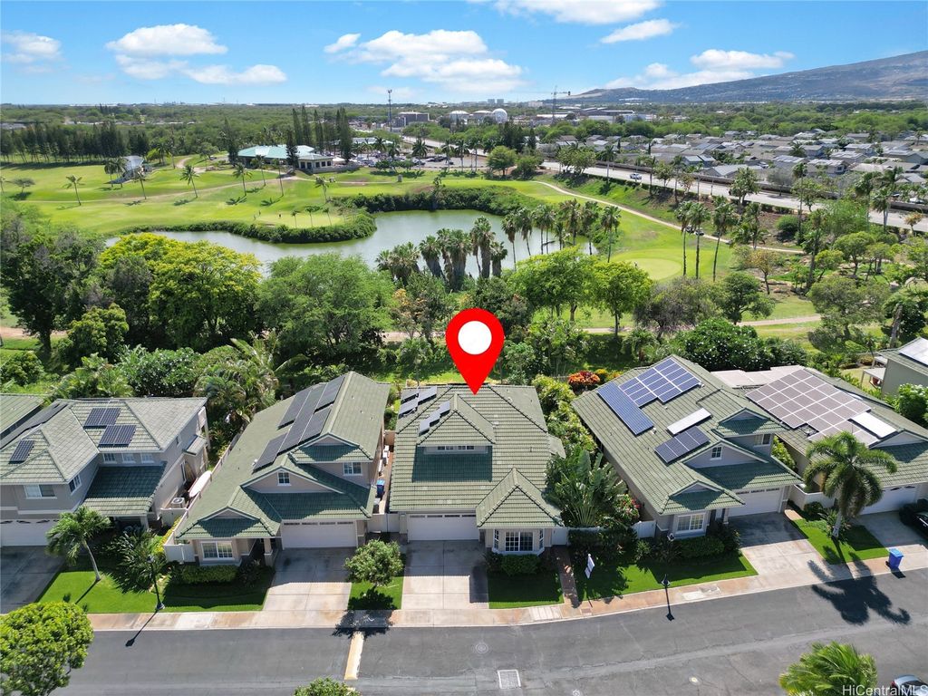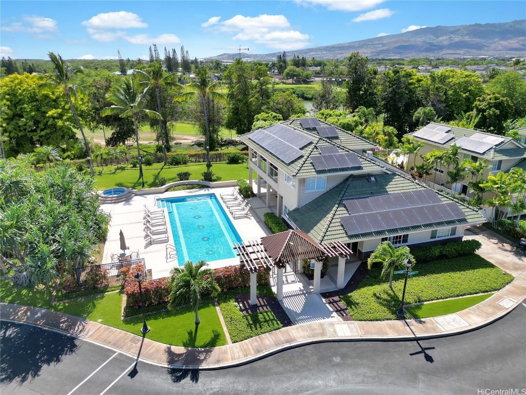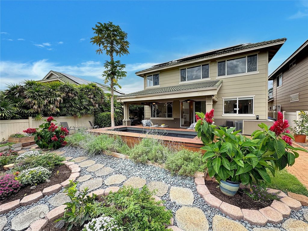 Welcome to your dream home with a VA assumable mortgage at 2.25% and $618,000 balance in the prestigious gated community of Hu'elani, with stunning views of the Coral Creek Golf Course. Enjoy resort-style amenities, including a community pool, hot tub, gym, and clubhouse"”perfect for social gatherings. This 3-bedroom, 2-bathroom home offers 1,934 sq ft of luxurious living space. A convenient ground-floor bedroom and full bath make it ideal for guests or multi-generational living. The formal dining room could easily be converted into a fourth bedroom. The upgraded kitchen features custom cabinetry and a bar, perfect for culinary enthusiasts. With an owned 22-panel photovoltaic system and central A/C, this home is energy-efficient and comfortable year-round. Additional highlights include custom pantry shelving, a 2-car garage, and spacious walk-in closets. The serene backyard boasts a large lanai, pond, and zen garden"”perfect for relaxing and enjoying the views. Experience upscale living in this exceptional property!
