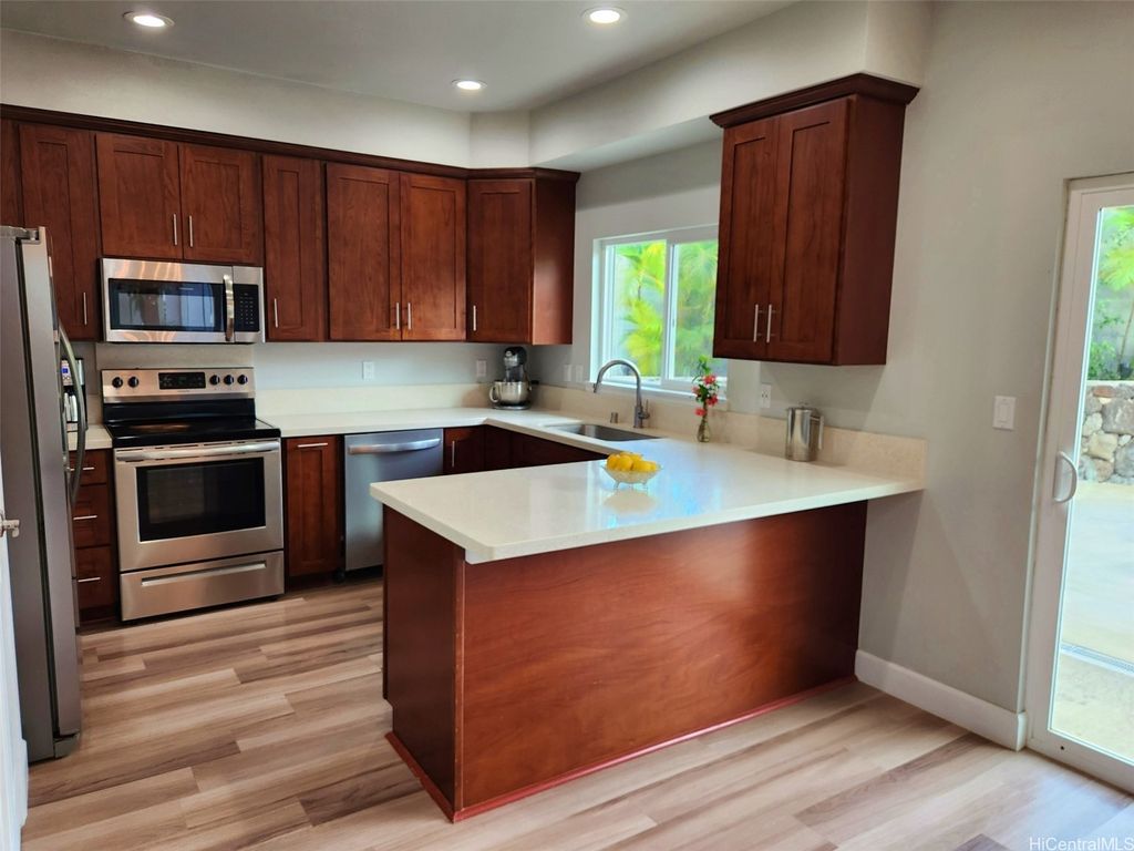 Constructed in 2019, 4-bed, 3.5-bath Kahaluu home w/ stunning mountain views from nearly every window! Open floor plan features a 2-story living room with abundant light, flowing into a dining area & modern kitchen with quartz counters, stainless steel appliances & solid wood cabinets. Wood look laminate floors throughout. The primary suite boasts a tiled jetted tub, large tiled shower & dual vanities. Three upstairs bedrooms feature private balconies, while the convenient downstairs bedroom offers its own private bathroom, with laundry facilities conveniently located in the garage. Enjoy outdoor living on the concrete lanai or in the side yard with lawn & fire pit. Lush landscaping, including banana, papaya, and coconut, with an irrigation and drainage system. Prime location on a quiet street next to Kahaluu Elementary School, Kahaluu Regional Park & boat ramp. Close to Kualoa Ranch & Chinaman's Hat. The house is equipped with a solar panel that heats the water. Your Oahu oasis awaits!