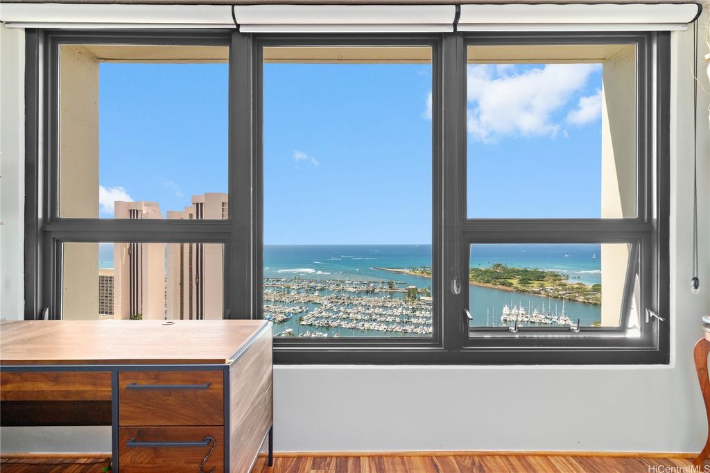 PRICE REDUCTION ~ PANORAMIC VIEWS! Picture yourself waking up looking at the beautiful blue Pacific Ocean, Magic Island at Ala Moana Beach Park; and also watching Friday night fireworks! PERFECT LOCATION! Across the Ala Moana Shopping Center for dining and shopping, and located at the entrance to Waikiki for more! The preferred Diamond Head Tower is closer to the resort-like amenities that Yacht Harbor Towers offers: Heated Pool, Hot Tub, Rec Center and BBQ areas, tennis court and exercise room. The unit has beautiful Koa LVP flooring, and custom-built shelving in the main hallway leading to the bathroom; "must-see" to appreciate the value of this unit. Primary bedroom with Ocean Views, has it's own hallway leading to the ensuite bathroom and walk-in closet, with the washer/dryer in the unit. Second bedroom is located at the ocean front side of the unit, with direct ocean and sunset views; currently set-up as an office. All previous Assessments have been paid. Seller asks to consider using Luke Tyler Taniguchi, Title Guaranty Kailua Office