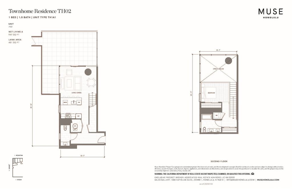 Introducing Muse Honolulu, Ala Moana's newest luxury development featuring a dynamic collection of 315 thoughtfully designed residences, offering three distinct home types; two-story Townhomes, Urban Lofts, and Tower Residences. Townhome Residence 702 is located on the 7th-floor amenity deck and offers the feel of a detached residence, offering a spacious two-story layout with approximately 947 interior square feet and a generous 481-square-foot outdoor deck. In addition, elevated living with soaring ceiling heights of approximately 23 feet in the living room, floor-to-ceiling glass windows, engineered hardwood floors and convenient direct access to amenities from your front door. *Photos in this listing are renderings and/or enhanced images. *Property tax information is not yet available as Muse Honolulu is a new development. Future tax assessments will be determined by the City & County of Honolulu upon completion.