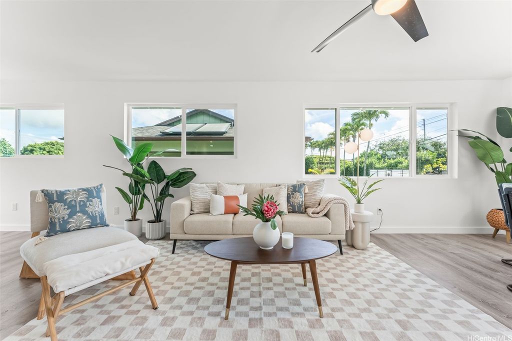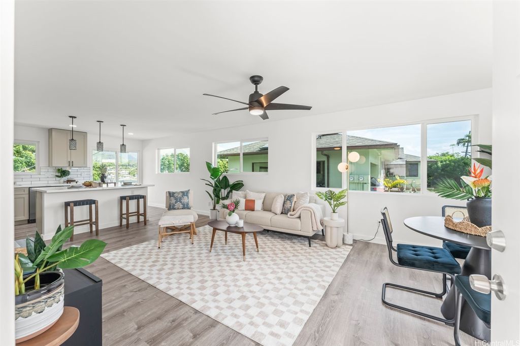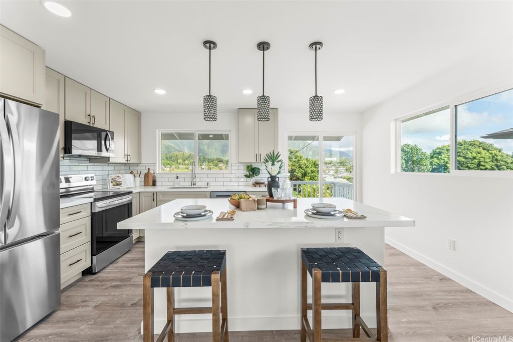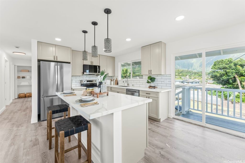 Settled peacefully against the glorious backdrop of Kaneohe's world famous Ko'olau Mountain range, this house is refreshed and ready for a new family to call it home! After being owned by one family for over half a century, the property was remodeled in 2025 from the inside out. This stunning single family home boasts a brand new shingle roof, electrical rewiring (including a new breaker panel and meter), upgraded plumbing, and a complete overhaul of the interior, including, but not limited to, new vinyl flooring, new bathrooms, new kitchen cabinets, new windows, and a crisp coat of paint to top it all off. Relax with friends and family in your spacious living room where views of the mountains and palms surround you, or take the party outdoors to your walled front yard and bask in the scent of the flowering trees. Ideally located just a short distance from Kane'ohe Beach Park, Kaneohe Bay, Windward Community College, and smack dab in between Windward Mall and Windward City Shopping Center. Island living is made easy here!