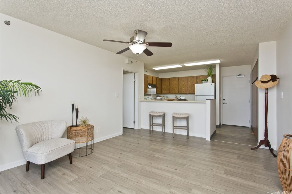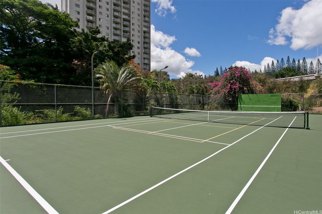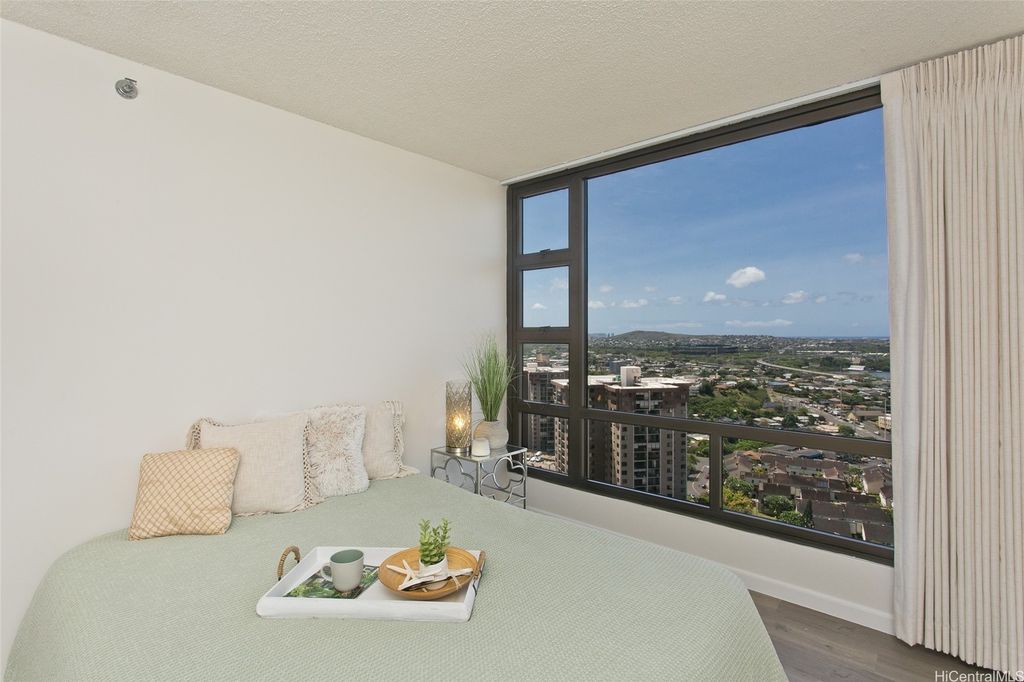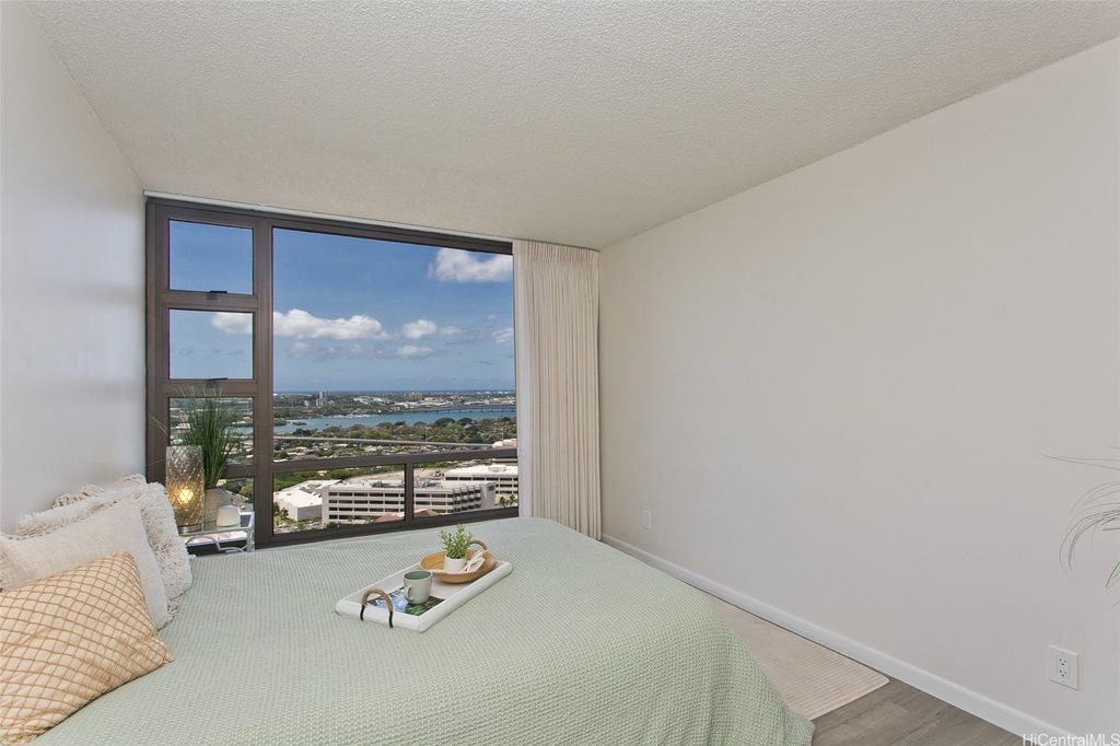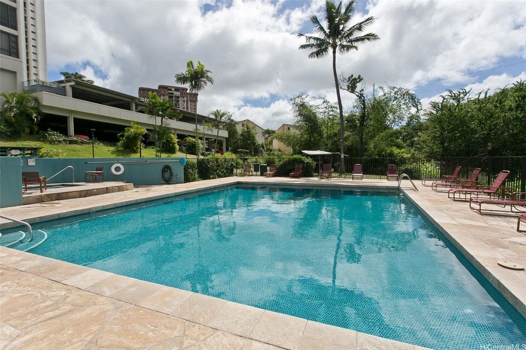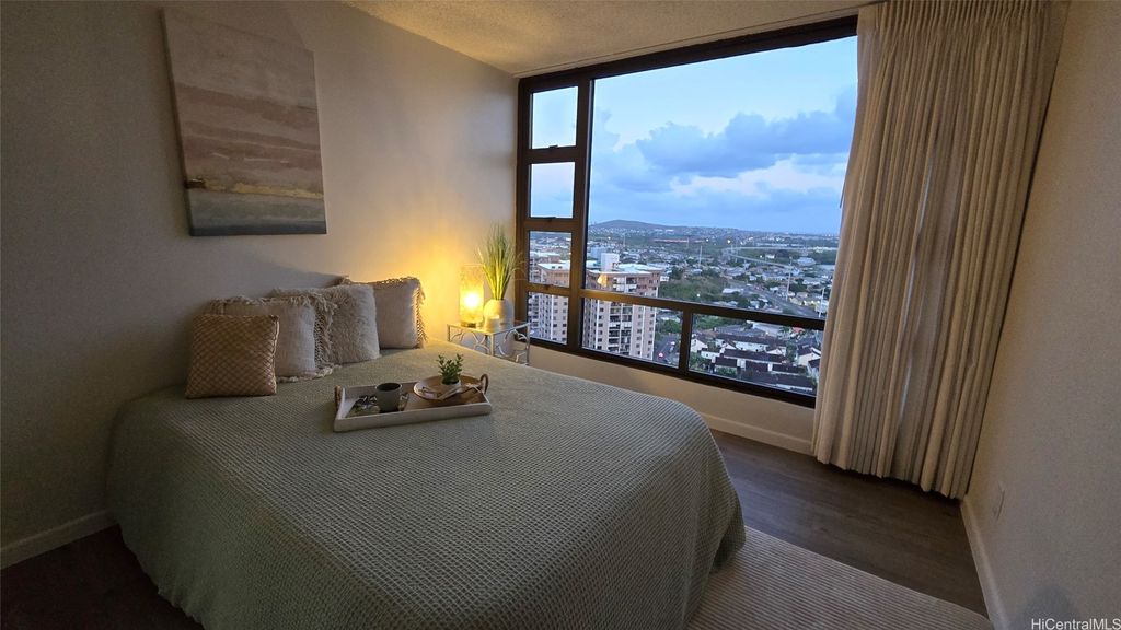 Capture the breathtaking panoramic views from this airy one-bedroom penthouse. The unit has been meticulously kept and recently renovated with new flooring and paint. This secure building is centrally located and has lots of amenities. There's a full-size pool, a separate children's pool, a Jacuzzi, a pavilion, a BBQ area, a car wash, a recreation center, tennis courts, playgrounds, a gym, and additional storage. TWO separate parking spaces are conveniently located close to the lobby, with guest parking also available. Find yourself falling asleep and waking up, suspended in an infinity view from Diamond Head to Ford Island and beyond. The building is pet-friendly, sprinklered, and is hurricane-insured.