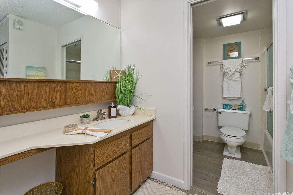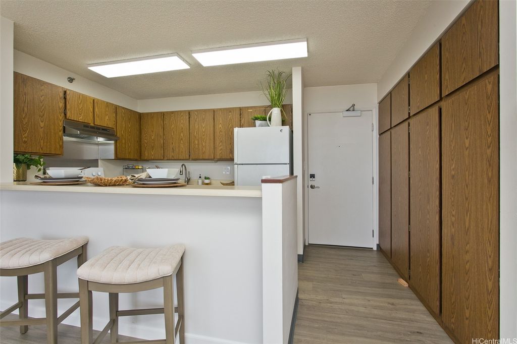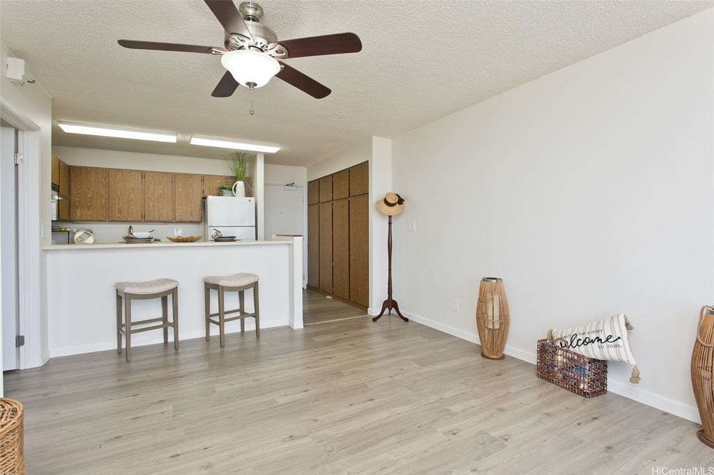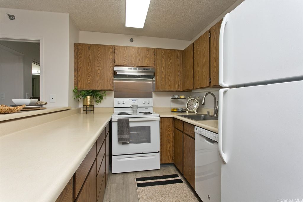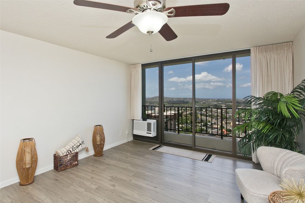 Capture the breathtaking panoramic views from this airy one-bedroom penthouse. The unit has been meticulously kept and recently renovated with new flooring and paint. This secure building is centrally located and has lots of amenities. There's a full-size pool, a separate children's pool, a Jacuzzi, a pavilion, a BBQ area, a car wash, a recreation center, tennis courts, playgrounds, a gym, and additional storage. TWO separate parking spaces are conveniently located close to the lobby, with guest parking also available. Find yourself falling asleep and waking up, suspended in an infinity view from Diamond Head to Ford Island and beyond. The building is pet-friendly, sprinklered, and is hurricane-insured.