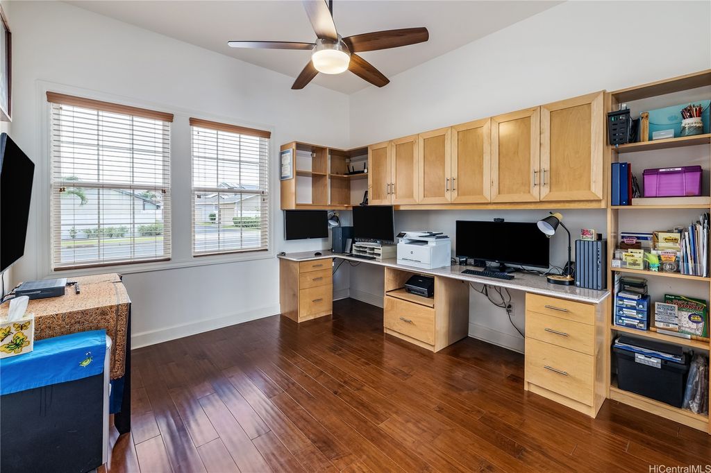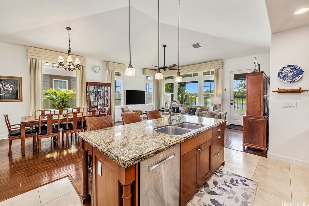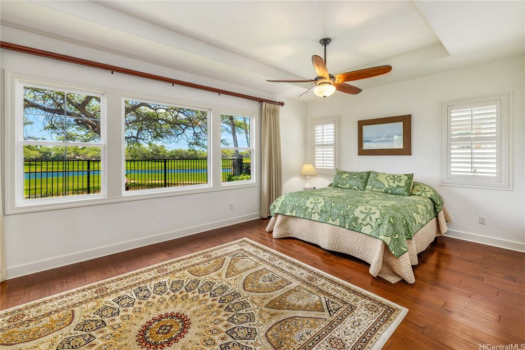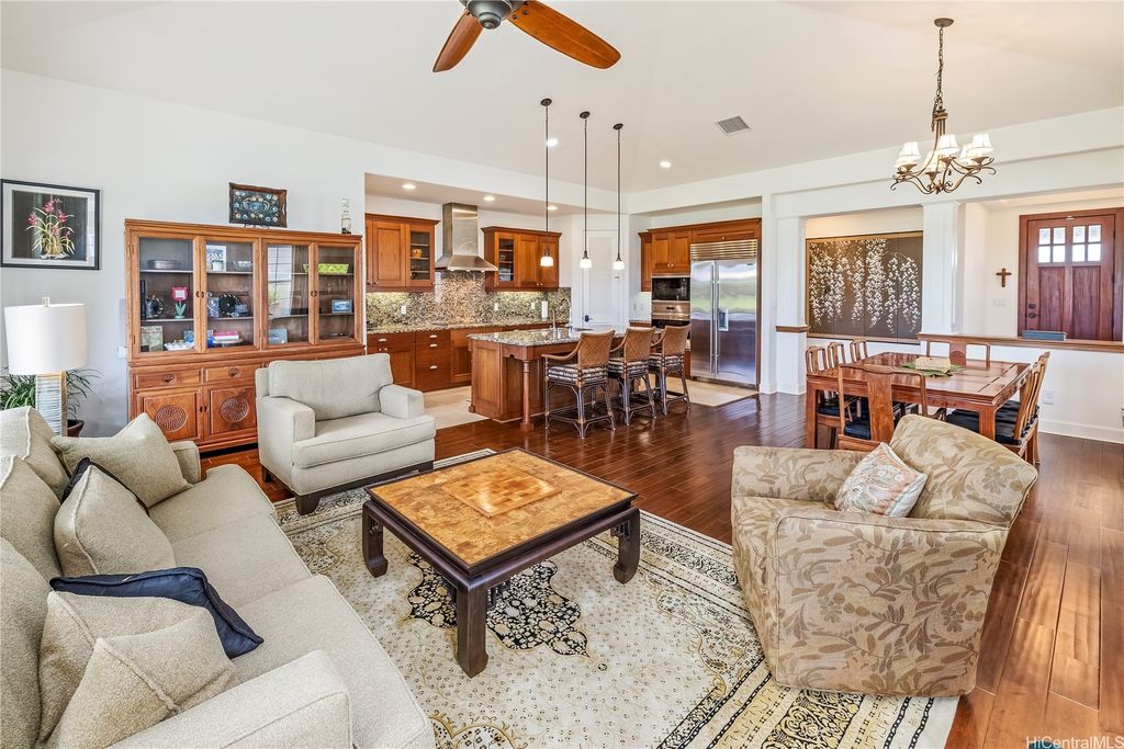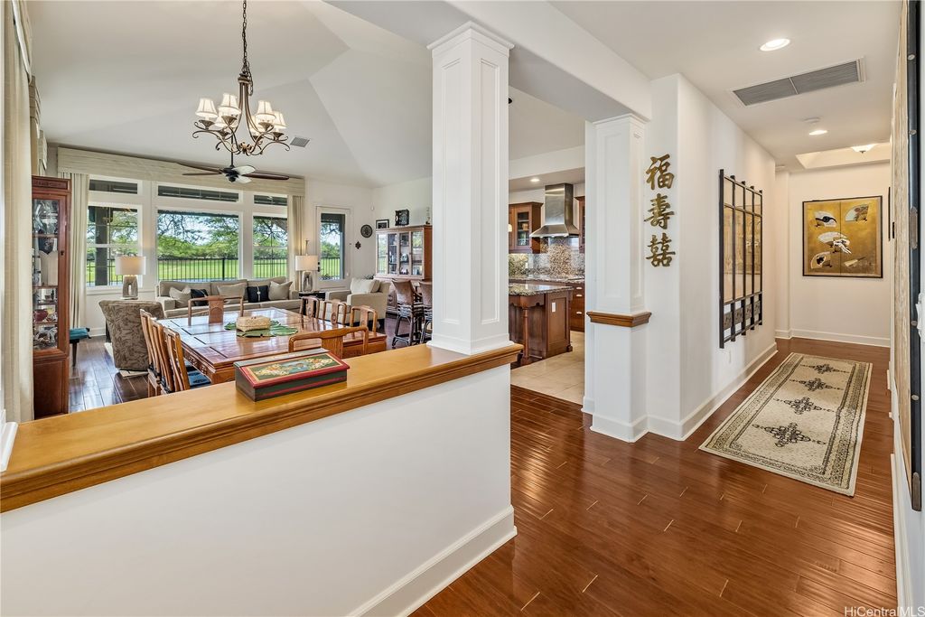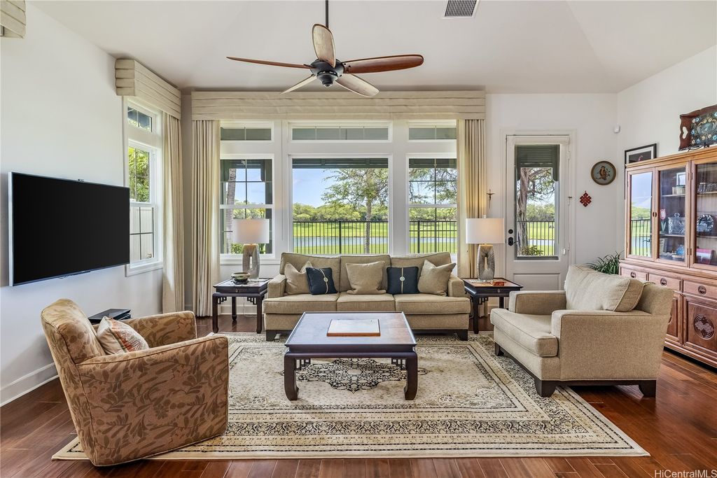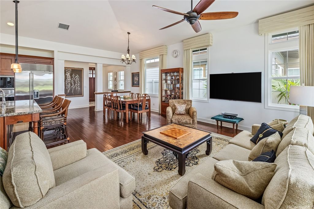 Golf Course frontage living at it's best! This stunning, SINGLE LEVEL home is located in the prestigious neighborhood of Hoakalei-Ka Makana and right on the 8th fairway with water and gorgeous green views ! This location, known as the " Golden Mile" of Kaiokia Street is because of the location on fairway and the water views. You are not just buying a home here, you are buying a lifestyle. Home has a close proximity to the Hoakalei Country Club/restaurant known as "Reflections" with renowned Chef Roy Wong. Memberships to golf, dining & social memberships are available to residents. Also close by the Wai Kai Wave Pool for some exciting and wild surfing/Body boarding fun! Entire home has been meticulously cared for from original owner and it shows! You will love cooling your home with the sun as home comes with 23 OWNED PV system under original NEM Agrmt.with Hawaii Electric. Solar hot water and solar attic fans. Average energy bill between $18.00 to $50.00/MO. HOA fee's cover Internet/land line phone, sec. patrol and use of nearby community pool, fitness center, and tennis/paddle ball courts. Bonus, 2 stand up attic areas. Garage has work bench and lab grade storage cabinets.