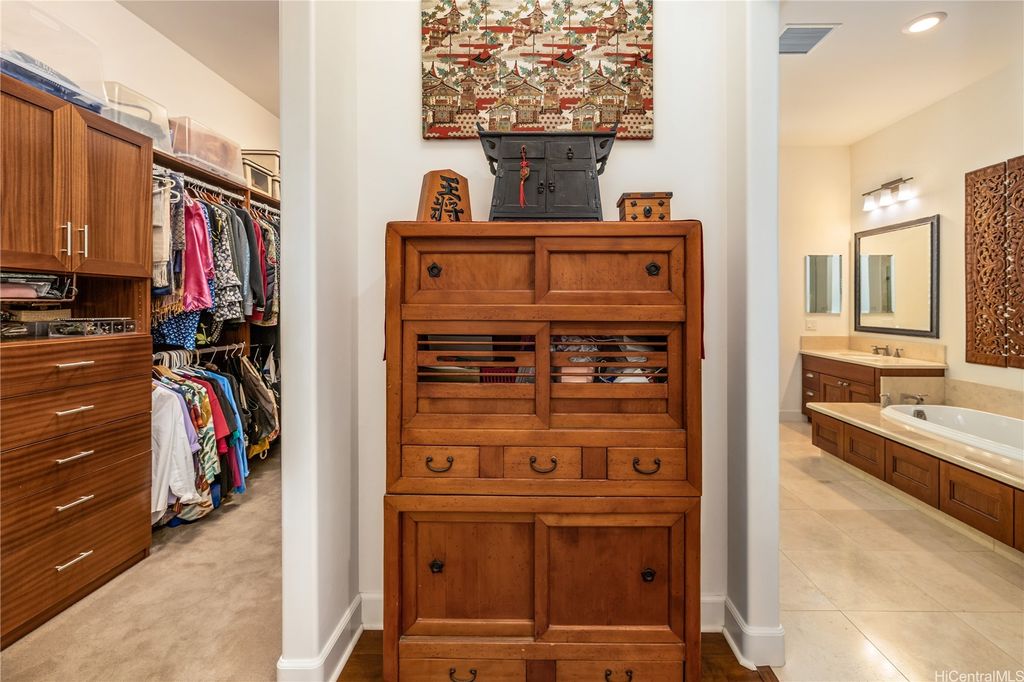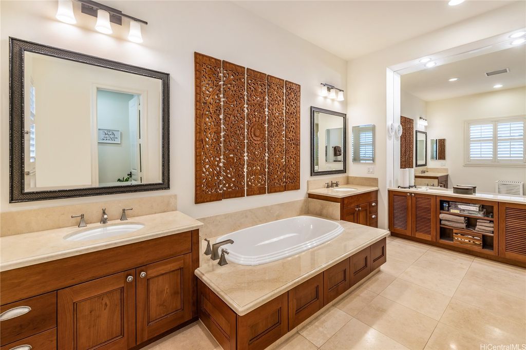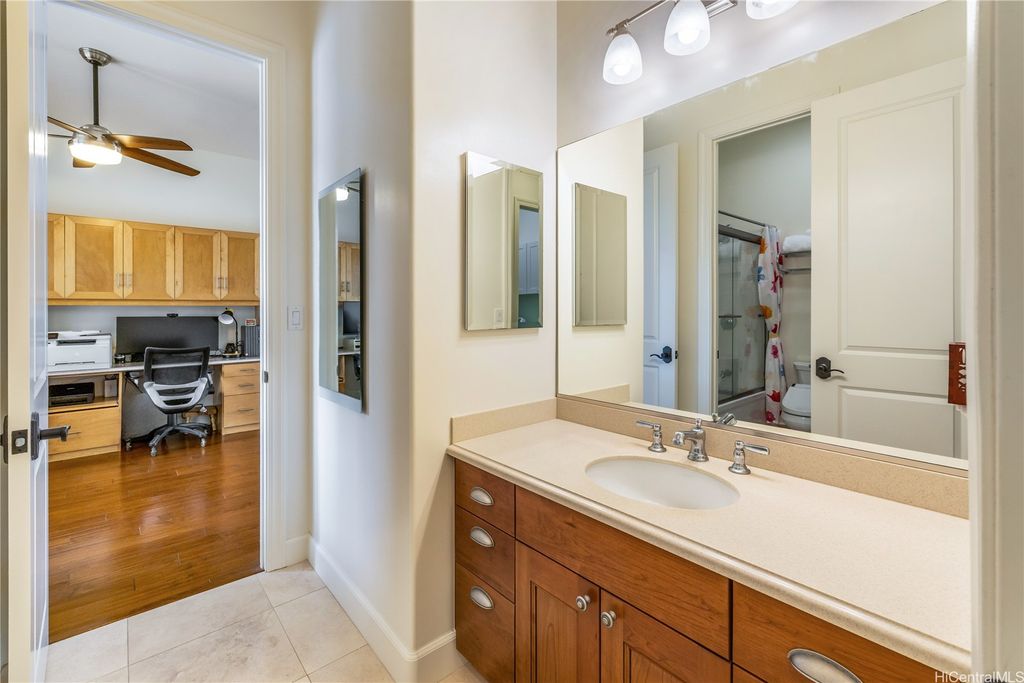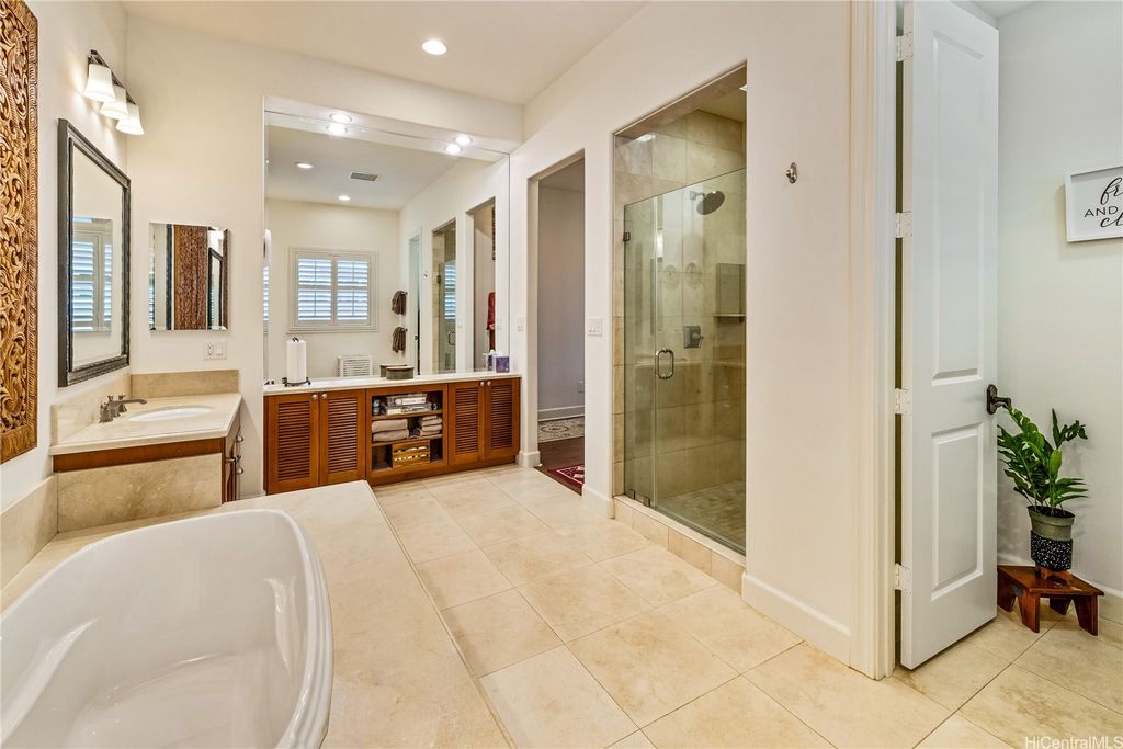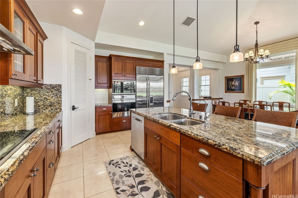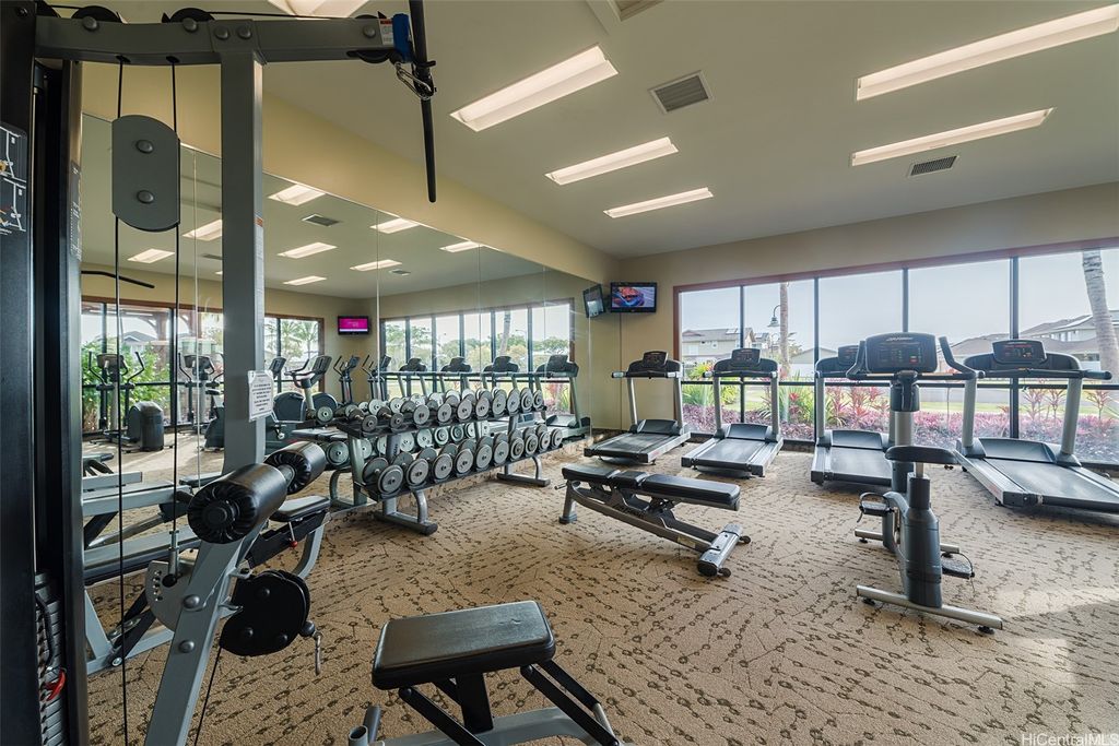 Golf Course frontage living at it's best! This stunning, SINGLE LEVEL home is located in the prestigious neighborhood of Hoakalei-Ka Makana and right on the 8th fairway with water and gorgeous green views ! This location, known as the " Golden Mile" of Kaiokia Street is because of the location on fairway and the water views. You are not just buying a home here, you are buying a lifestyle. Home has a close proximity to the Hoakalei Country Club/restaurant known as "Reflections" with renowned Chef Roy Wong. Memberships to golf, dining & social memberships are available to residents. Also close by the Wai Kai Wave Pool for some exciting and wild surfing/Body boarding fun! Entire home has been meticulously cared for from original owner and it shows! You will love cooling your home with the sun as home comes with 23 OWNED PV system under original NEM Agrmt.with Hawaii Electric. Solar hot water and solar attic fans. Average energy bill between $18.00 to $50.00/MO. HOA fee's cover Internet/land line phone, sec. patrol and use of nearby community pool, fitness center, and tennis/paddle ball courts. Bonus, 2 stand up attic areas. Garage has work bench and lab grade storage cabinets.