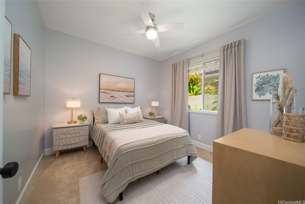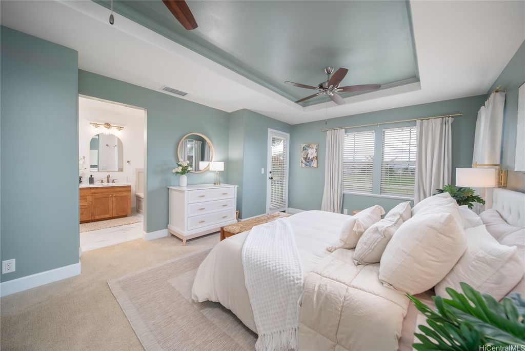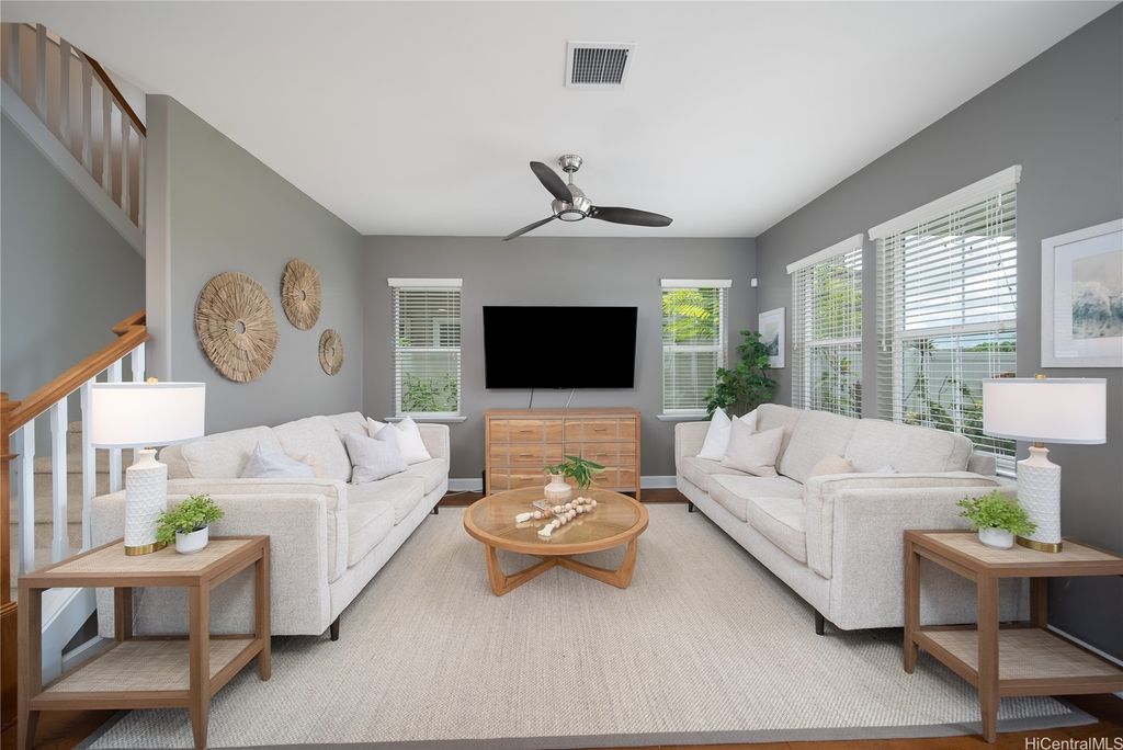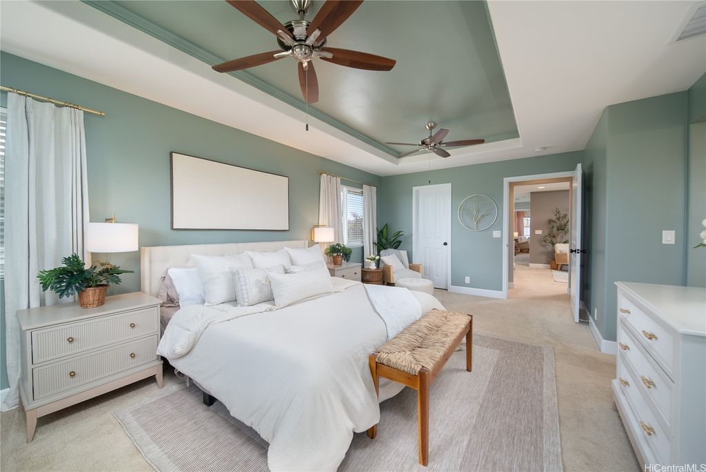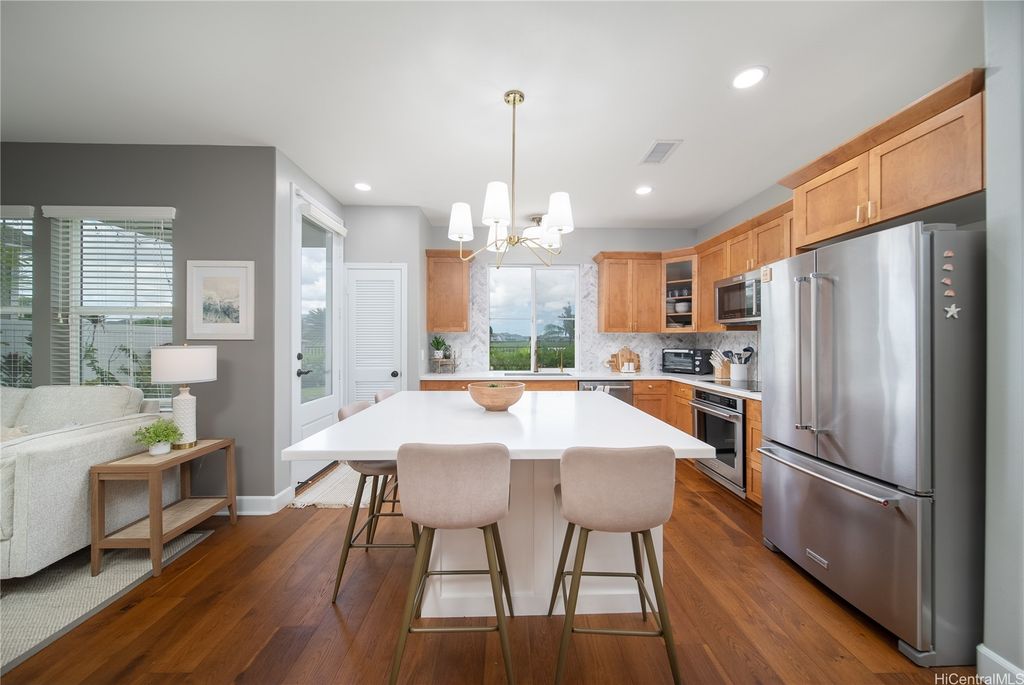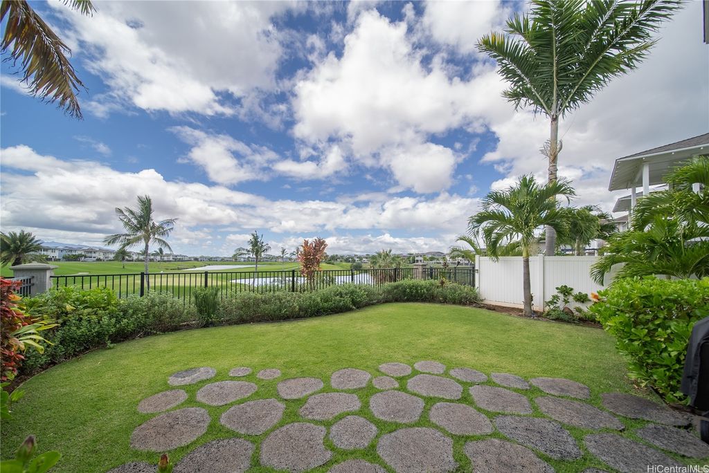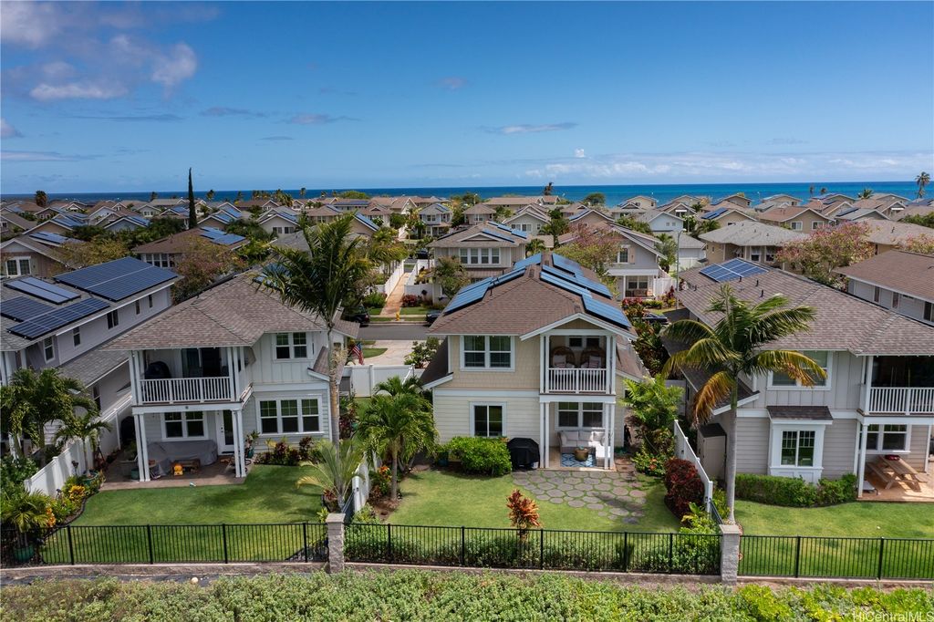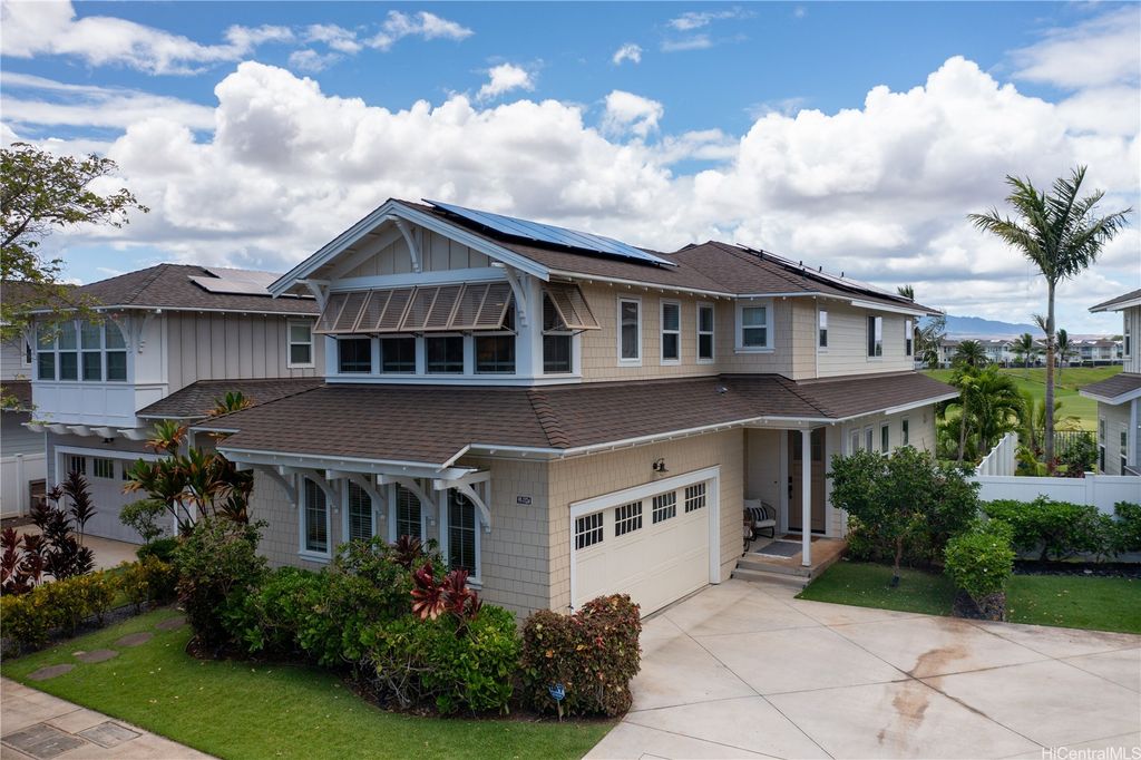 Golf Course Frontage Home & Luxury Upgrades & Stunning Views! This upgraded golf course frontage home offers breathtaking views and is just a short distance to a pristine Hawaiian beach. Never rented and move-in ready, it features real wood flooring, plantation shutters, and crown molding in the primary suite. Stay comfortable with central A/C and six ceiling fans. The upgraded kitchen boasts an expanded island, while the remodeled bathroom adds elegance. OWNED SOLAR PANELS enhance energy efficiency. From the primary suite's covered lanai, take in stunning sunsets over Hoakalei's golf course and water features. The lush yard with tropical blooms creates a serene escape. Just a 10-minute walk to One"˜ula Beach and close to surf spots and the LineUp at Wai Kai, featuring dining, shopping, and a world-class wave pool. With resort development on the horizon, this home's value and appeal will continue to grow. Don't miss this rare opportunity to own a luxury golf course home in paradise!