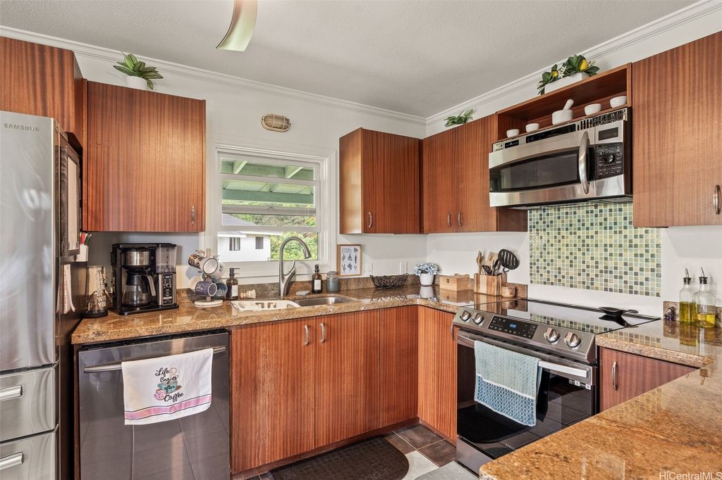 Welcome to your island retreat in beautiful Kaaawa. This spacious 4-bedroom, 3-bathroom home is nestled in a quiet cul-de-sac just steps from a white sand beach. Ideally located near BYU-Hawaii and the Polynesian Cultural Center, it's a perfect fit for first-time buyers or anyone wanting to be close to stunning beaches, quality education, and a vibrant coastal community. Upstairs, the bright and open layout showcases a remodeled kitchen featuring custom cabinets, granite countertops, and stainless steel appliances"”ideal for both everyday living and entertaining. Step onto your lanai to enjoy sweeping mountain and ocean views, along with the refreshing island breeze. A bonus flex room provides versatile space for a home office, study area, or playroom. Downstairs offers a private bedroom, bathroom, and wet bar"”perfect for guests, extended family, or potential rental income. With 30 owned solar panels and NET metering, you'll enjoy energy efficiency and lower utility bills. Here's your chance to live the island lifestyle, call your Realtor today!
