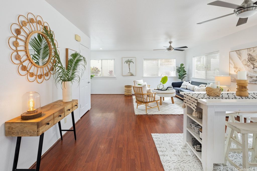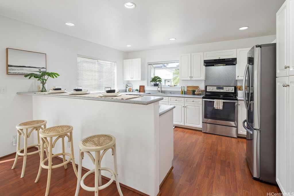 Experience the perfect combination of privacy, comfort, and convenience in this charming 3-bedroom, 2.5-bath home nestled within the desirable gated Seascape community at Makakilo. Enter through the attached two-car garage, where you'll be greeted by the rich, cherry-toned flooring that flows throughout the open-concept main level and new carpet upstairs. The spacious living room seamlessly transitions into the dining area and kitchen, creating an inviting space for entertaining and everyday living. Upstairs, one of the three bedrooms offers serene ocean views, with the primary suite featuring a private en-suite bath for ultimate comfort and convenience. As a resident of Seascape at Makakilo, you'll enjoy access to a host of community amenities while being in proximity to the vibrant city of Kapolei-known as Oahu's "Second City." With easy access to pristine beaches, shopping centers, popular dining spots, and entertainment venues like movie theaters, you'll have everything you need within reach. Plus, the nearby H-1 Freeway makes commuting and island exploration a breeze. Photos are from when the home was staged. No furniture is currently in the home.