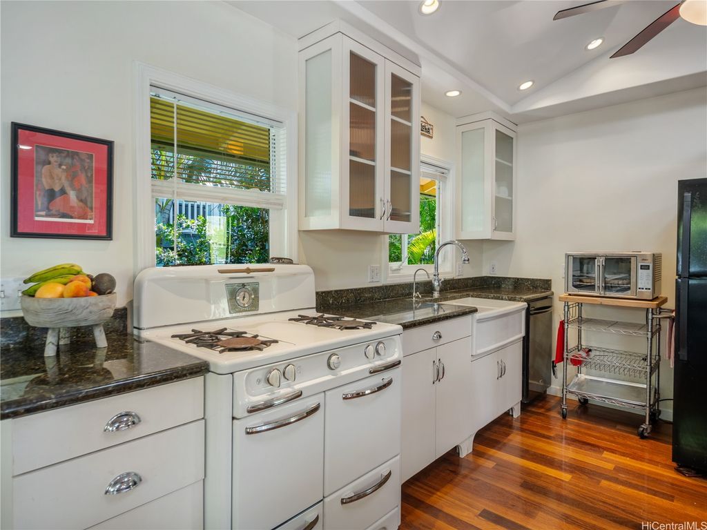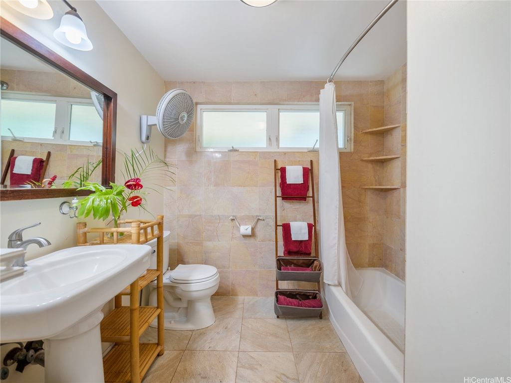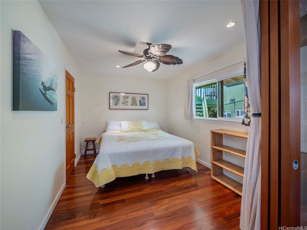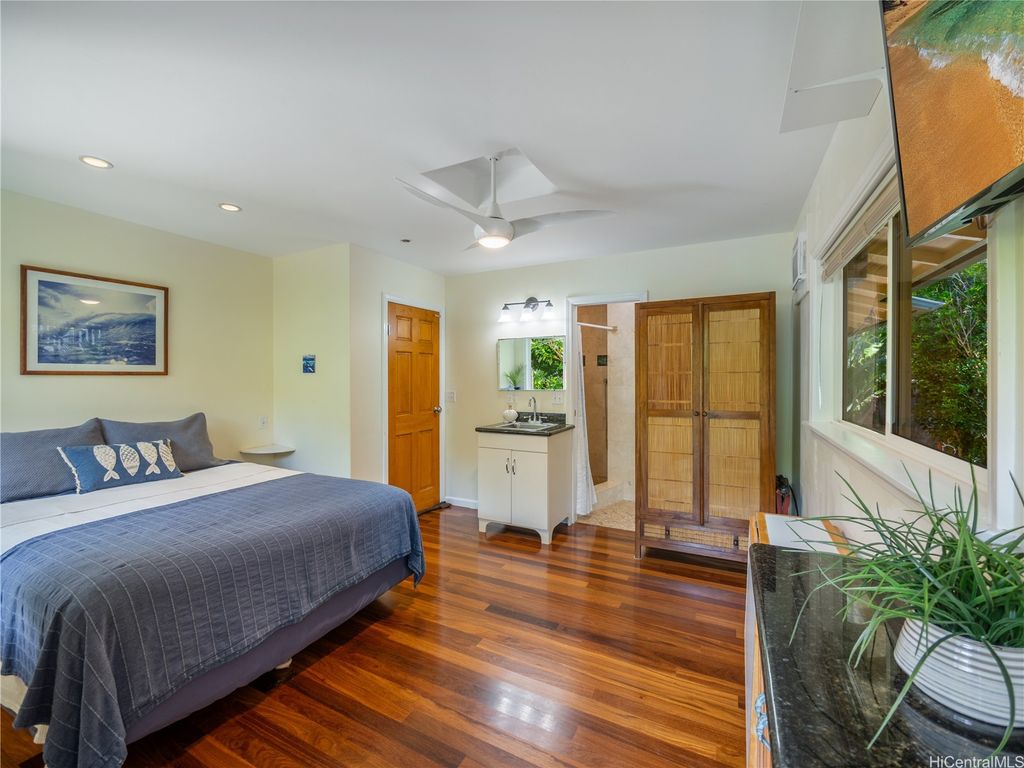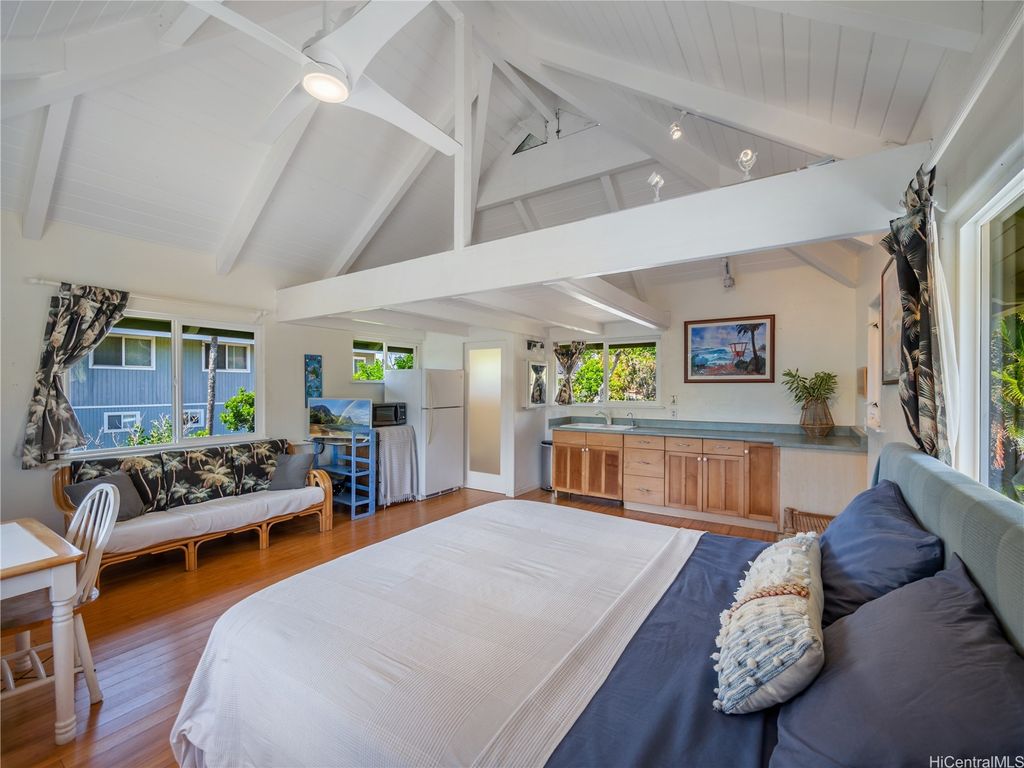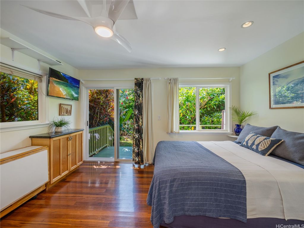 Perfectly positioned in a coveted cul-de-sac between Sunset Beach and Velzyland, this lovingly maintained property invites you to experience the ideal blend of laid-back coastal living and refined island style. Inside, a bright and open floor plan is framed by soaring vaulted ceilings, custom Ohia wood accents, and exquisite Brazilian teak hardwood flooring, bringing warmth, texture, and elegance to every corner. The seamless flow between the living, dining, and kitchen areas makes it easy to stay connected"”whether you're enjoying a quiet evening at home or entertaining friends. Thoughtfully designed for modern flexibility, the separate living area offers the perfect solution for guests or extended family. Outside, lush landscaping wraps around the property, providing both privacy and a serene tropical ambiance. Just steps from the famed North Shore bike path"”stretching nearly four scenic miles from Sunset Beach to Waimea Bay"”you'll enjoy effortless access to legendary surf spots like Rocky Point, Pipeline, and more. Whether you're searching for a peaceful full-time residence or a versatile getaway for your next adventure, this North Shore haven delivers island living at its best.