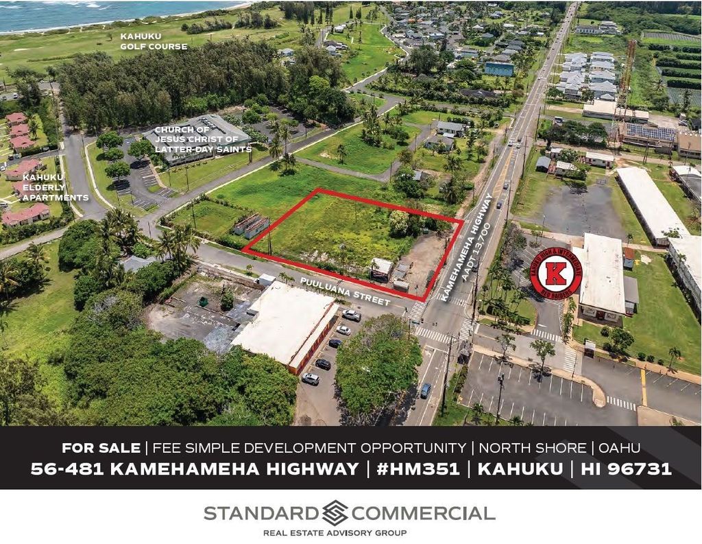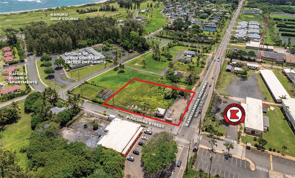 FEE SIMPLE COMMERCIAL LOT IN A PRIME CORNER LOCATION! This rare, large rectangular commercial corner lot offers a unique opportunity to purchase a high-profile parcel along Kamehameha Highway on Oahu's North Shore. The property is ideal for a retail or office development, and a drive-thru is allowed. Located directly across from Kahuku Intermediate & High School (1,400 students), the site is part of the Kahuku Village development, which includes 90 homes/lots currently being sold or developed, and also seconds away from the Kahuku Elderly Apartments (64 units). Existing food trucks provide income to cover carrying costs while a development is completed. The property is ideal for a developer or owner-user interest who wants to take advantage of a large lot with excellent visibility in a supply constrained area. Property could also be available for long-term ground lease as well (contact listing agent).