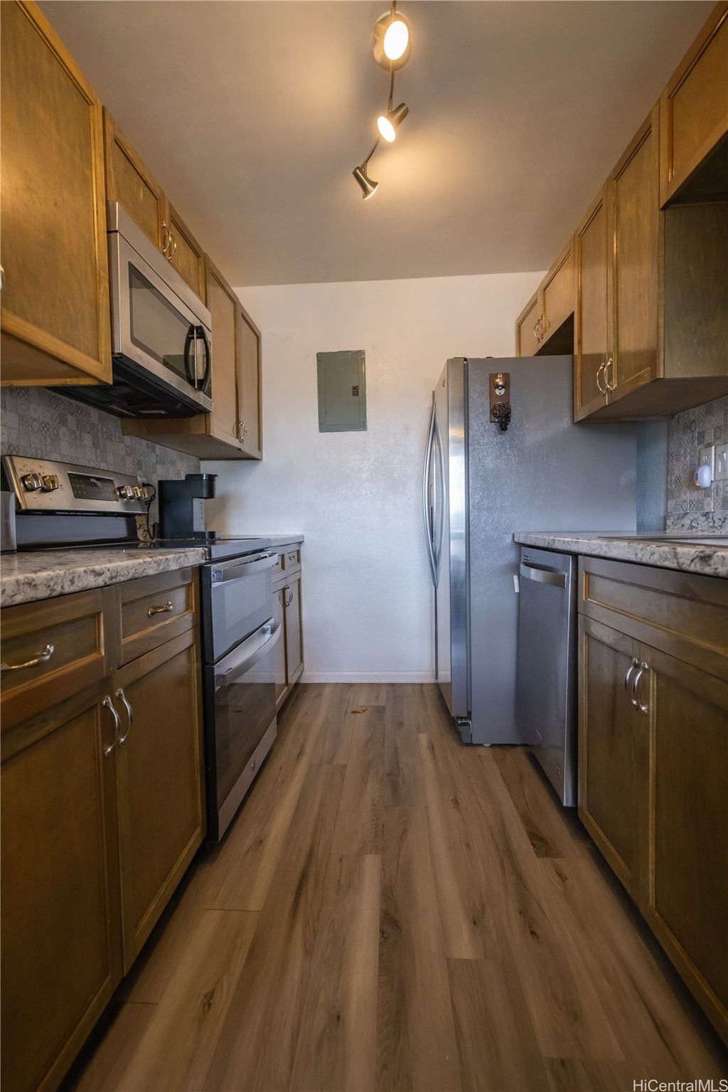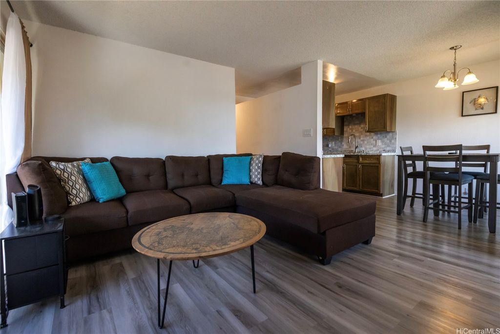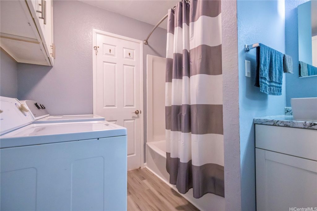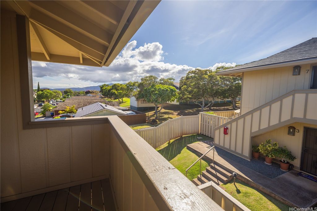 Welcome home to this 2-bedroom, 1-bath corner end unit featuring serene mountain views. Nestled in a quiet, centrally located neighborhood, this renovated unit boasts modern luxury vinyl plank flooring throughout, a custom kitchen with stylish cabinetry and stainless steel appliances, and an upgraded bathroom with a sleek shower/tub enclosure and contemporary vanity. Enjoy the added convenience of an in-unit washer and dryer, plus a cozy covered lanai?perfect for unwinding at sunset or storing your beach essentials. This pet-friendly complex includes one assigned parking stall and ample guest and street parking. Just minutes from Costco, Foodland, Central Oahu Regional Park, and with easy access to both H-1 and H-2 freeways, this home offers comfort, style, and convenience in one exceptional package.