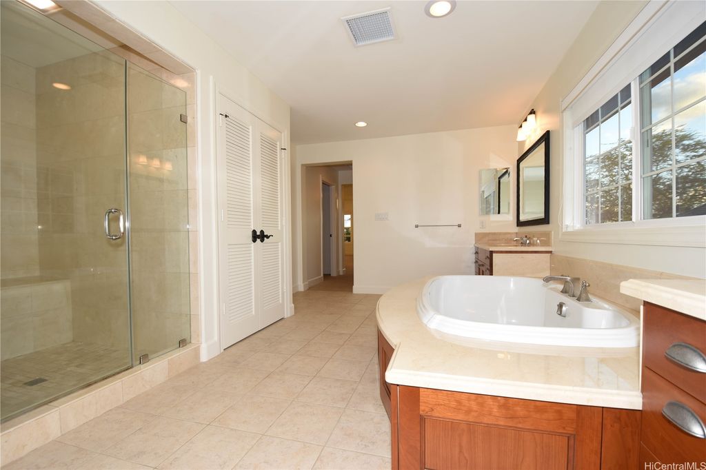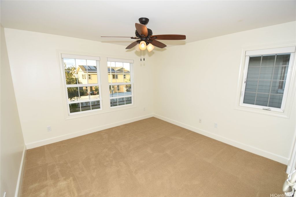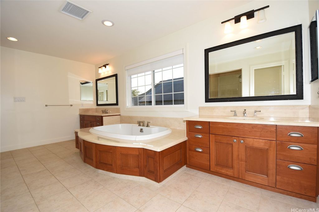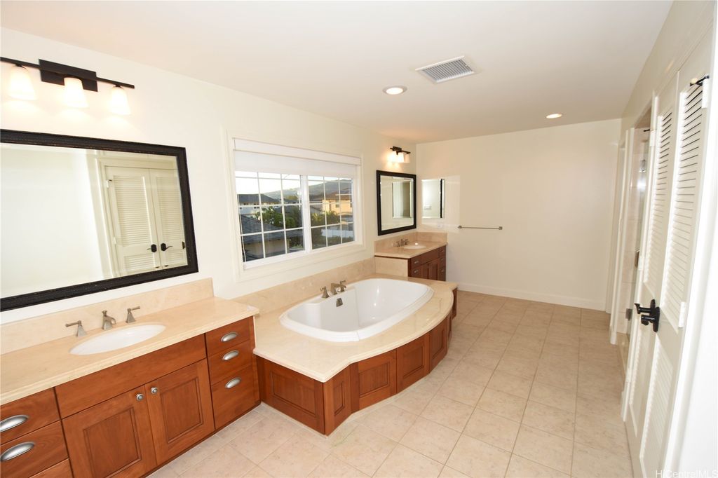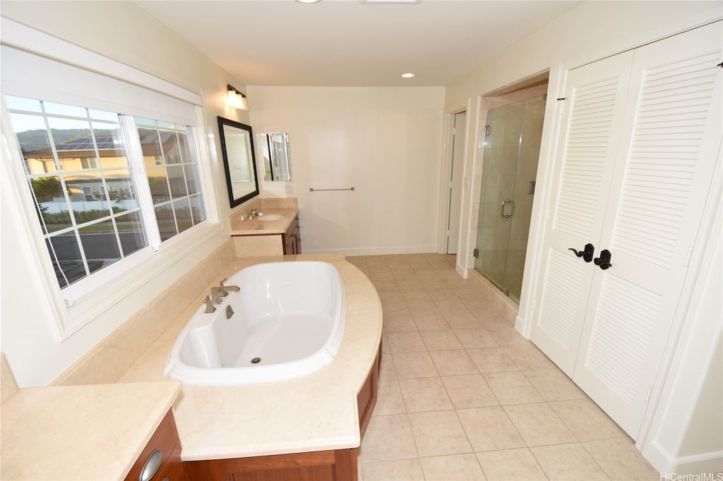 Beautiful 5 bedroom 3.5 bathroom home located on Hole 8 of the private Hoakalei Country Club. The downstairs bedroom is a mother-in-law suite with its own bathroom. There is also an additional 1/2 bath on the first floor. This home features leased Photo Voltaic (PV) Panels that will significantly reduce your electricity bill, a beautiful kitchen with high Subzero, Viking, and Bosch appliances, 18 inch porcelain throughout the first floor, granite countertops, unobstructed views of the 8th hole and pond, landscaped front and backyards, and a 3 car attached garage (tandem) with a 2 car driveway. $50K credit with full price offer.