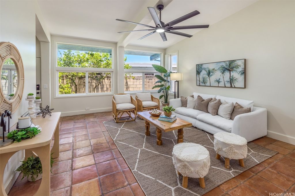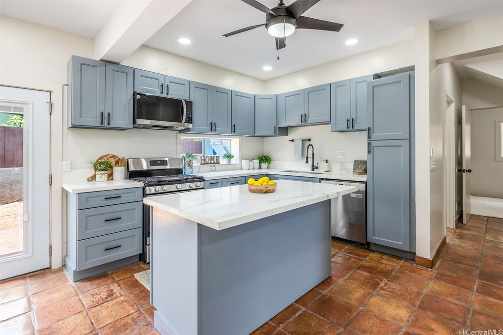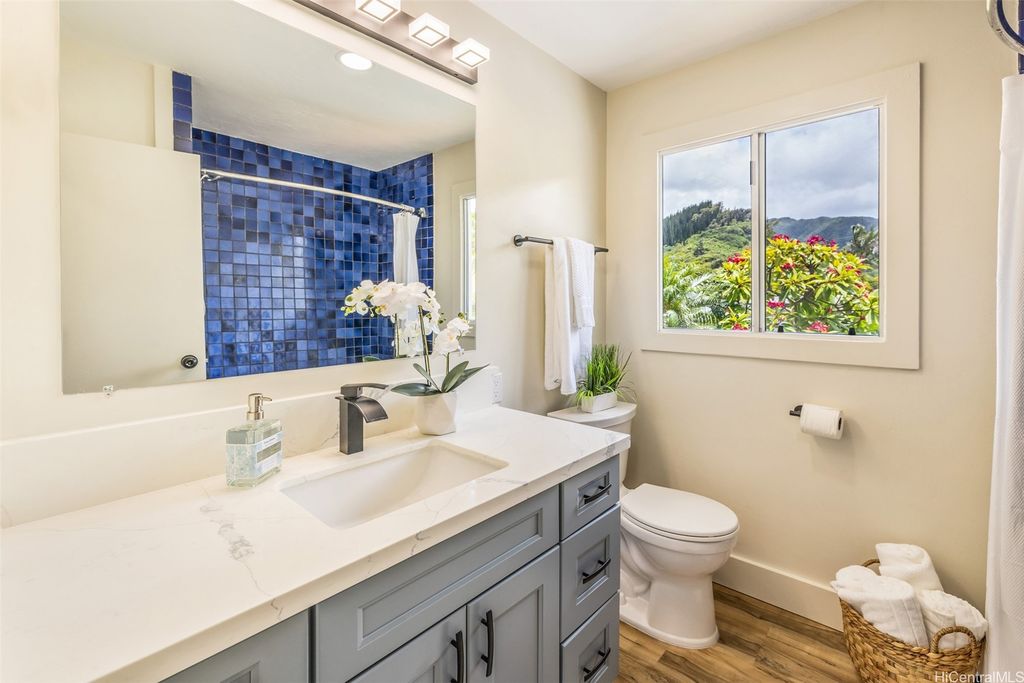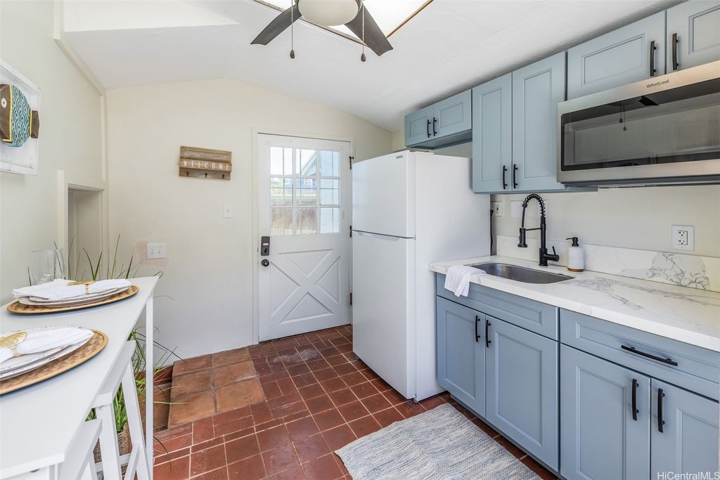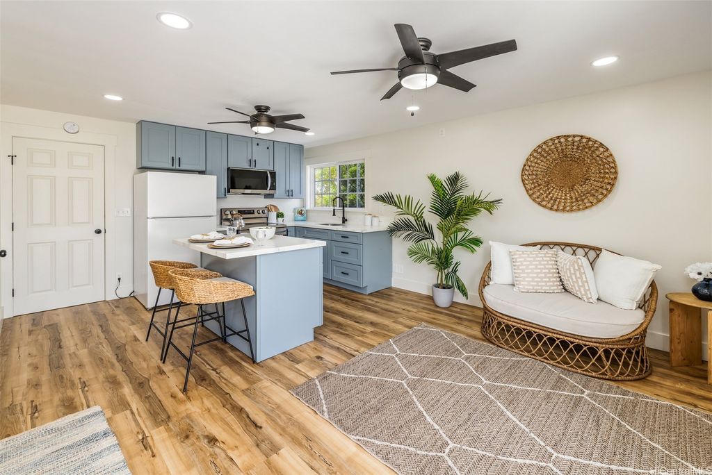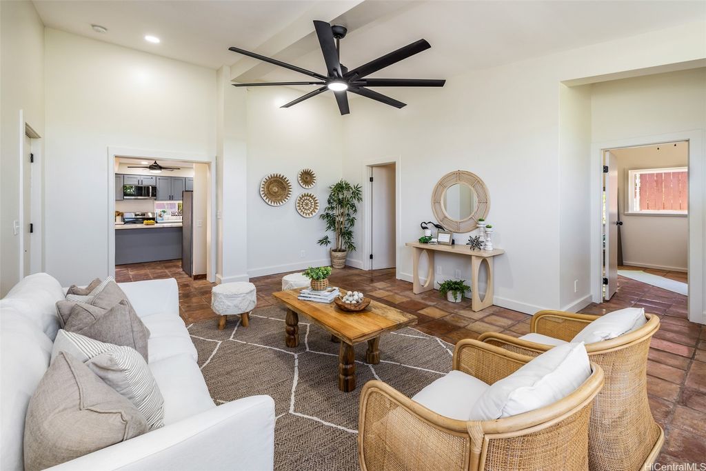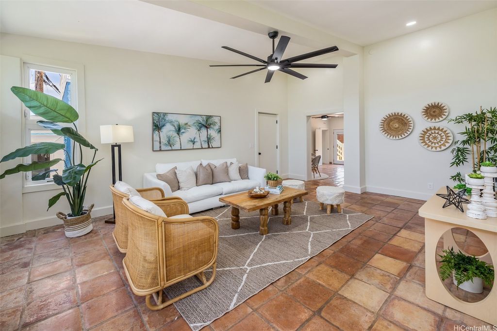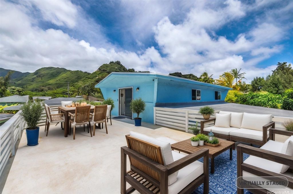 More Space. More Flexibility. More Hawai"˜i Life. Tucked away at the end of a quiet cul-de-sac in Hau'ula, this spacious 2,335 sq ft 2-story home offers a flexible layout ideal for multi-gen living or rental income. With 3 distinct living areas, there's room for 'ohana, guests, or work-from-home needs. Fresh interior paint, updated kitchens and baths, and thoughtfully designed spaces add to the appeal. The main home features 3 bed, 2 baths, and a large bonus room (staged as a 4th bedroom). The kitchen has beautiful blue cabinets, white quartz countertops, new appliances, and flows into the bright living area with tall ceilings and natural light. Downstairs, a mother-in-law suite with wet bar offers privacy or rental potential. Upstairs, a studio apartment includes a full kitchen and an oversized lanai with mountain views and peekaboo ocean views"”perfect for entertaining or unwinding. Two-car enclosed garage with workshop bay. Just 0.6 miles to Hau'ula Beach Park and close to Pounders Beach, Hau'ula Loop Trail, and everyday essentials. A short drive brings you to BYU-Hawai"˜i, the Polynesian Cultural Center, Turtle Bay Resort, and the North Shore's world-famous beaches.