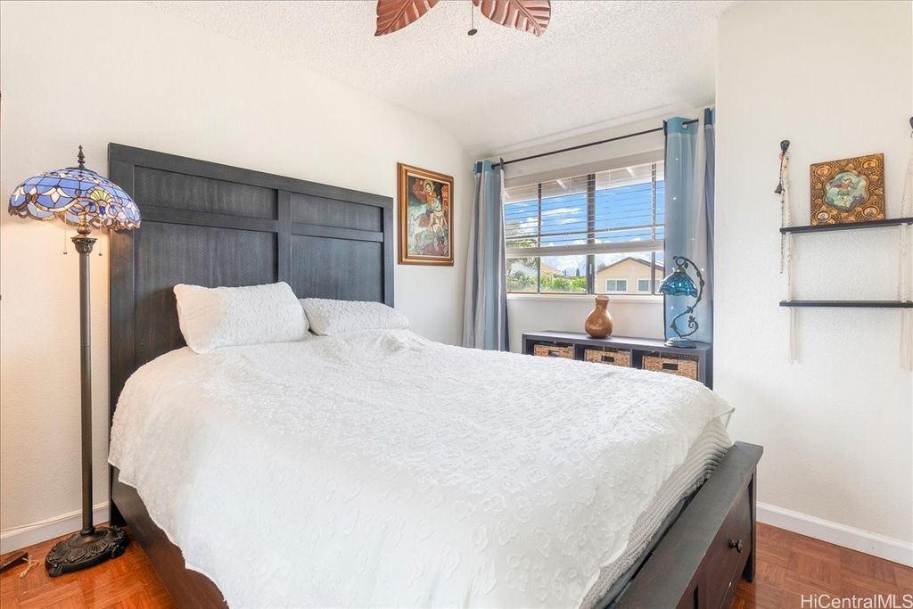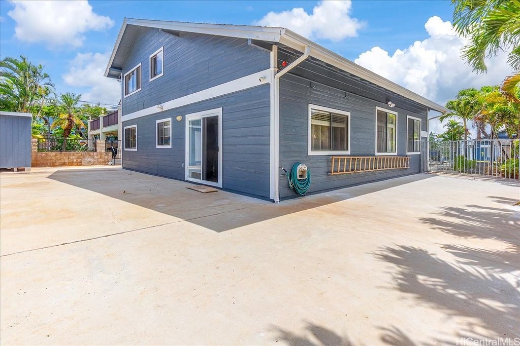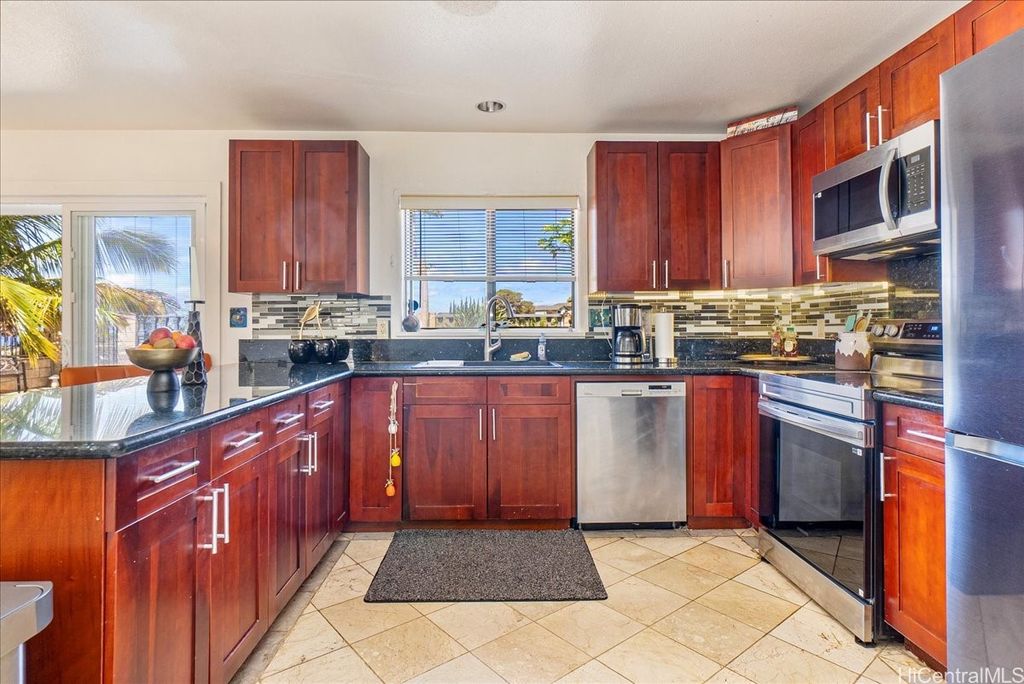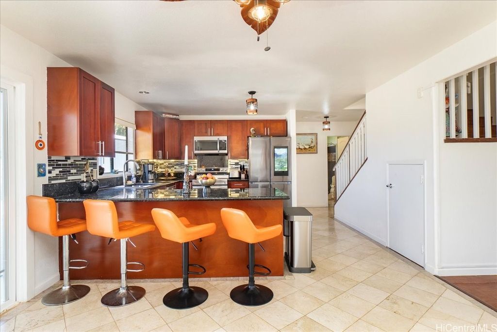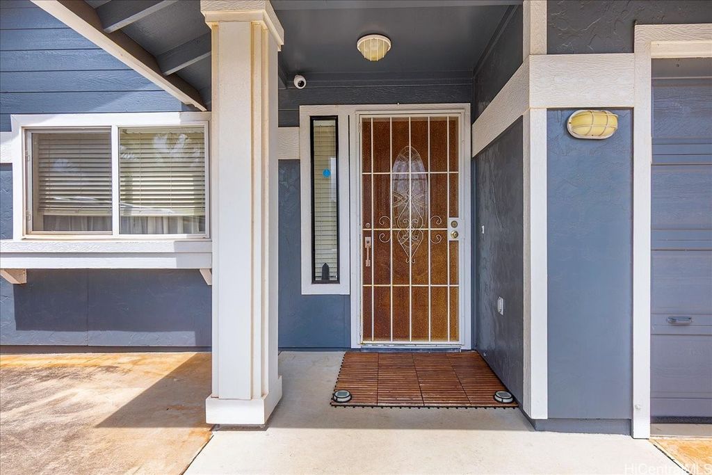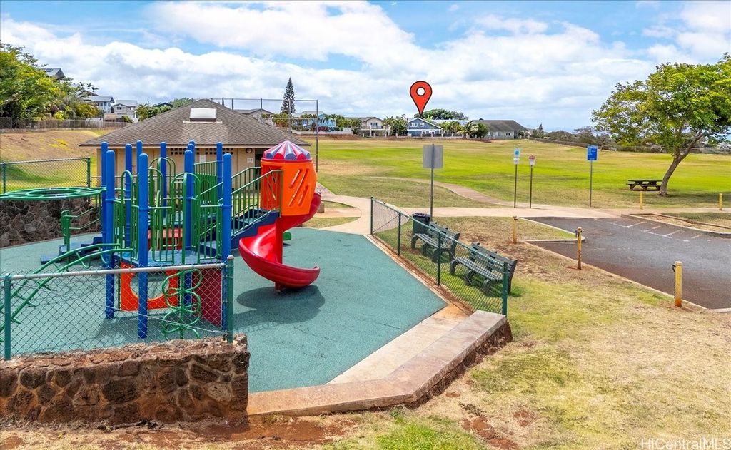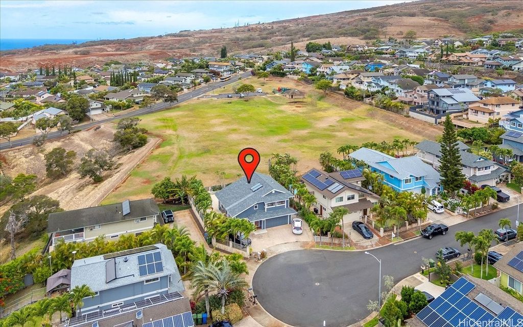 No Rear Neighbors! Beautifully renovated West Hills 4-bedroom, 3-bath home with attached 2-car garage, ideally located at the end of a quiet cul-de-sac overlooking Makakilo Heights Neighborhood Park. Versatile floor plan includes a downstairs bedroom and full bath perfect for guests or in-laws. Bright, open-concept living and dining areas flow seamlessly to a private backyard for ideal indoor-outdoor living. Enjoy cool Makakilo breezes that help keep energy costs low. Updated kitchen features newer stainless steel appliances, solid surface countertops, and stylish tiled backsplash. Upstairs offers 3 additional bedrooms, including a spacious primary suite with walk-in closet, dual vanities, and a renovated walk-in shower. All bathrooms have been updated! Garage is currently converted into an additional room (easily converted back), and the oversized driveway accommodates up to 6 cars. Conveniently located near H-1, Kapolei shopping, dining, and Ko Olina beaches. Low HOA under $10 month. Move-in ready with endless potential!