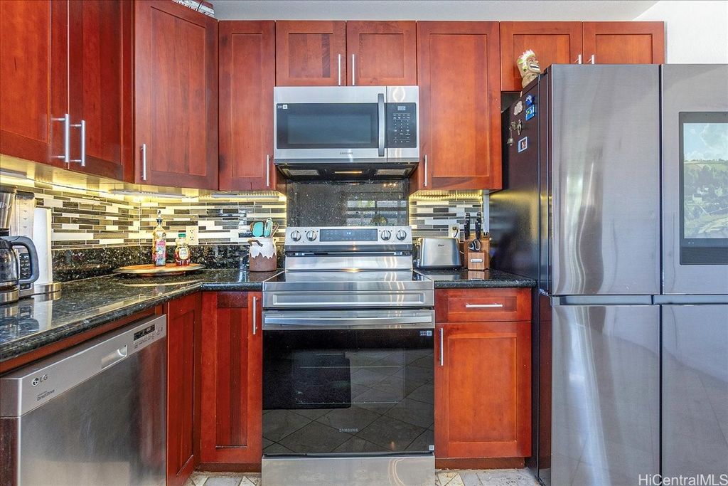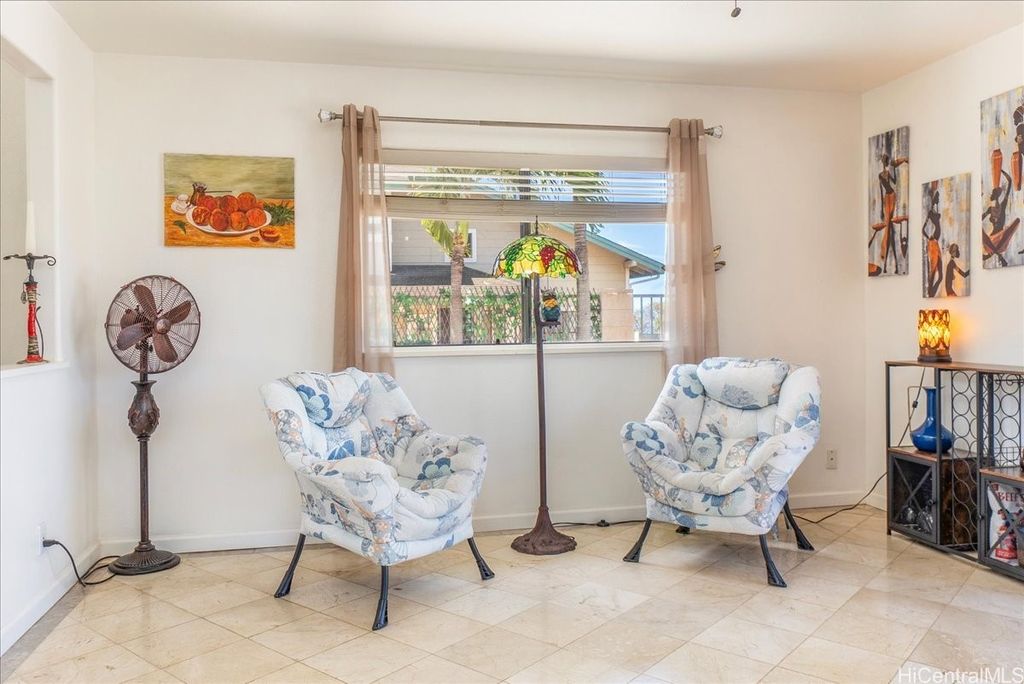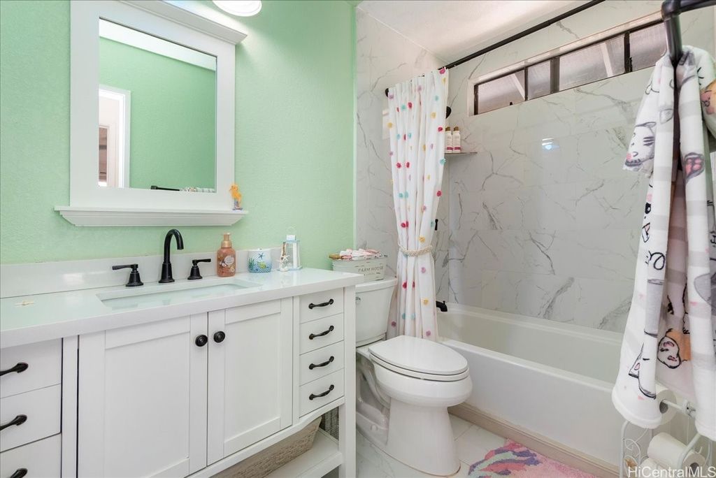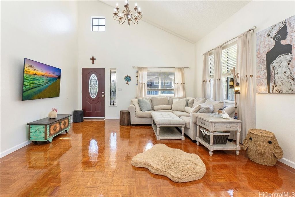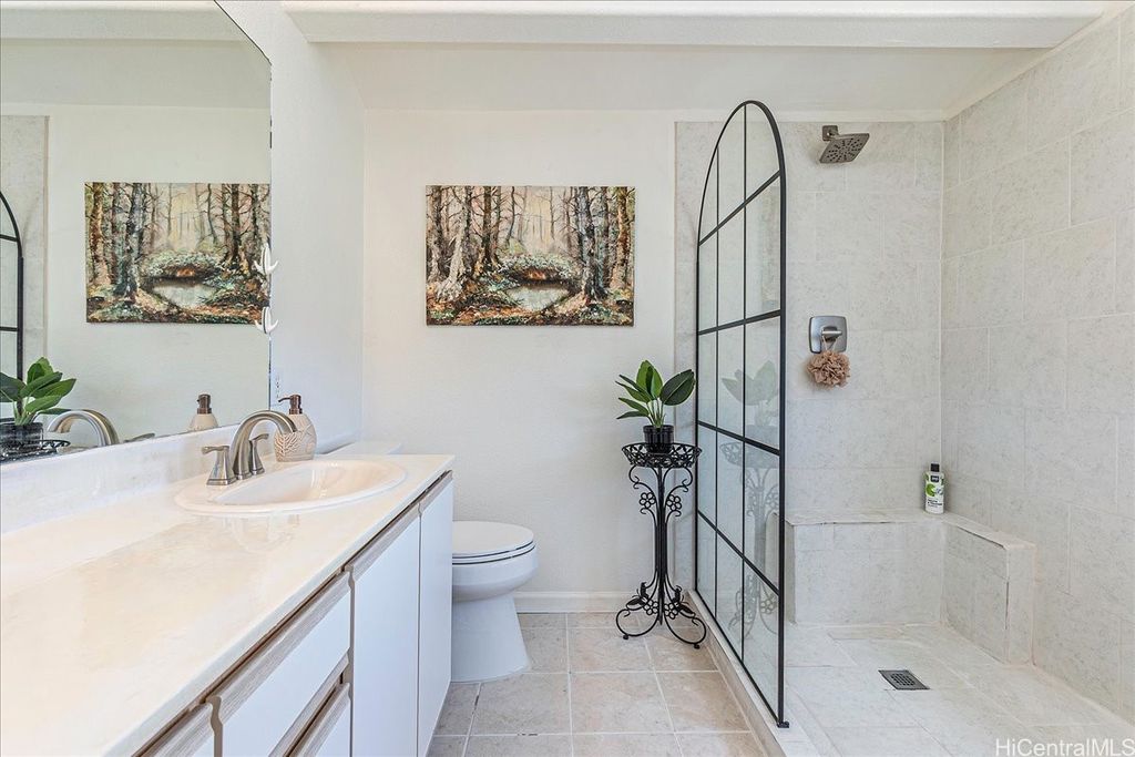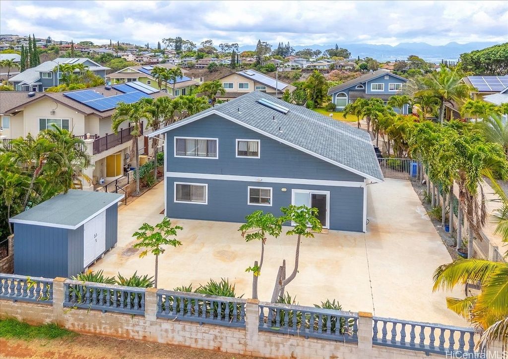 No Rear Neighbors! Beautifully renovated West Hills 4-bedroom, 3-bath home with attached 2-car garage, ideally located at the end of a quiet cul-de-sac overlooking Makakilo Heights Neighborhood Park. Versatile floor plan includes a downstairs bedroom and full bath perfect for guests or in-laws. Bright, open-concept living and dining areas flow seamlessly to a private backyard for ideal indoor-outdoor living. Enjoy cool Makakilo breezes that help keep energy costs low. Updated kitchen features newer stainless steel appliances, solid surface countertops, and stylish tiled backsplash. Upstairs offers 3 additional bedrooms, including a spacious primary suite with walk-in closet, dual vanities, and a renovated walk-in shower. All bathrooms have been updated! Garage is currently converted into an additional room (easily converted back), and the oversized driveway accommodates up to 6 cars. Conveniently located near H-1, Kapolei shopping, dining, and Ko Olina beaches. Low HOA under $10 month. Move-in ready with endless potential!