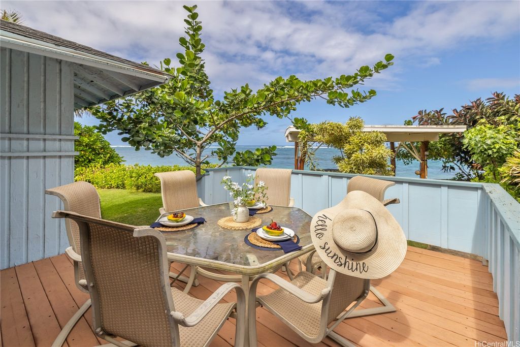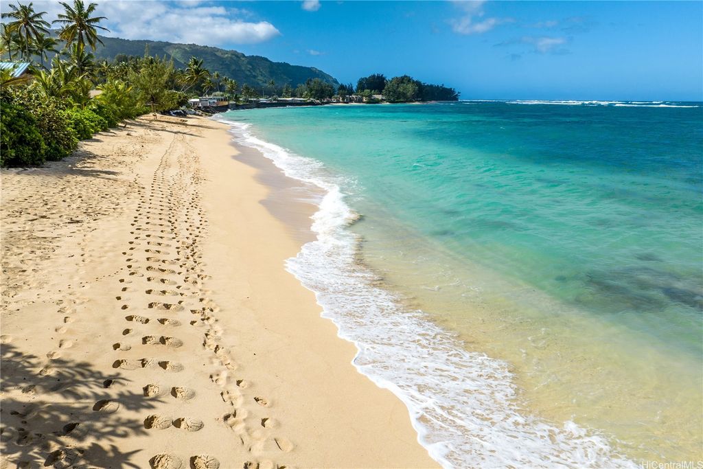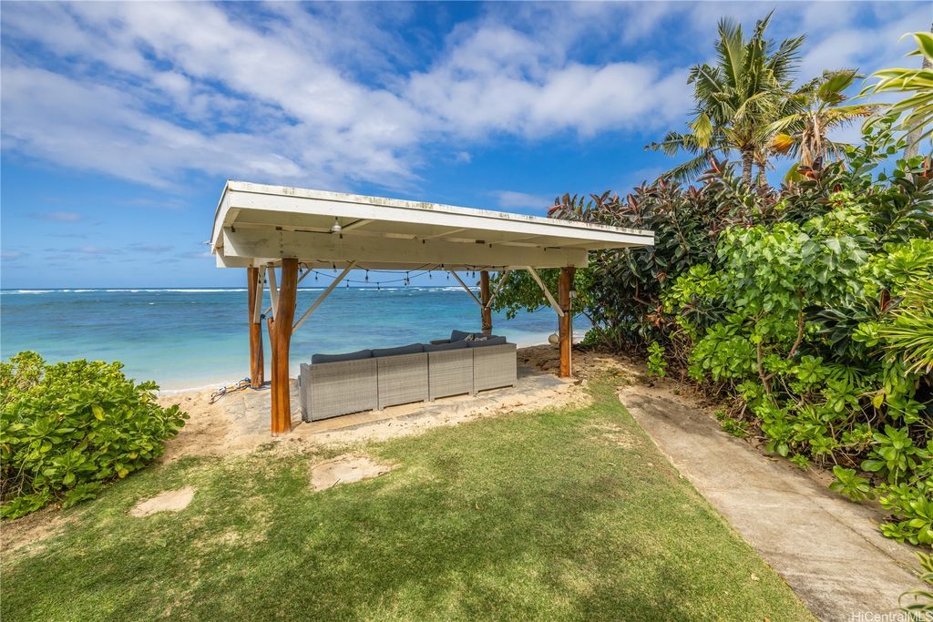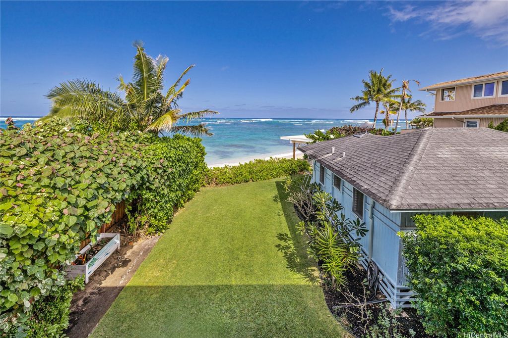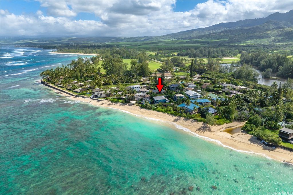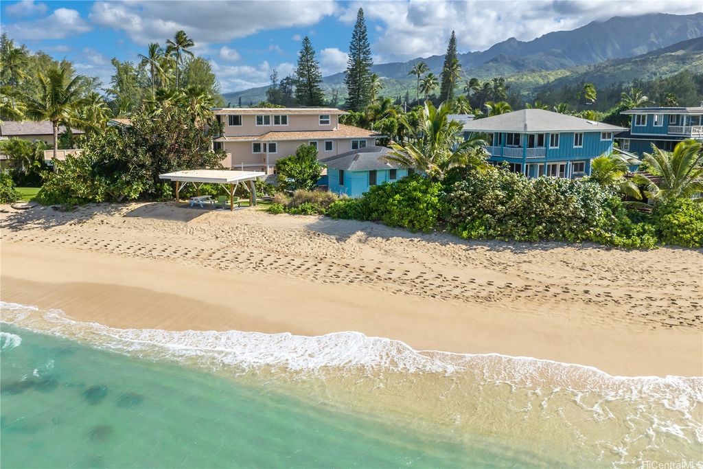 Breathtaking ocean views with white sandy beaches and captivating sunsets showcase paradisical island living along one of Oahu's finest coastline stretches. This stunning 6 bedroom, 5 bathroom home; nestled amidst gorgeous tropical vegetation with the peace and tranquility of a cul de sac, is a Homeowners dream. With a blend of classic and local charm, the main house open floor plan offers effortless transitioning between the living spaces and out on to the wrap around lanai. Favorably elevated on the 2nd floor, the Primary bedroom, with en-suite bathroom, opens up on to a 200 sqft lanai with mesmerizing ocean views and cool windward breezes. 2 additional bedrooms with en-suite bathrooms complete the upper living area. Downstairs hosts a 1 bedroom/1 bathroom with a quaint office space. With its own privacy and serenity, a charming 2 bedroom/1 bathroom beachfront cottage is perfect for visiting family and friends or as a long term rental unit. The epitome of coastal living is enveloped in a layer of old Hawaii to bring you the reset you have been searching for. Close to Haliewa, prominent local eateries, surfing spots, with easy access to Costco, Walmart, Honolulu and the airport.