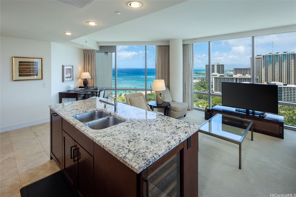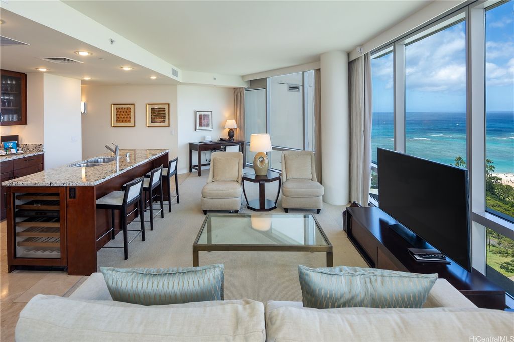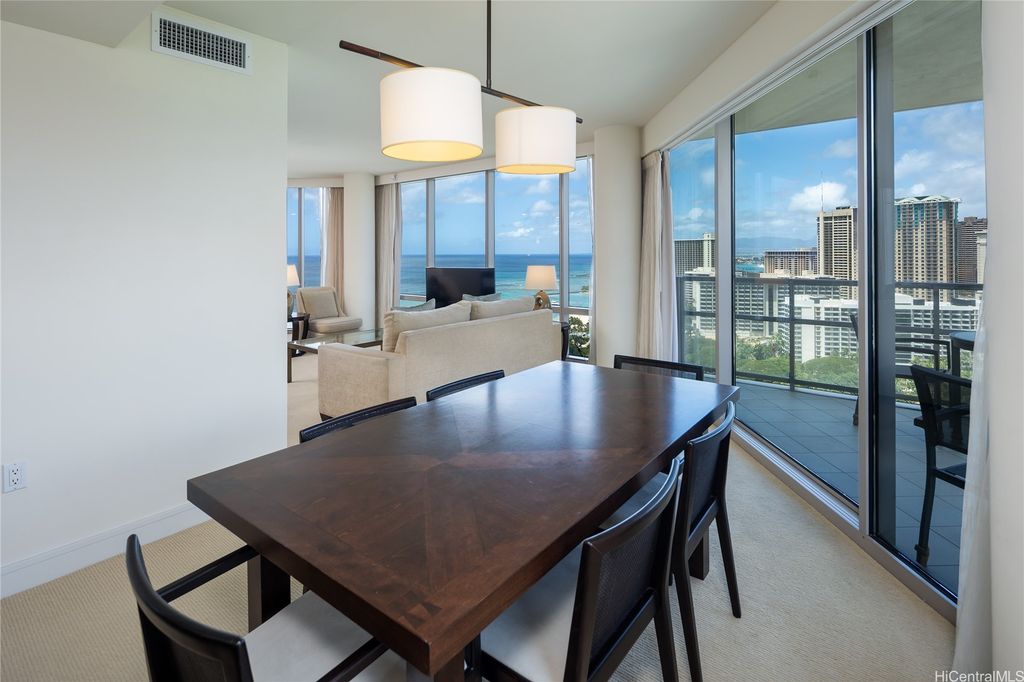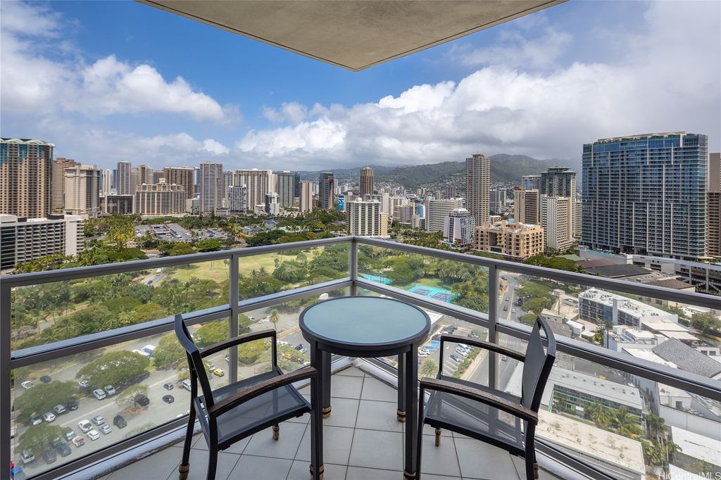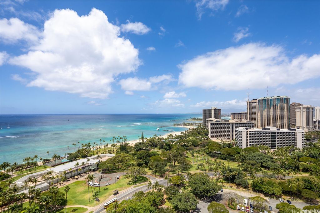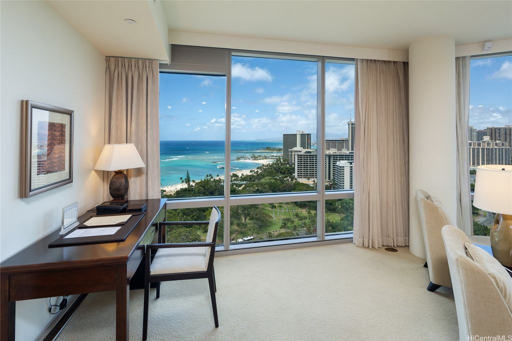 Welcome to paradise living at its finest in this spacious and luxurious 2-bedroom, 2-bathroom suite located on the grand residence floor of Ka Lai Waikiki Beach (formerly Trump Tower). Perched on the corner-end, this exquisite unit offers an unparalleled 180-degree panorama, showcasing breathtaking views of the tranquil ocean, majestic mountains, captivating fireworks, enchanting sunsets, and the vibrant hues of city lights. Overlooking the serene Fort DeRussy Park and beautiful ocean, this haven spans 1,406 square feet of impeccably designed living space complemented by a 73-square-foot open lanai, perfect for indulging in the serene beauty of Waikiki.