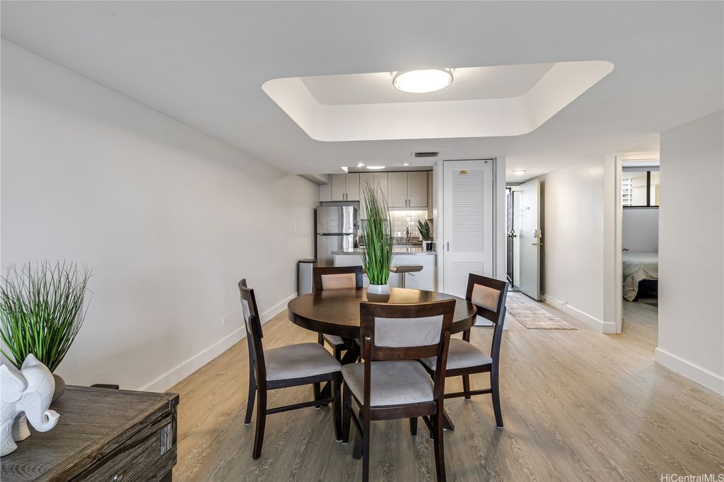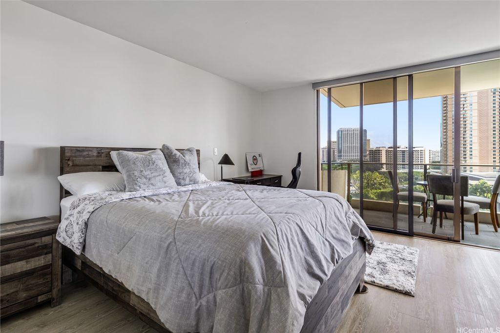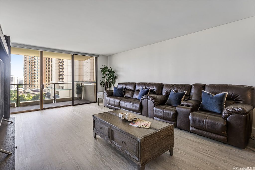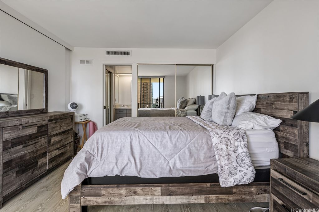 Exceptional Fee Simple 2/2 condo at Wailana at Waikiki! Discover luxury living in this beautifully remodeled condo, offering stunning city and Diamond Head views. The open and airy floor plan features elegant luxury vinyl plank flooring throughout, complemented by high-end Samsung and LG appliances. Enjoy Granite countertops in the kitchen and Quartz countertops with Limestone shower surrounds in both bathrooms. Custom blackout shades and a unique fiber optic cable installation ensure both comfort and connectivity. The well-thought-out design places bedrooms on opposite sides of the unit for added privacy and optimal cross-breezes. Located in a prime area near entertainment, beaches, parks, dining, and shopping. This condo also boasts the convenience of the Island Country Market with its deli and sushi bar located in the building's lobby. Additional features include two deeded storage units just outside your door and secured garage parking, making this a fantastic value!