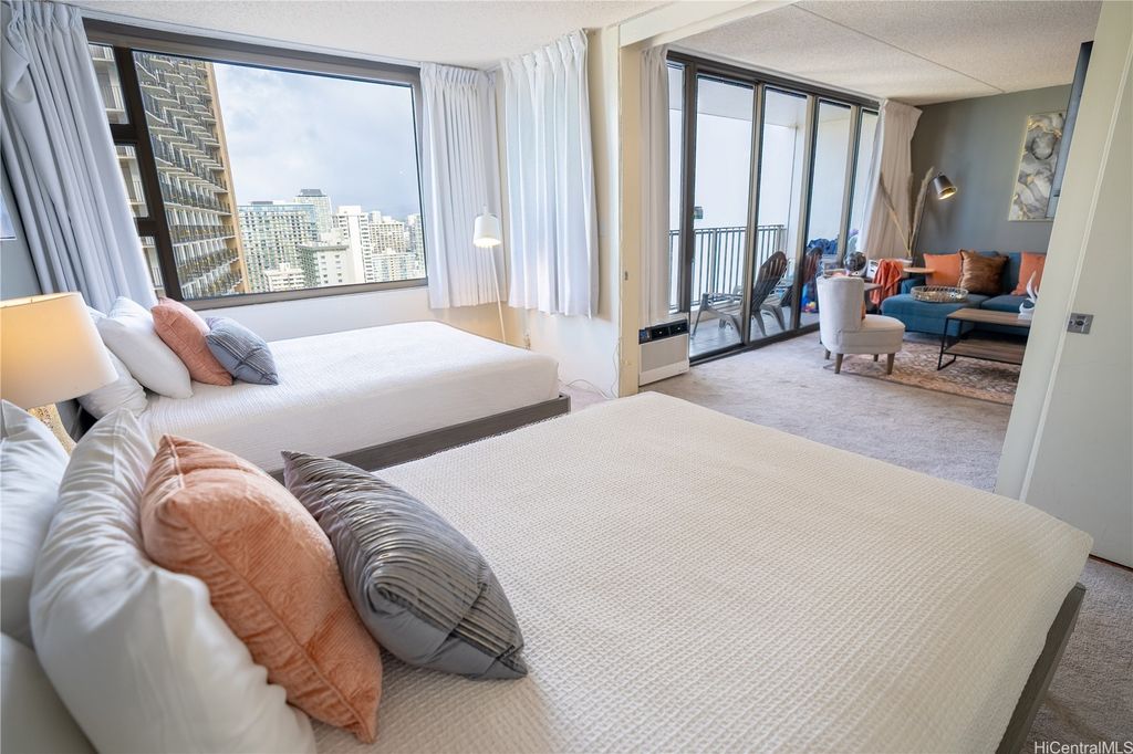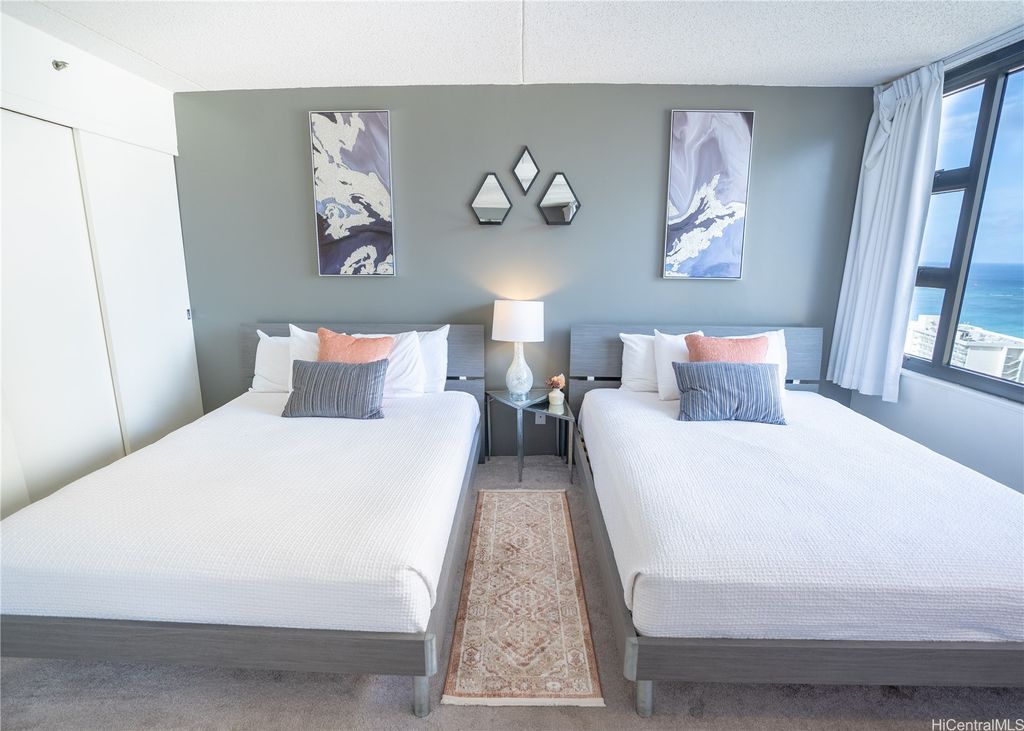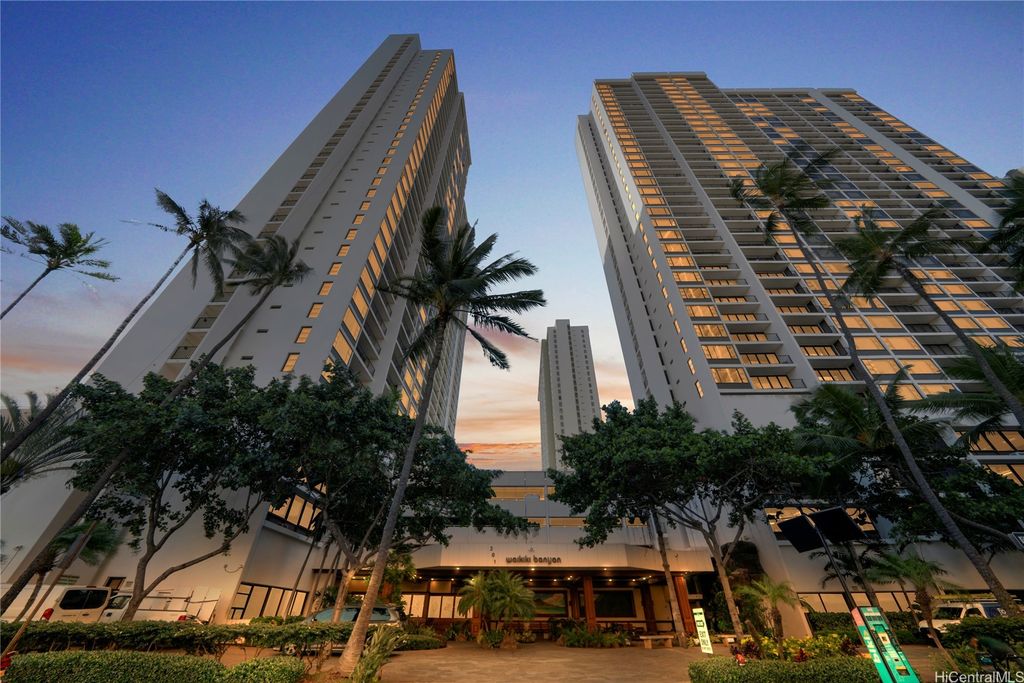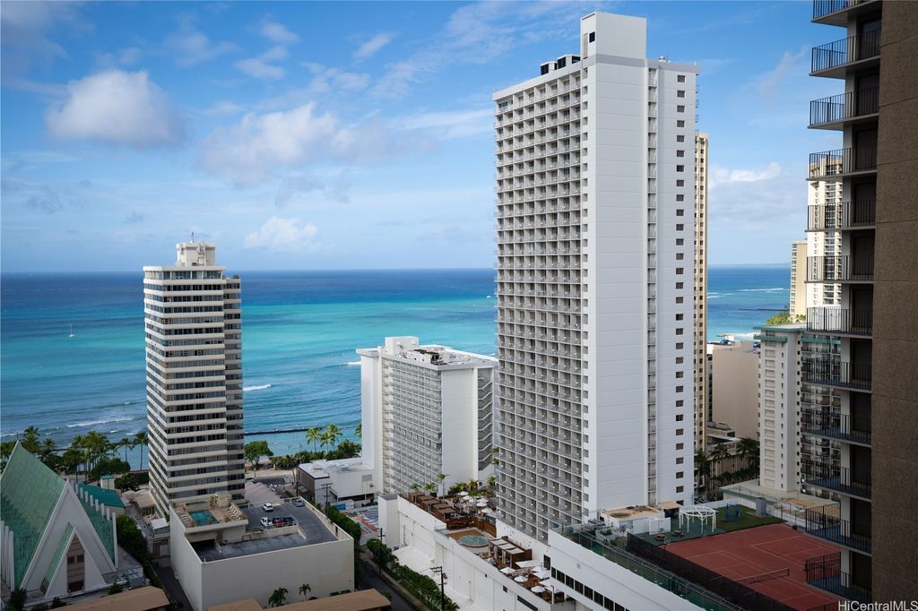 Experience the perfect blend of city and ocean views in this deluxe 28th-floor Waikiki Banyan condo, just a 5-minute walk from the famous Waikiki Beach. The spacious unit features two queen beds, a fully equipped kitchen with recently replaced appliances, upgraded bathroom with dual entry and a cozy living room with a lanai to take in breathtaking sunset views with parking included. All utilities and internet are included in the monthly dues. Enjoy access to a recreation deck with a pool, hot tubs, and BBQ grills, this property offers everything needed for a relaxing Hawaiian retreat. Enjoy the proximity to top-notch dining, shopping, and family-friendly attractions!