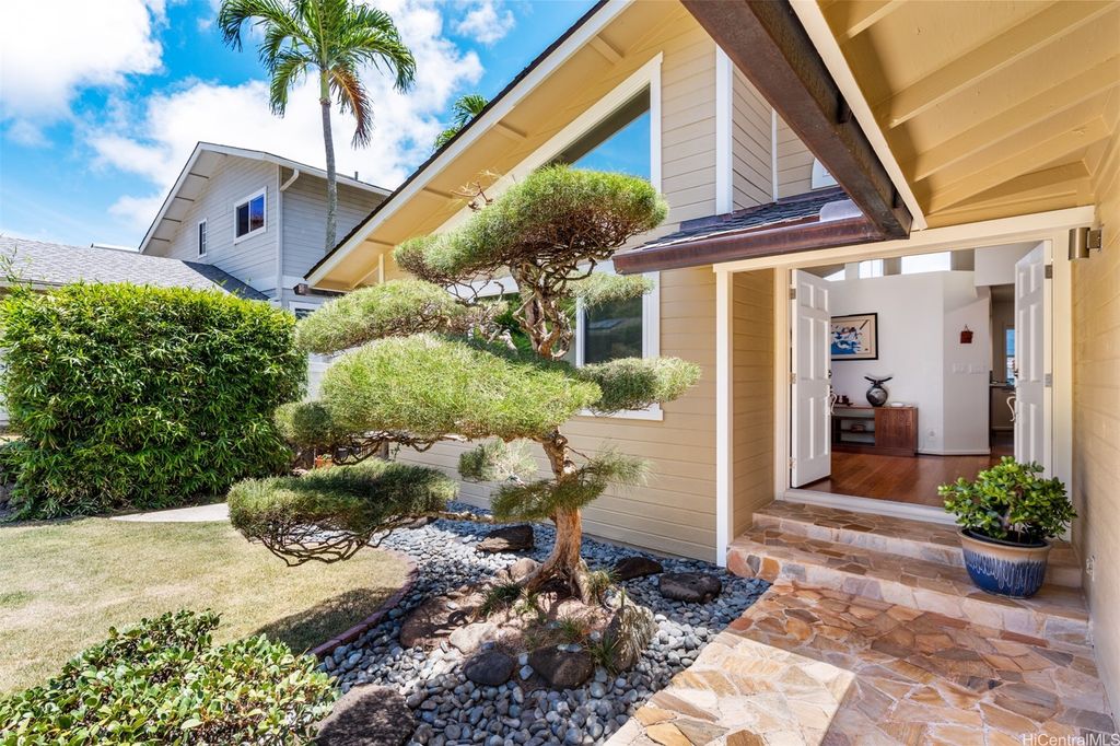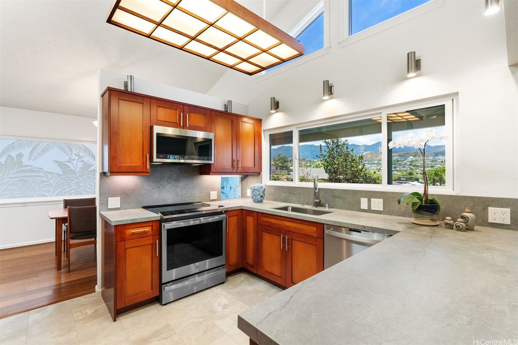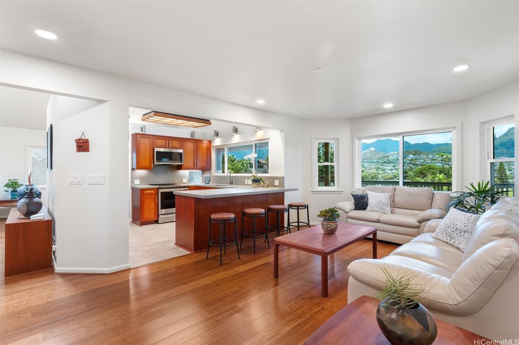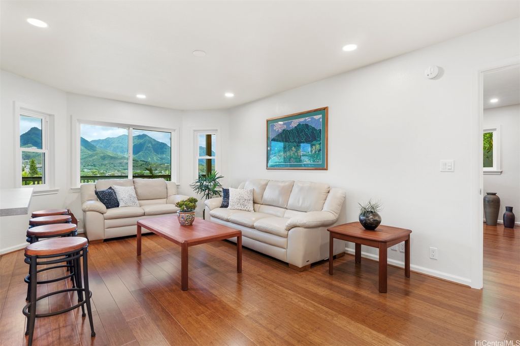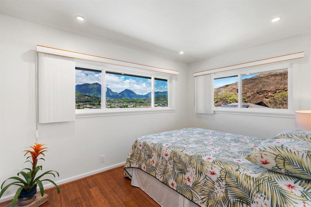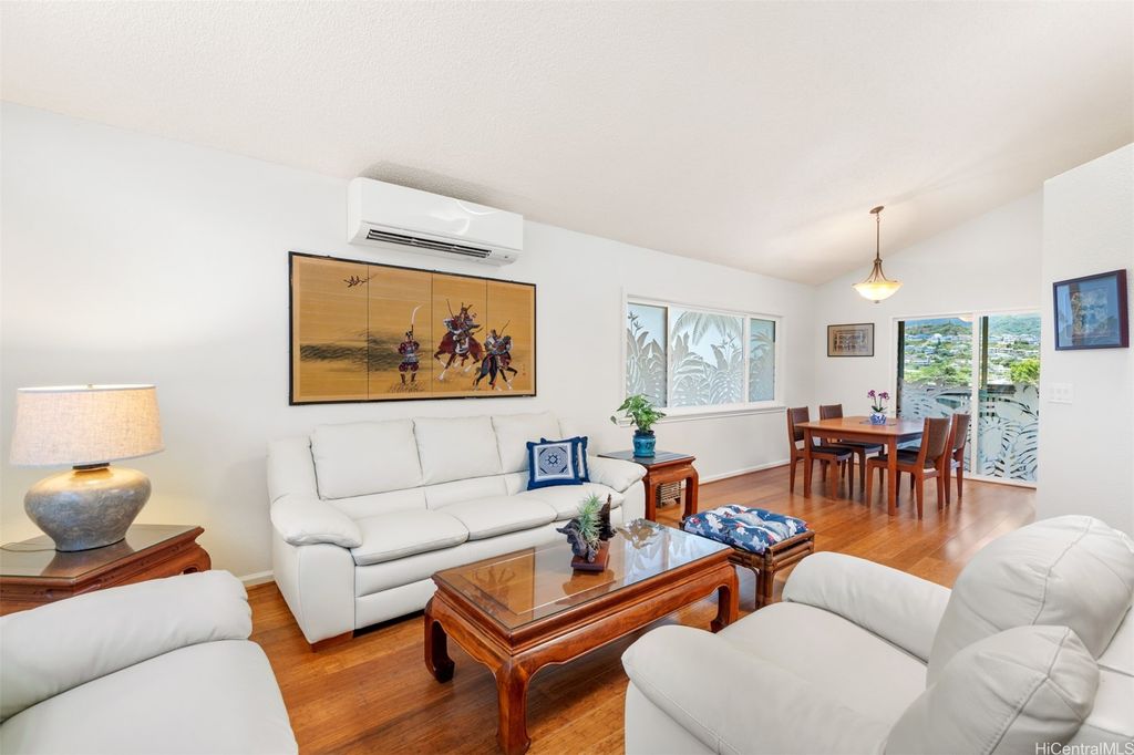 UNBELIEVABLE PRICE ADJUSTMENT!!! Meticulously Maintained 4-Bedroom Home with amazing Ko'olau Views! This beautifully appointed 4-bedroom, 2.5-bath home showcases panoramic views of the Ko'olau Mountains, elegant etched windows, and rich shredded bamboo flooring throughout. Soaring vaulted ceilings create an airy, inviting atmosphere, blending style and comfort seamlessly. Tucked away in a peaceful cul-de-sac, the property offers privacy and tranquility. Step into your own tropical oasis with dragon fruit, mango, tangerine, lime, grapefruit, guava and avocado trees flourishing in the backyard. A huge workshop and additional storage space provide ample room for hobbies, projects, or everyday needs. Stay cool year-round with split air conditioning units throughout, and enjoy energy efficiency with an owned PV system. The expansive covered lanai is perfect for relaxing or entertaining, offering a front-row seat to the stunning Ko'olau views"”ideal for morning coffee or evening sunsets. Furniture is negotiable, making this a truly move-in-ready opportunity you won't want to miss.