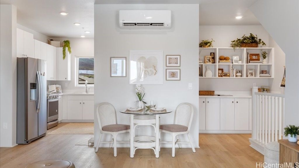This three story FLEX® 3 bedroom and 3.5 bathroom condominium consists of 1,497 square feet of net living area. When you step into this home, you will be greeted by an area that can be used as a live/work area that is designed for your entrepreneurial needs or a bedroom depending on your needs. You'll also enjoy the bathroom with a sink and combination tub and shower, as well as a walk-in closet. The separate entry to the home greets you to a staircase leading you into the living and dining area which flows seamlessly into the kitchen, featuring stainless steel appliances and white soft-close cabinets. On the third floor, you'll find the primary bedroom with a walk-in closet and ensuite bathroom with a double vanity and separate walk-in shower and water closet. Down the hall is the secondary bedroom with a generously sized closet and mirrored sliding doors. This bedroom has an additional ensuite bathroom that includes a combination bathtub and shower. Attached to this home is a single-car garage. Split air conditioning and modern appliances including a range/oven, micro-hood, dishwasher, refrigerator, and washer/dryer allow for ease of living.
