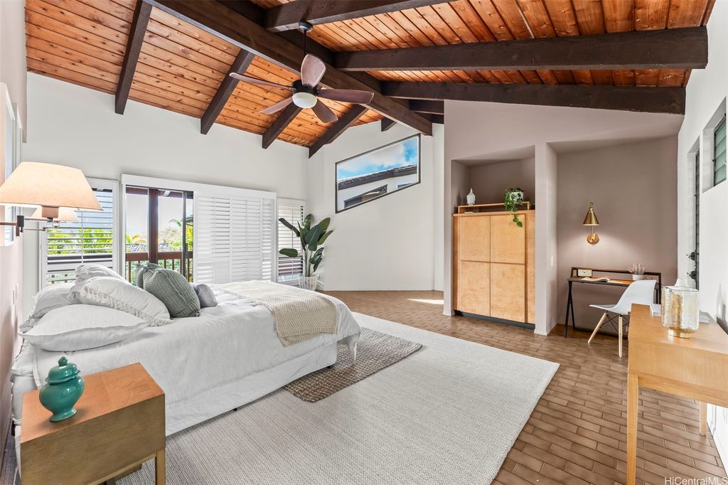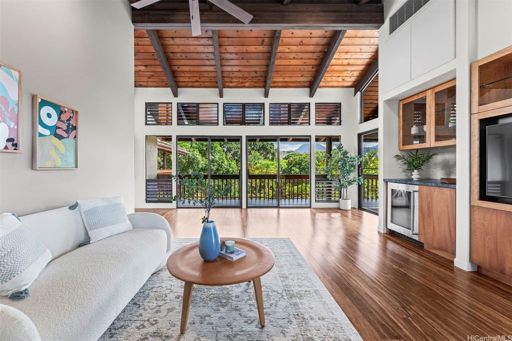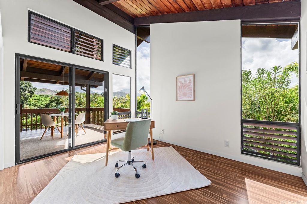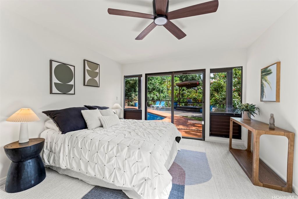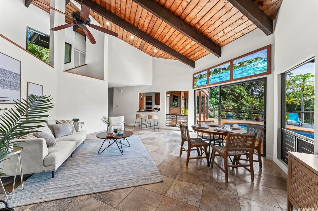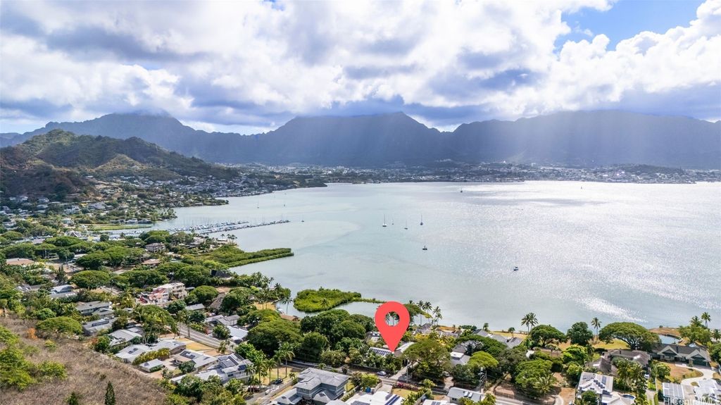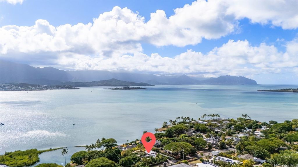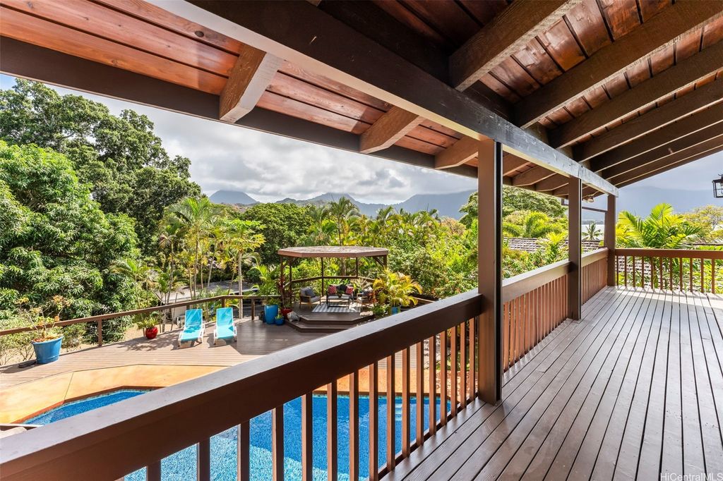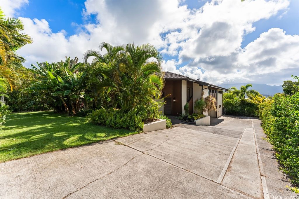This unique mid-century inspired home, designed by local architect Fritz Johnson and completed in 1981, offers a truly special living experience. Inside, you'll find two inviting living areas"”one adjacent to the kitchen with direct access to the pool area, and another upstairs with a lanai with views of Kaneohe Bay. The spacious primary suite also features its own private lanai with Bay views. In total, the home offers four bedrooms, including one completely separate from the main house with a full bath and private entrance"”ideal for guests or extended family. The lush yard is a tropical haven, featuring avocado, calamansi, and banana trees. A sparkling pool and hot tub provide endless enjoyment, whether for family fun or unwinding at the end of the day. A charming gazebo creates the perfect spot to relax with a book or share conversations with a friend. This property presents a rare opportunity to own a private retreat distinguished by architectural character, natural beauty, and exceptional livability.