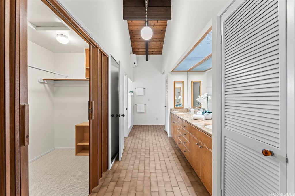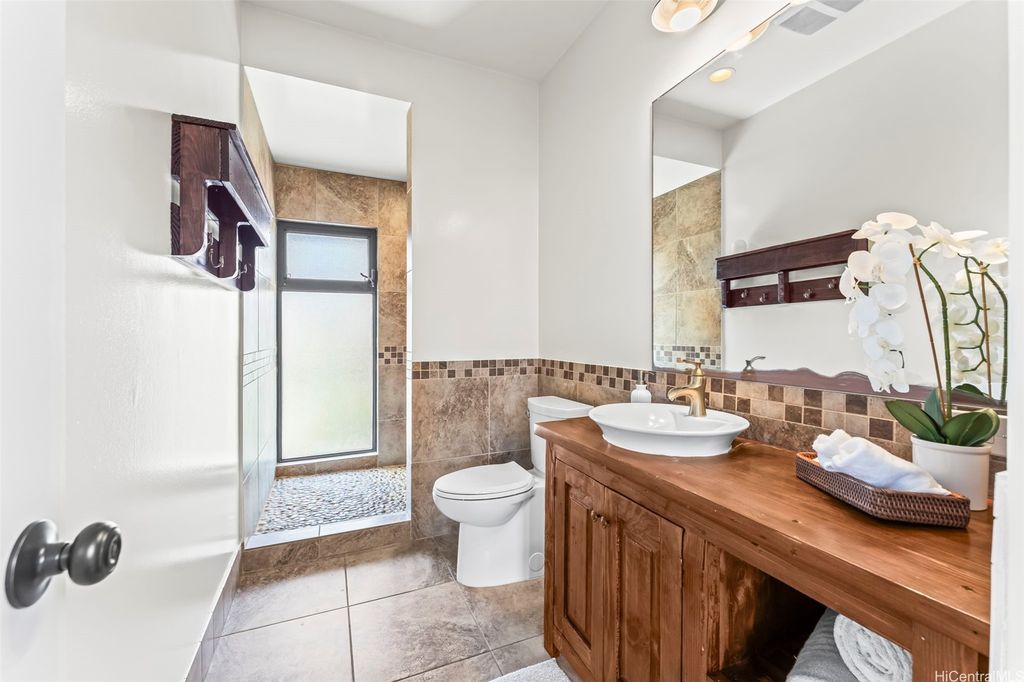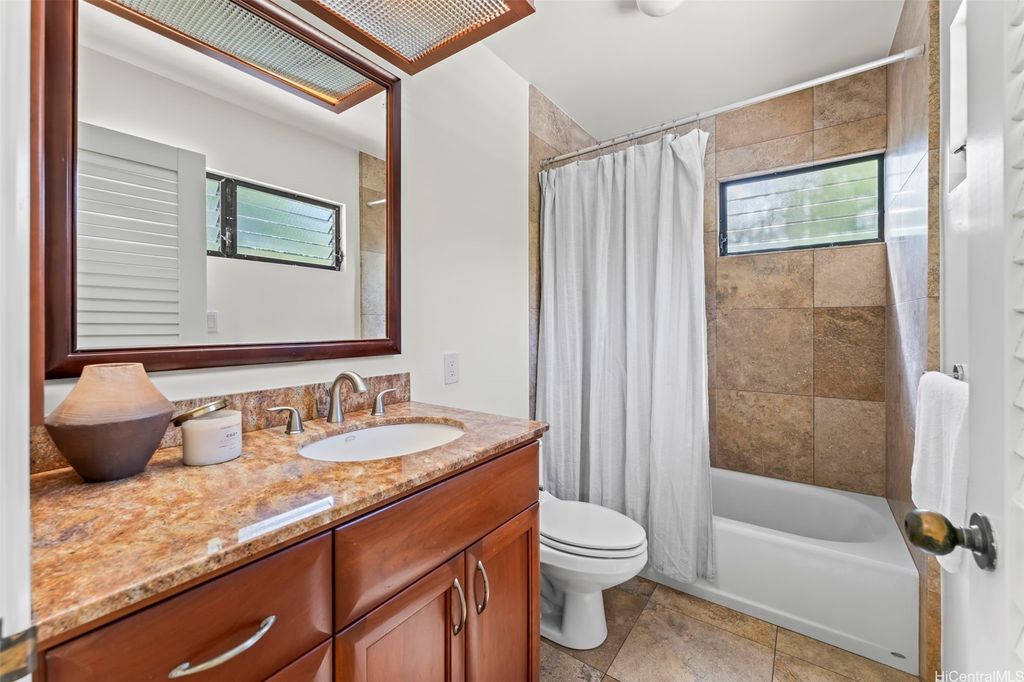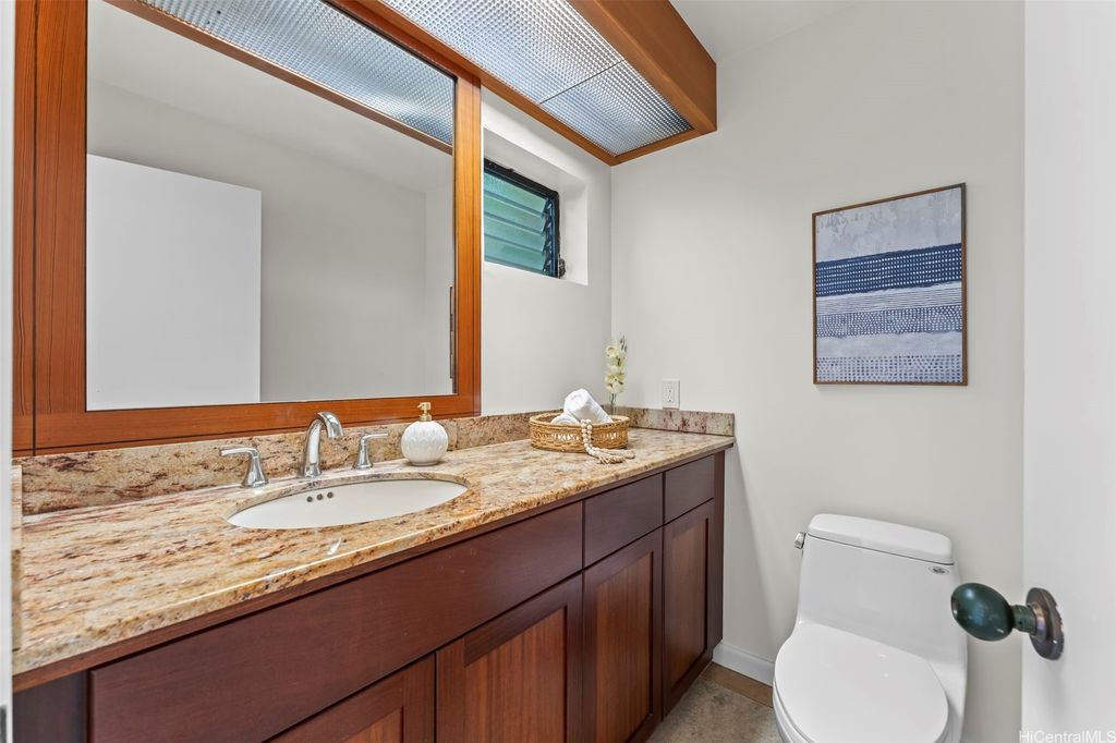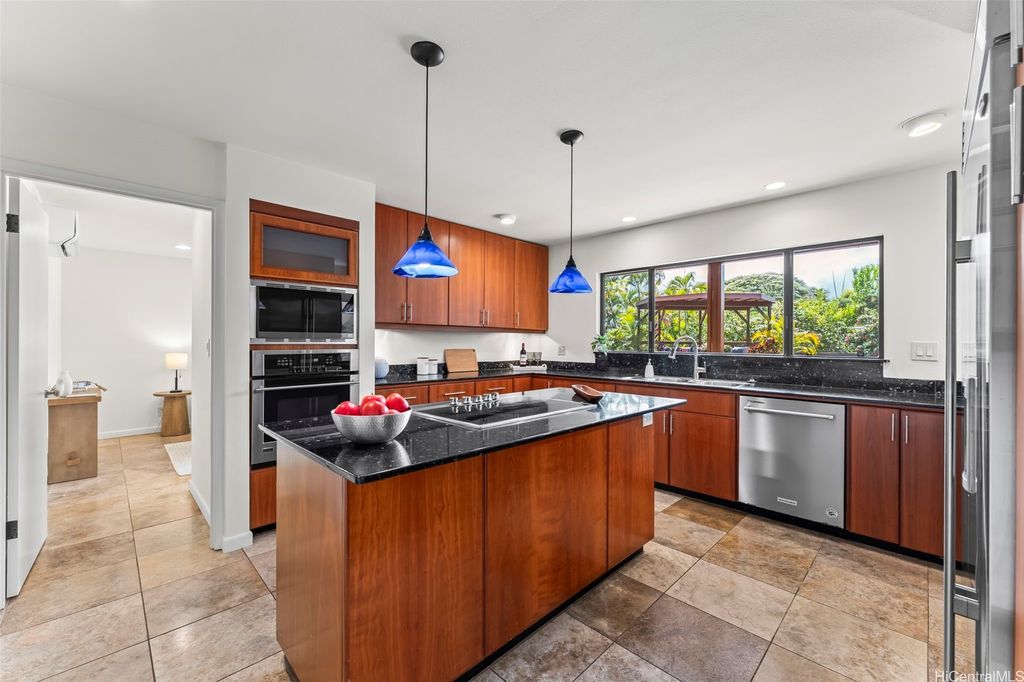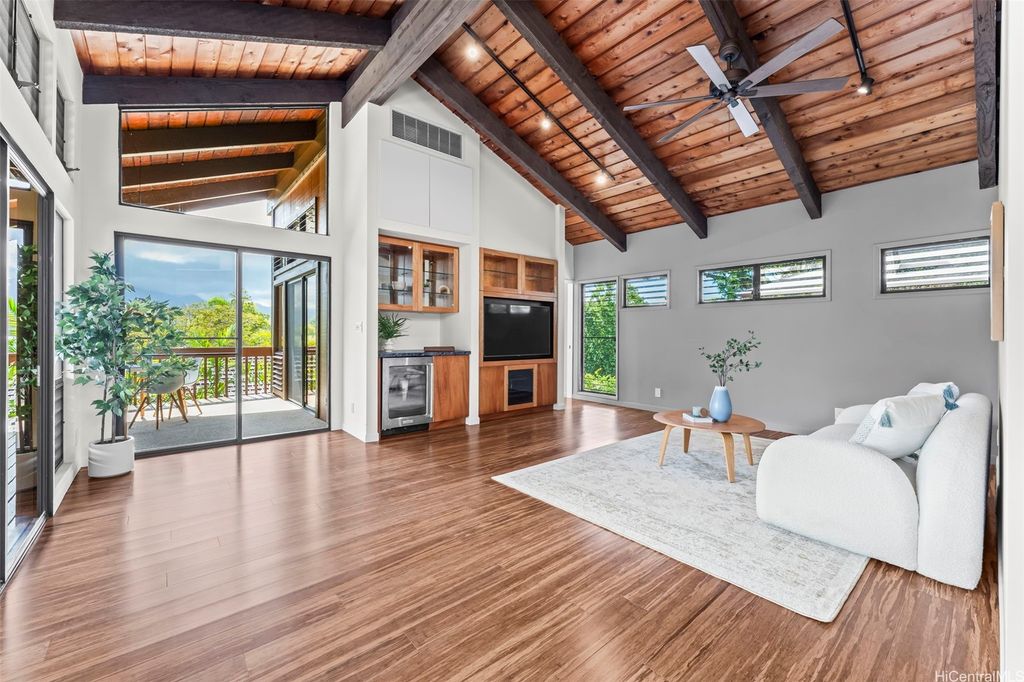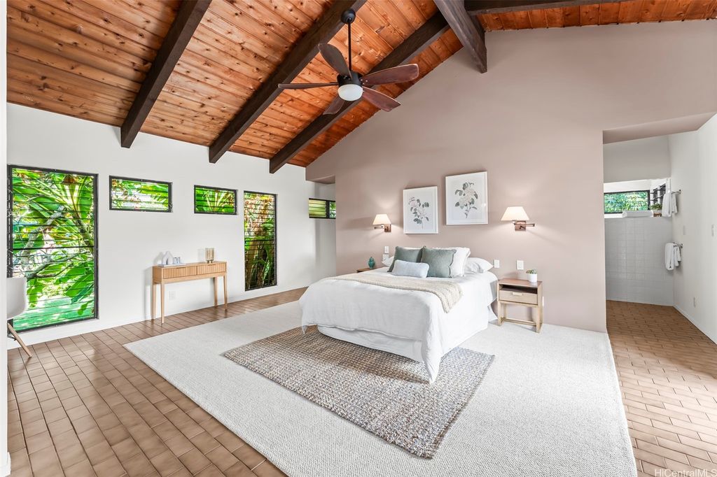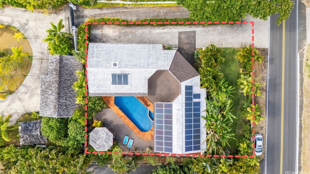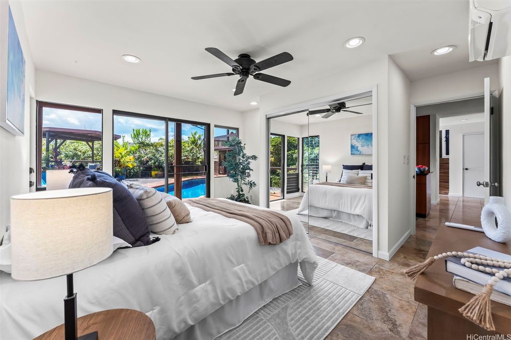 This unique mid-century inspired home, designed by local architect Fritz Johnson and completed in 1981, offers a truly special living experience. Inside, you'll find two inviting living areas"”one adjacent to the kitchen with direct access to the pool area, and another upstairs with a lanai with views of Kaneohe Bay. The spacious primary suite also features its own private lanai with Bay views. In total, the home offers four bedrooms, including one completely separate from the main house with a full bath and private entrance"”ideal for guests or extended family. The lush yard is a tropical haven, featuring avocado, calamansi, and banana trees. A sparkling pool and hot tub provide endless enjoyment, whether for family fun or unwinding at the end of the day. A charming gazebo creates the perfect spot to relax with a book or share conversations with a friend. This property presents a rare opportunity to own a private retreat distinguished by architectural character, natural beauty, and exceptional livability.