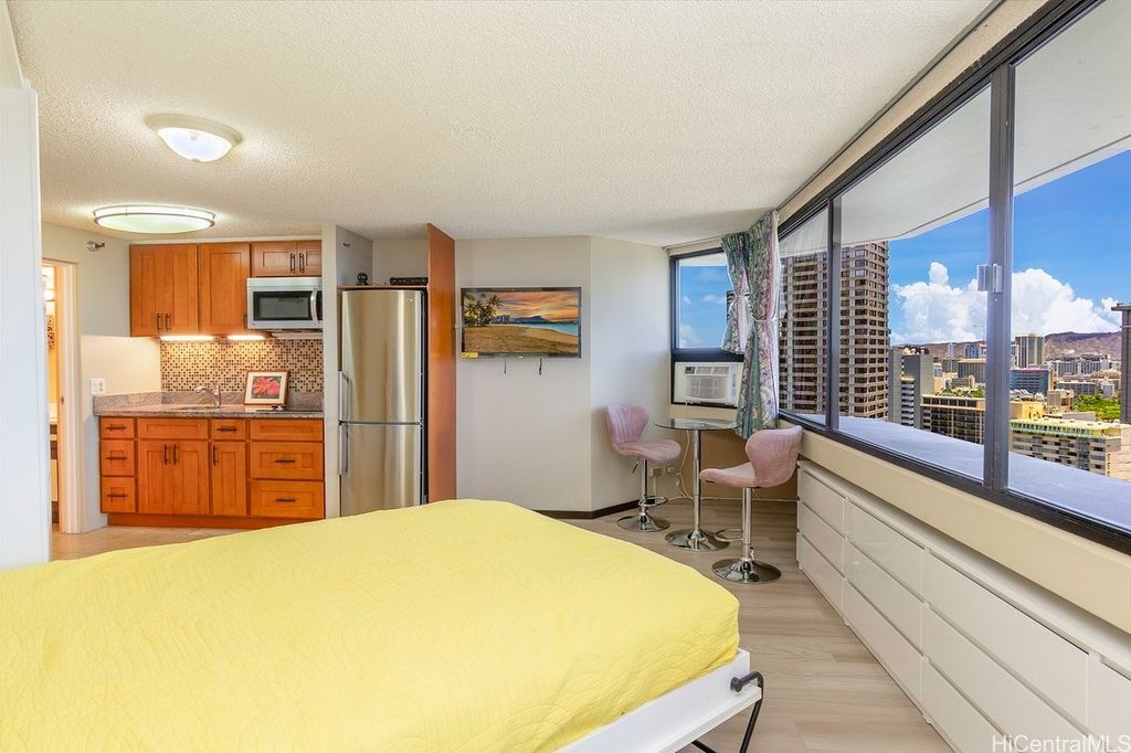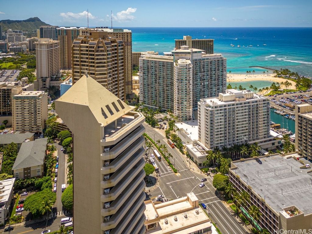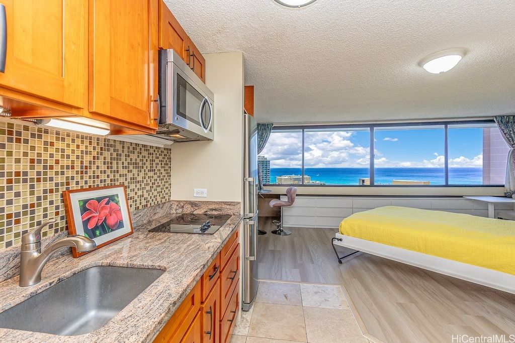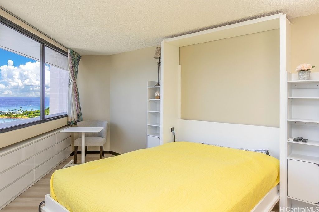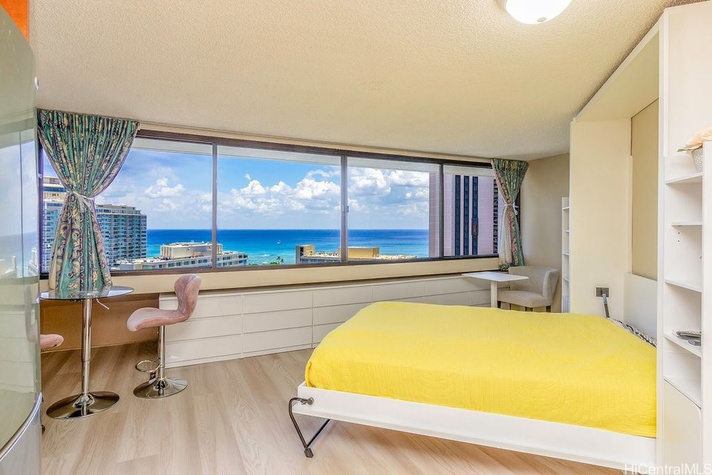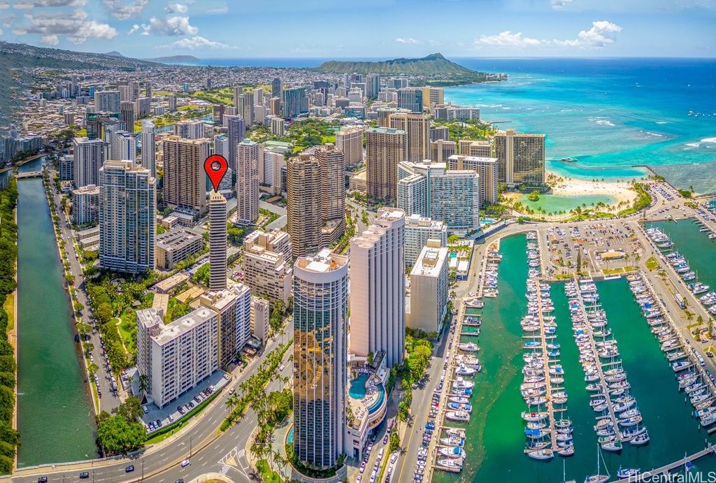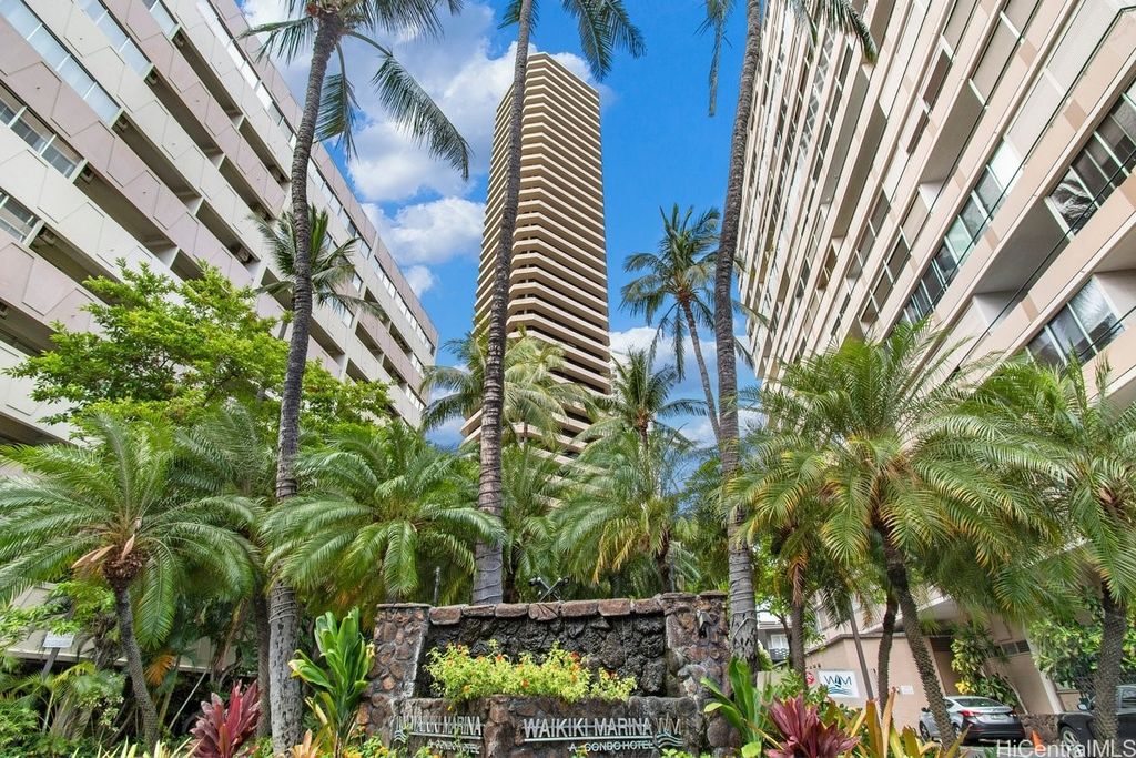Indulge in breathtaking panoramic views of the ocean, marina, sunsets, and Friday night fireworks from this beautiful Ocean View high-floor studio at Waikiki Marina Condominium. Steps from world-famous beaches, this immaculate, turnkey retreat features sleek appliances, a space-saving Murphy bed, generous built-in storage, and a rare covered parking stall. Picture windows flood the space with natural light and perfectly frame the sparkling turquoise coastline. Resort-style amenities include a pool, jacuzzi, tennis court, BBQ area, and secured entry. With all utilities included in the maintenance fee and an unbeatable location near Ala Moana Shopping Center, fine dining, and entertainment, this ocean-view gem is a rare find in the heart of Waikiki.